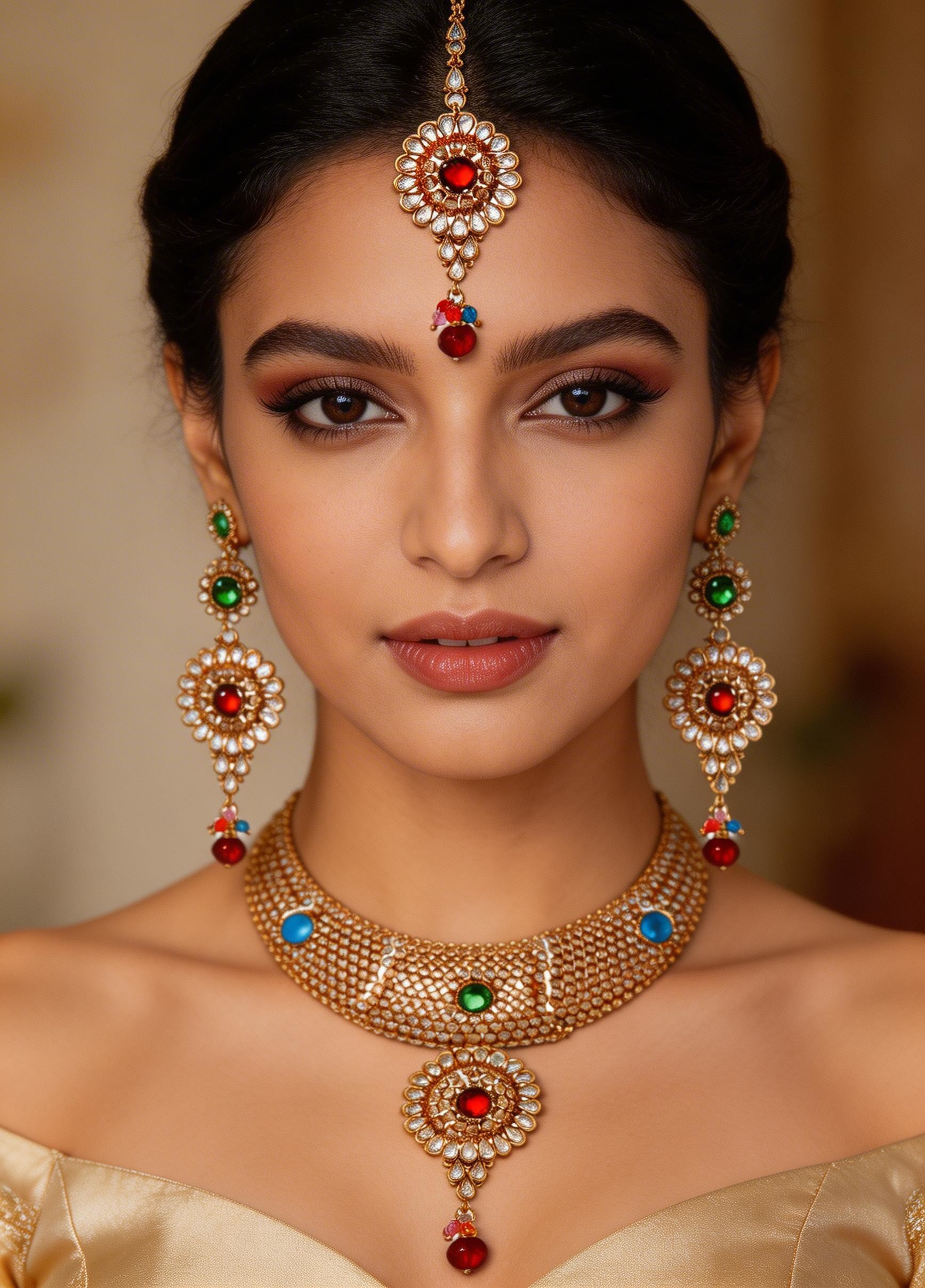 This style draws inspiration from the rich heritage of traditional Indian jewelry, particularly the Polki technique known for its uncut diamonds. While this creation features precision-cut glass, it embodies the same spirit of grandeur and cultural significance. It connects you to a lineage of opulence, making it a perfect choice for celebrating significant cultural events and milestones.