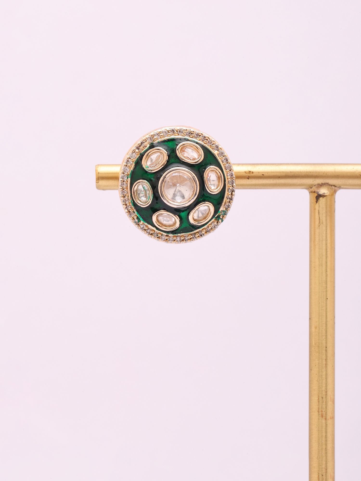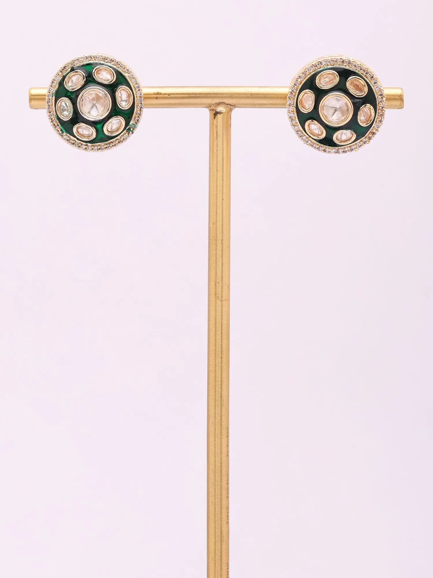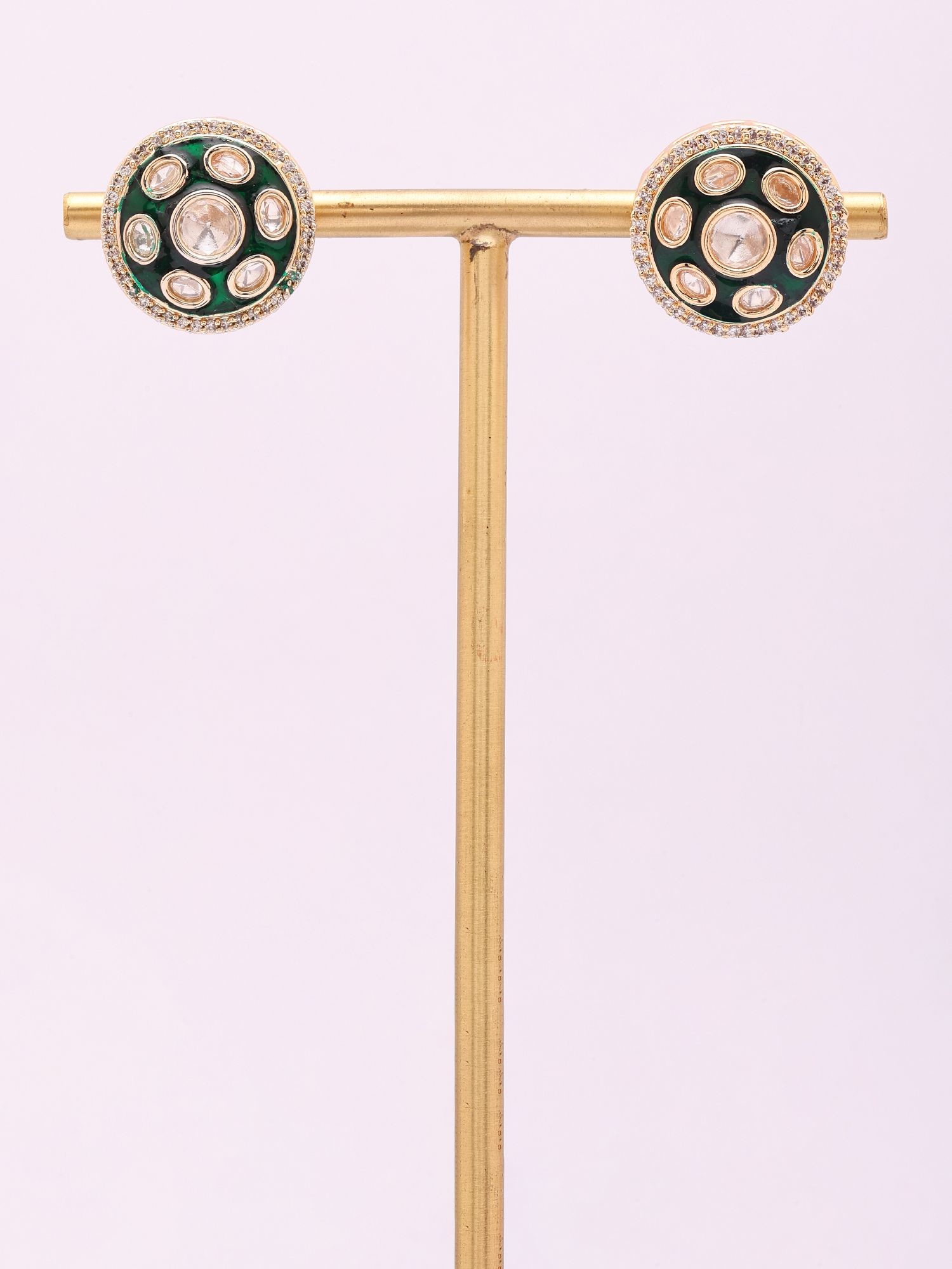 The circular design, measuring approximately 0.8 inches in both length and width, offers a perfectly balanced presence on the ear. The contrast between the deep green enamel and the shimmering Polki stones creates a captivating visual dynamic. Delicate detailing along the outer edge further enhances their luxurious appeal, ensuring they draw the eye with understated grace.