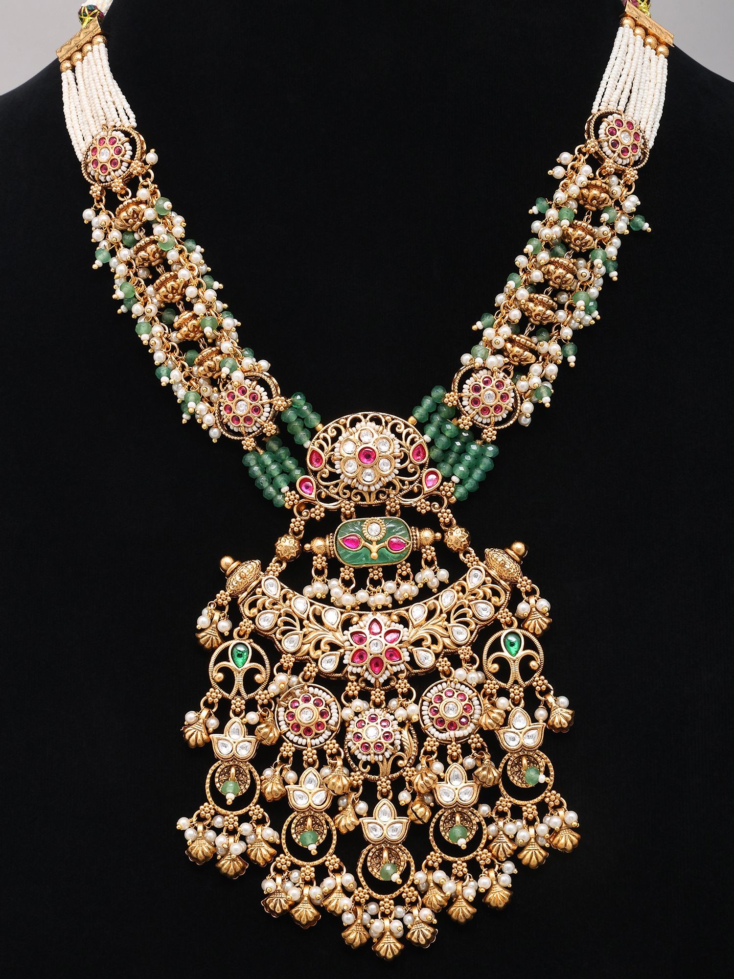 Each piece is meticulously handcrafted from premium brass, a foundation chosen for its enduring quality and ability to be shaped into intricate designs. Skilled artisans employ age-old techniques, carefully setting each polki stone and bead to create a symphony of color and texture. The result is an heirloom-quality creation that speaks volumes of dedication and artistry, promising a tactile and visual delight.