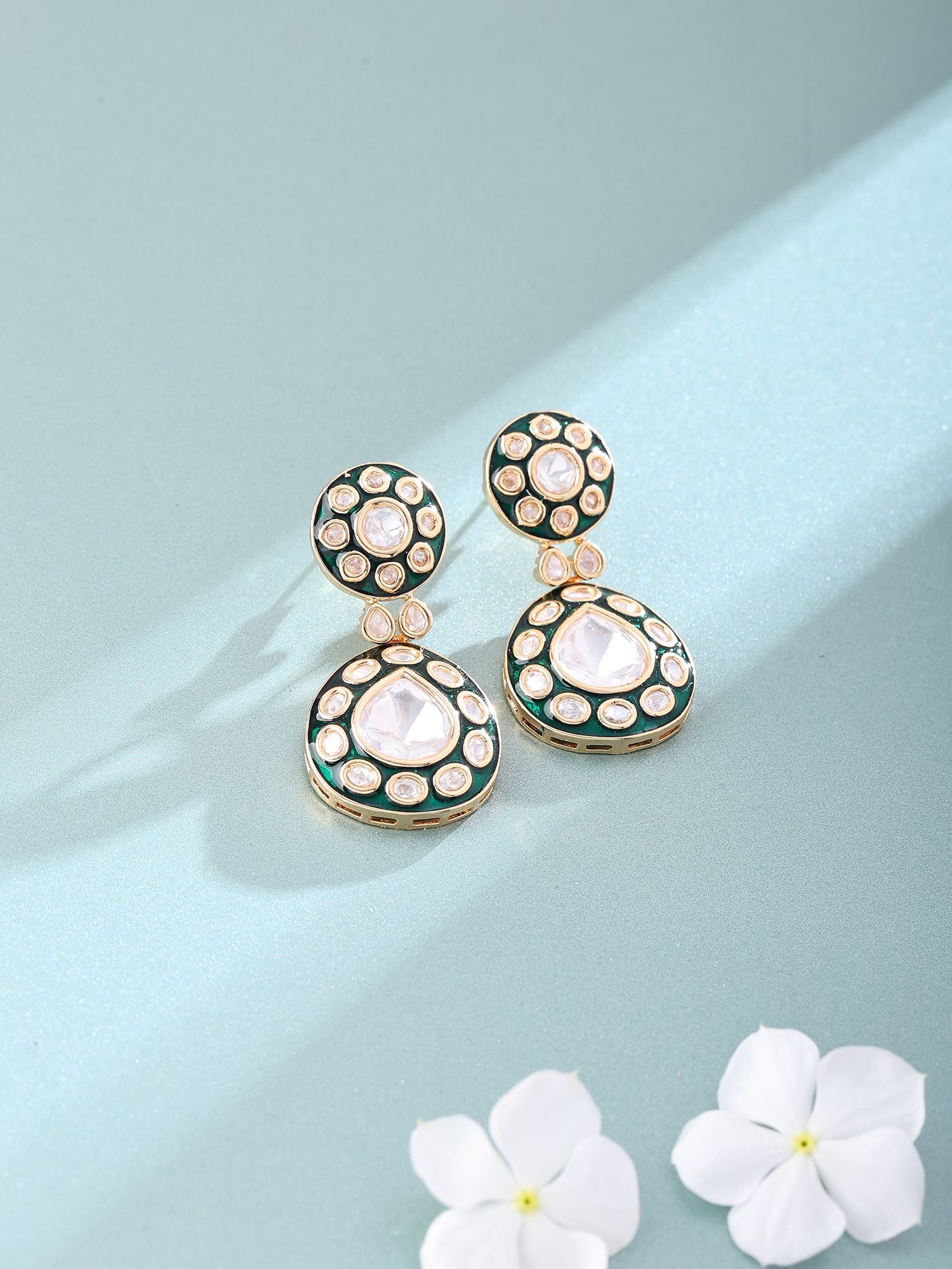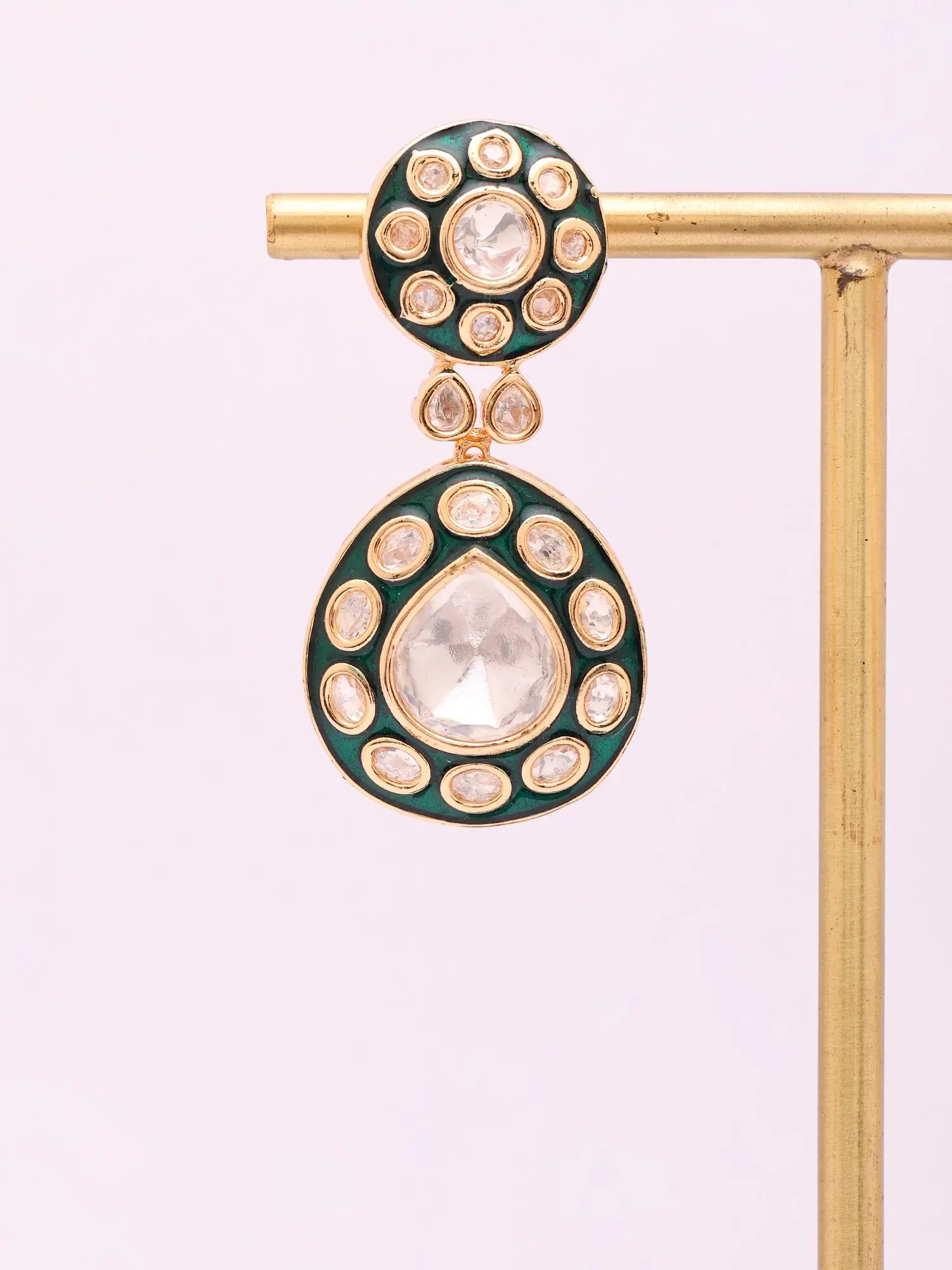 Each piece is meticulously brought to life through a heritage of artisanal skill, featuring a foundation of lustrous brass that speaks to enduring quality. The intricate detailing showcases a dedication to perfection, from the precisely set polki stones that shimmer with an inner fire to the rich, hand-applied enamel that forms a striking contrast. This careful construction ensures not only a visually stunning piece but one that feels substantial and thoughtfully made.