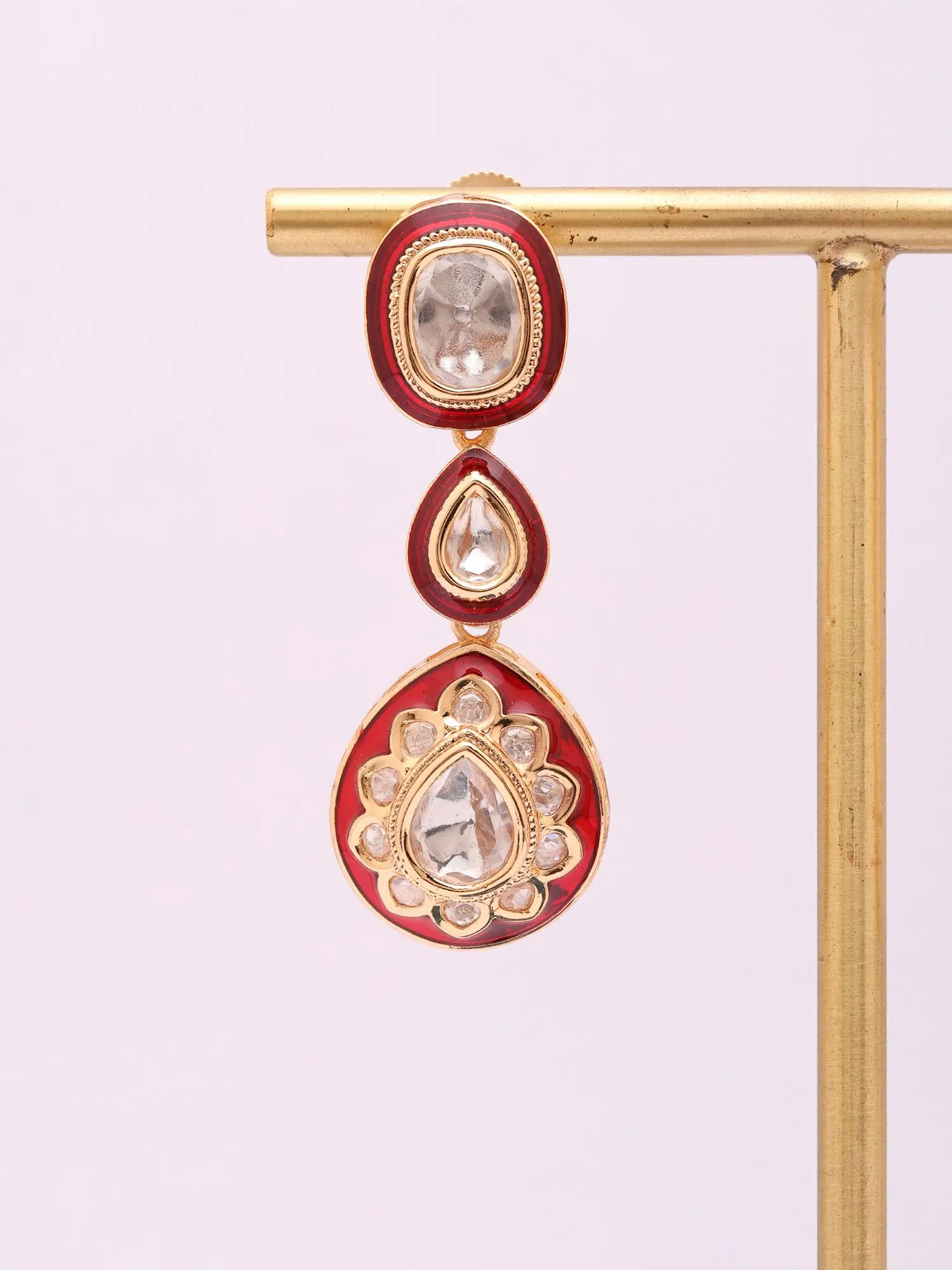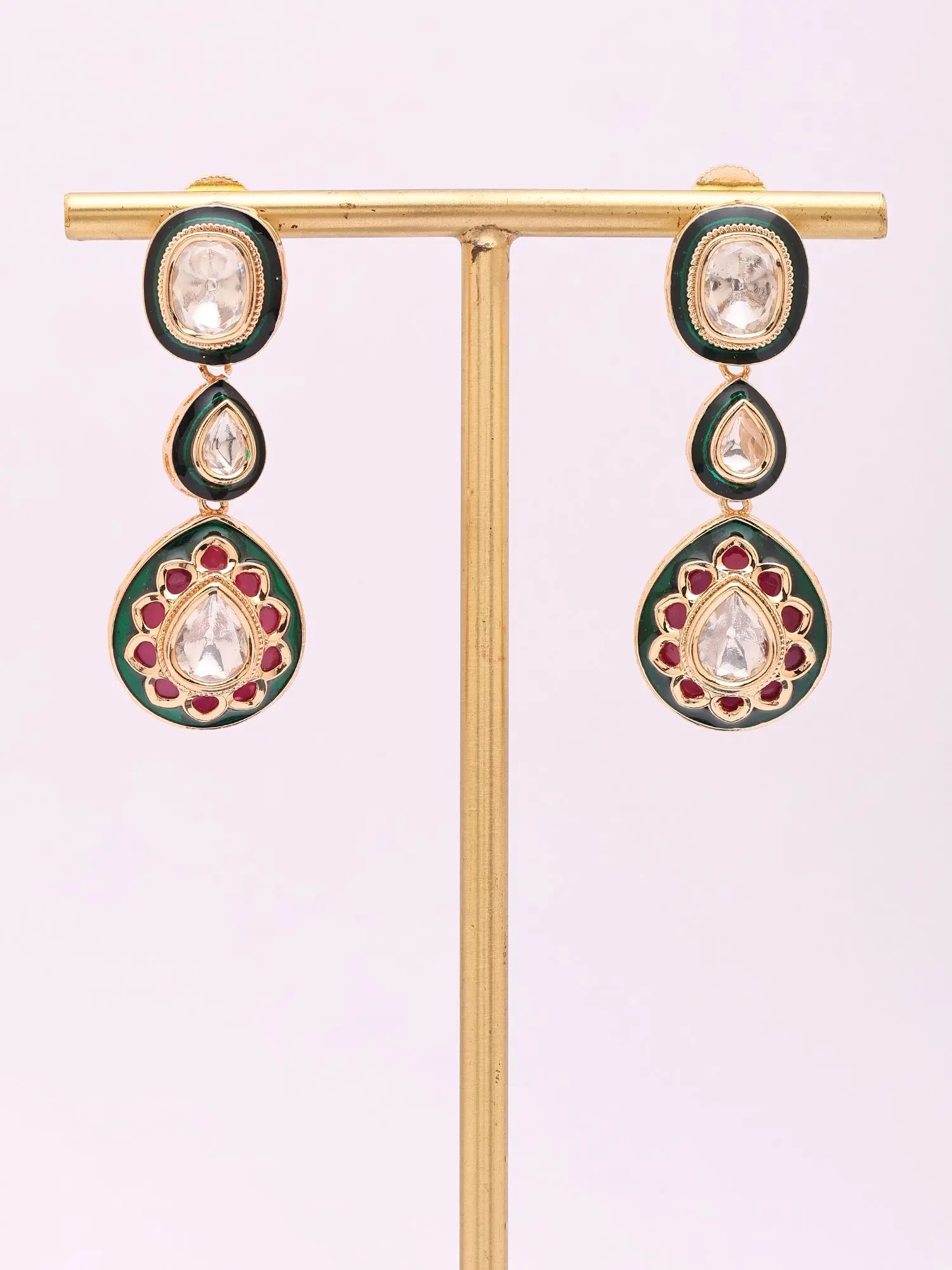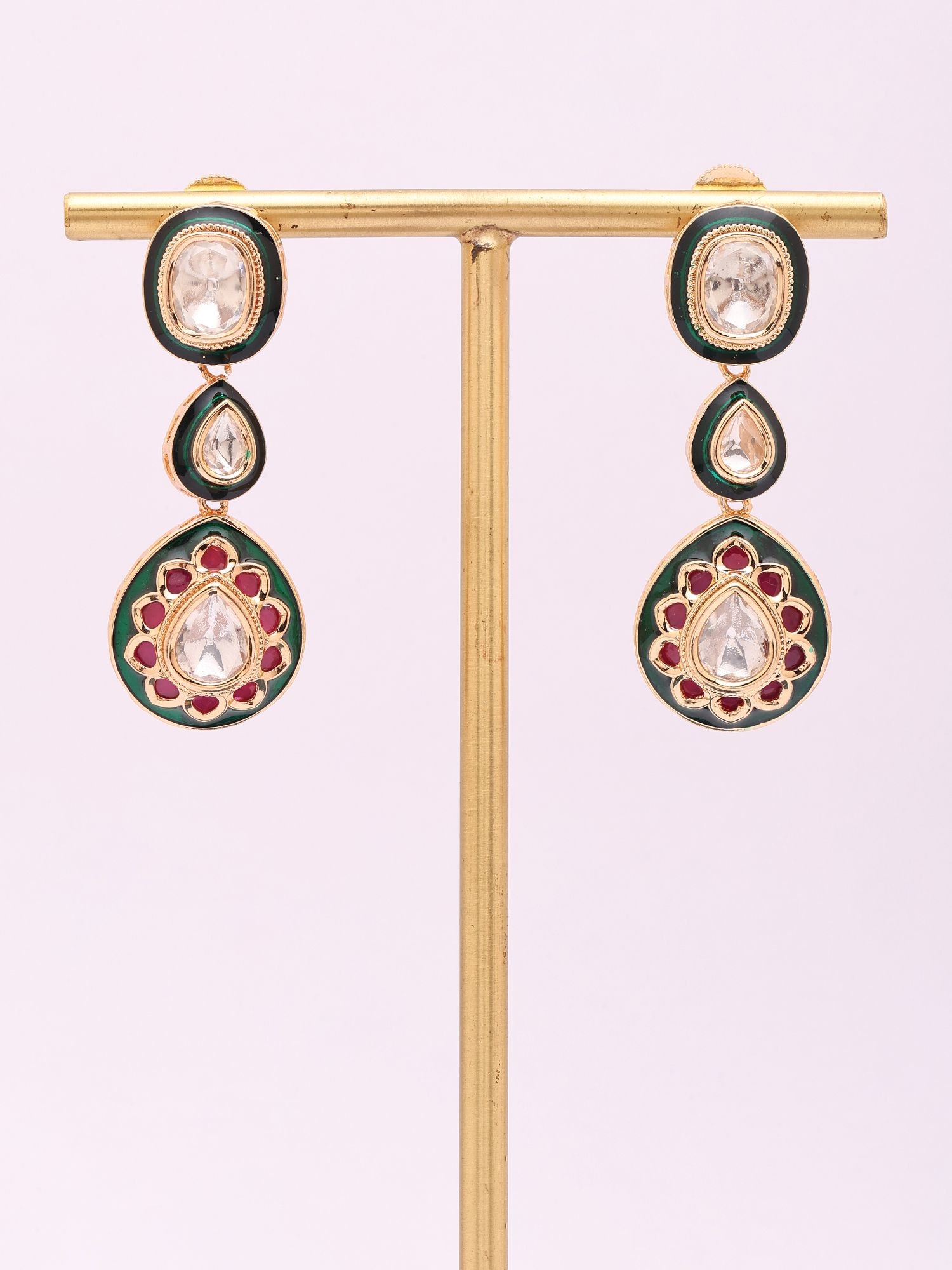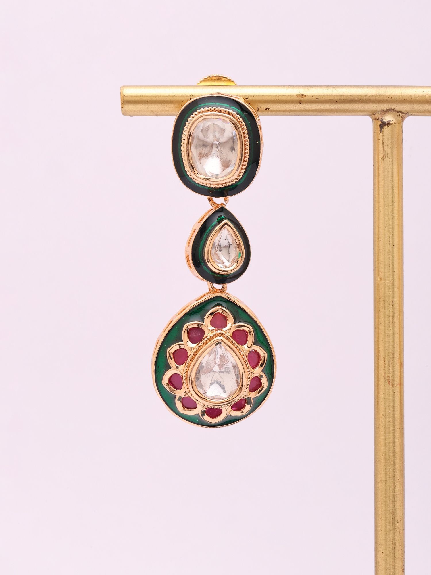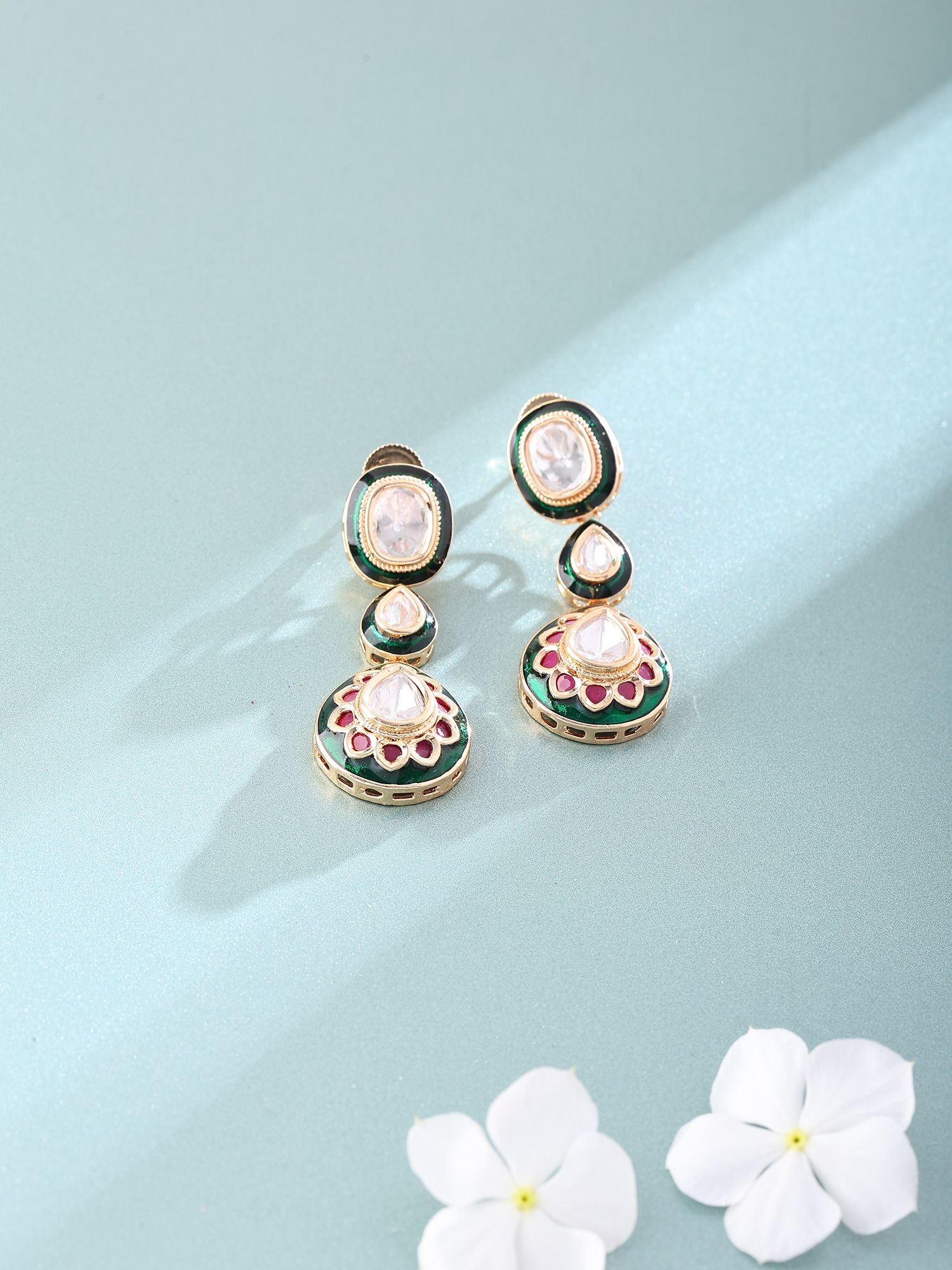 You'll be captivated by the layered design, featuring a trio of luminous polki stones that cascade gracefully. The top stud offers a refined introduction, leading to a delicate teardrop, and culminating in a larger, intricately bordered base. This foundation showcases a rich, deep green enamel, accented by a border of captivating ruby-red floral motifs, all meticulously outlined in gleaming gold. The overall length of approximately 2.1 inches ensures they frame the face beautifully without overpowering, while their width of 0.7 inches provides a balanced and elegant profile.