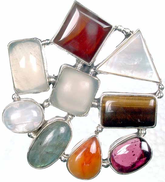 Imagine adorning yourself with a miniature work of art, a wearable expression of your vibrant spirit. This pendant is more than just jewelry; it's a captivating composition of diverse stones, each carefully selected and arranged to create a harmonious and visually stunning piece. The design embraces asymmetry and embraces the natural beauty of each individual stone, resulting in a truly unique and eye-catching accessory. The pendant features an array of different shapes, colors, and textures, creating a delightful visual tapestry. From the rich, deep red of a square-cut stone to the cool, milky iridescence of a moonstone and the earthy warmth of tiger's eye, each gem contributes its own distinct character to the overall design. The stones are nestled within a framework of expertly crafted sterling silver, highlighting the stones and adding a touch of elegant refinement.