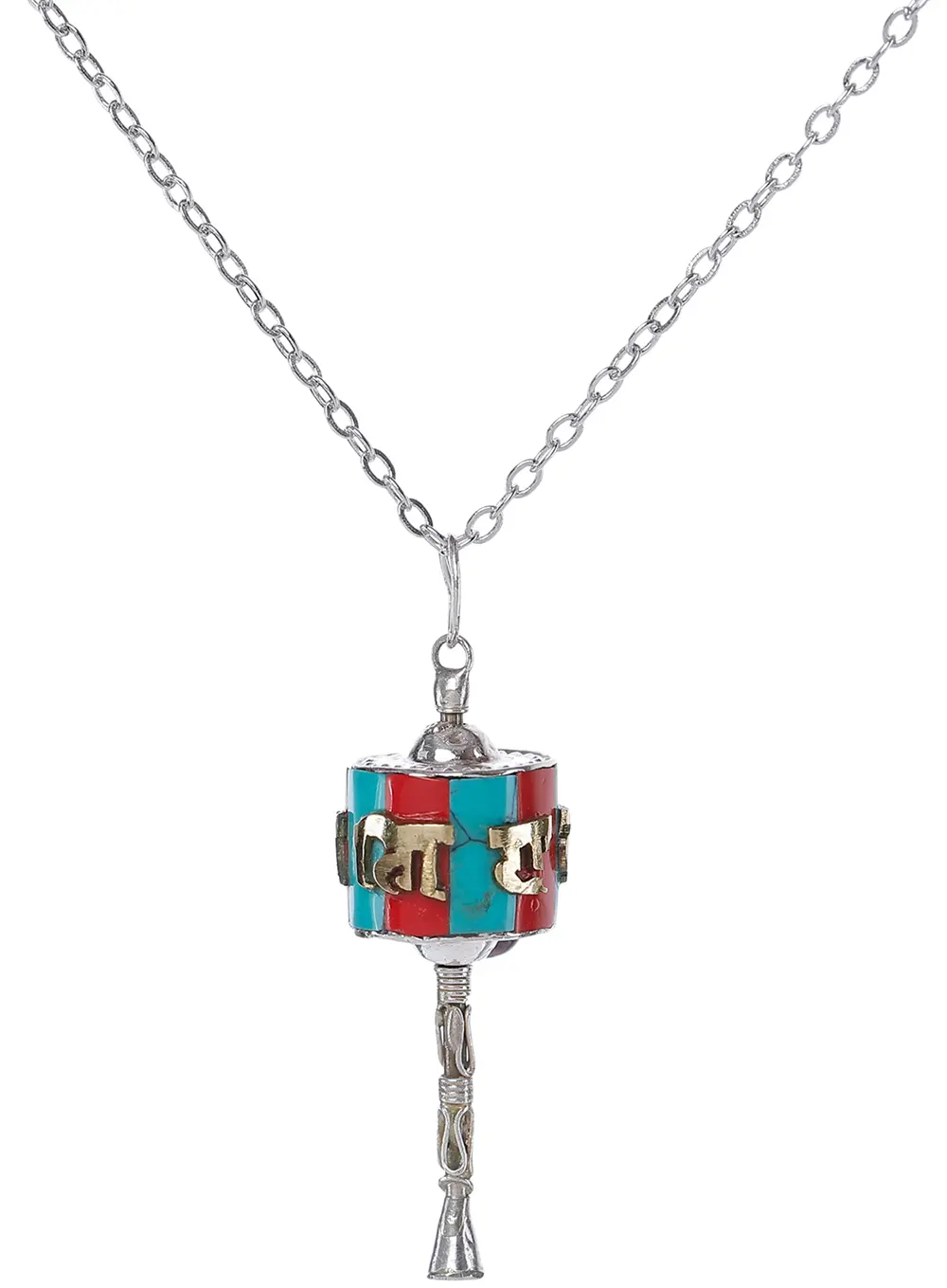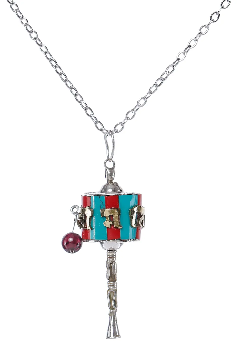 Attached to the side of the cylinder is a small, gleaming red bead, suspended by a delicate sterling silver chain. This movable component, often referred to as a counterbalance, allows the prayer wheel to spin with graceful ease. The act of spinning the prayer wheel is believed to send out prayers, blessings, and positive energy into the world, purifying negativity and accumulating merit for all sentient beings. The smooth rotation facilitated by this bead ensures that the spiritual work is performed with effortless flow.