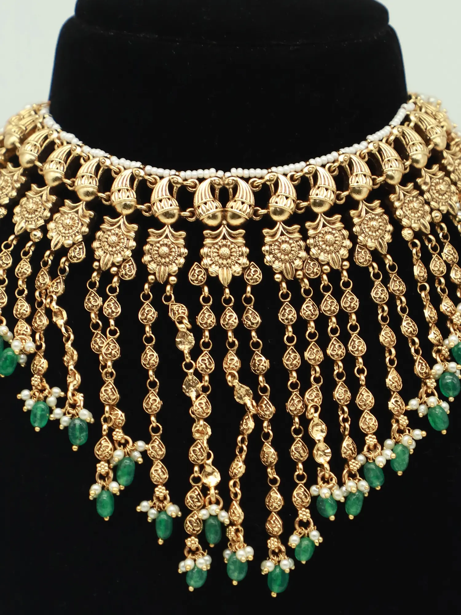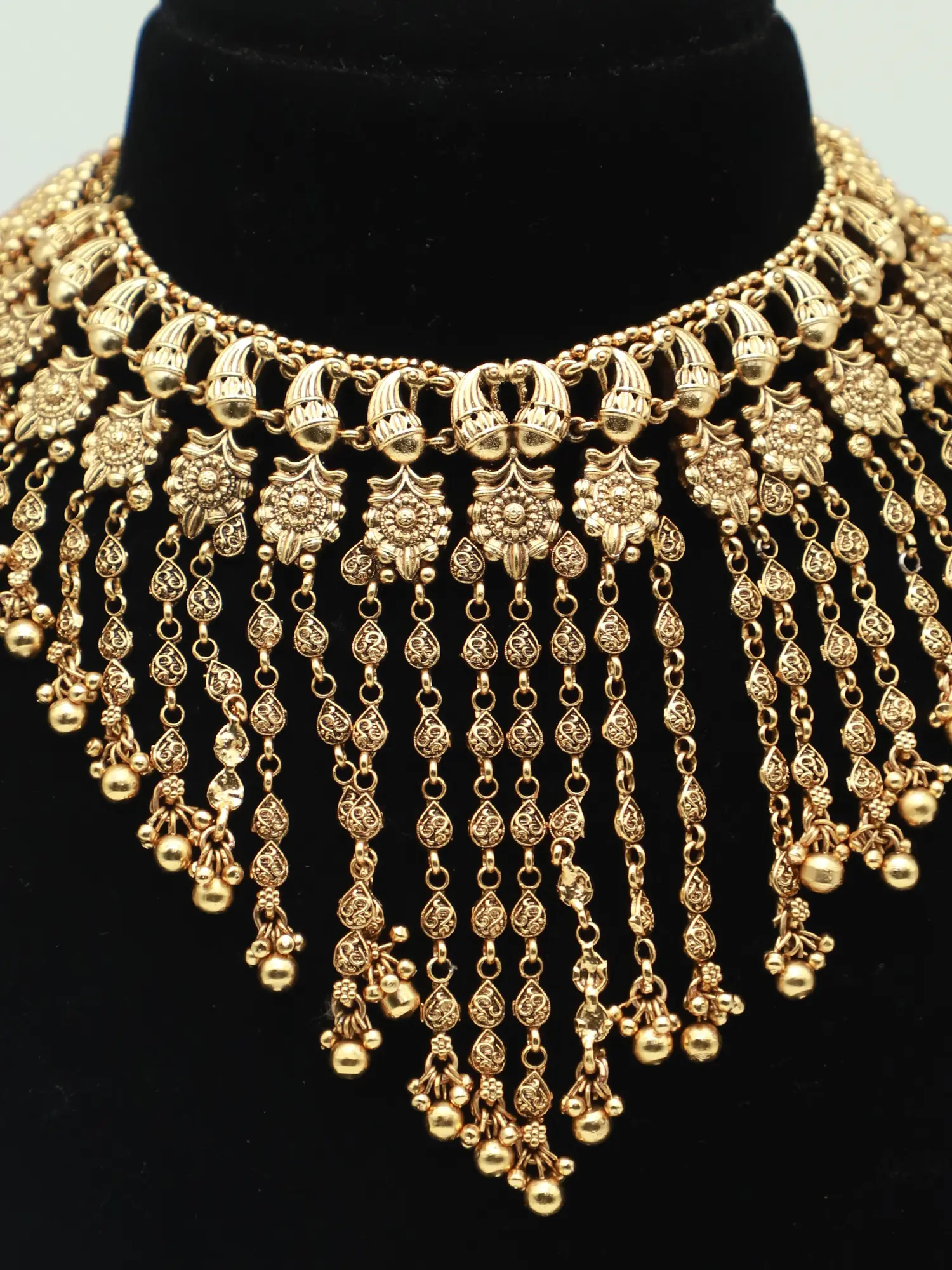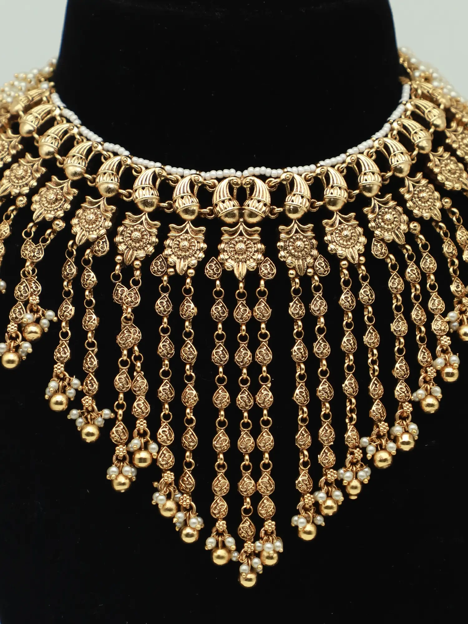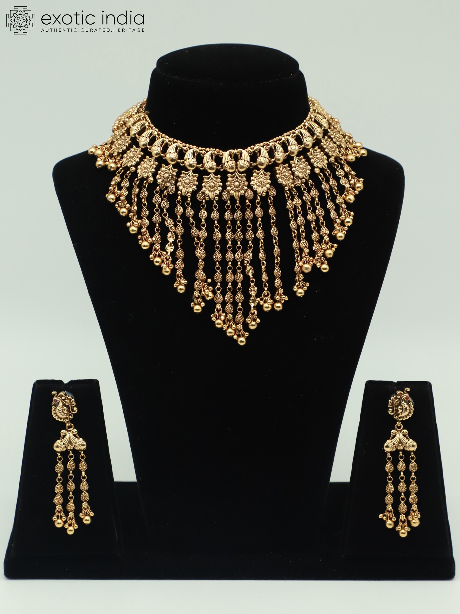 Designer Necklace Set In Matte Finish With Carving And Attractive Earrings