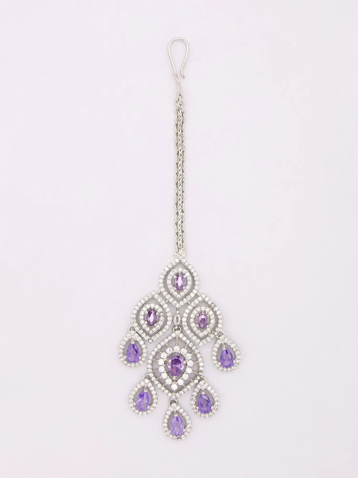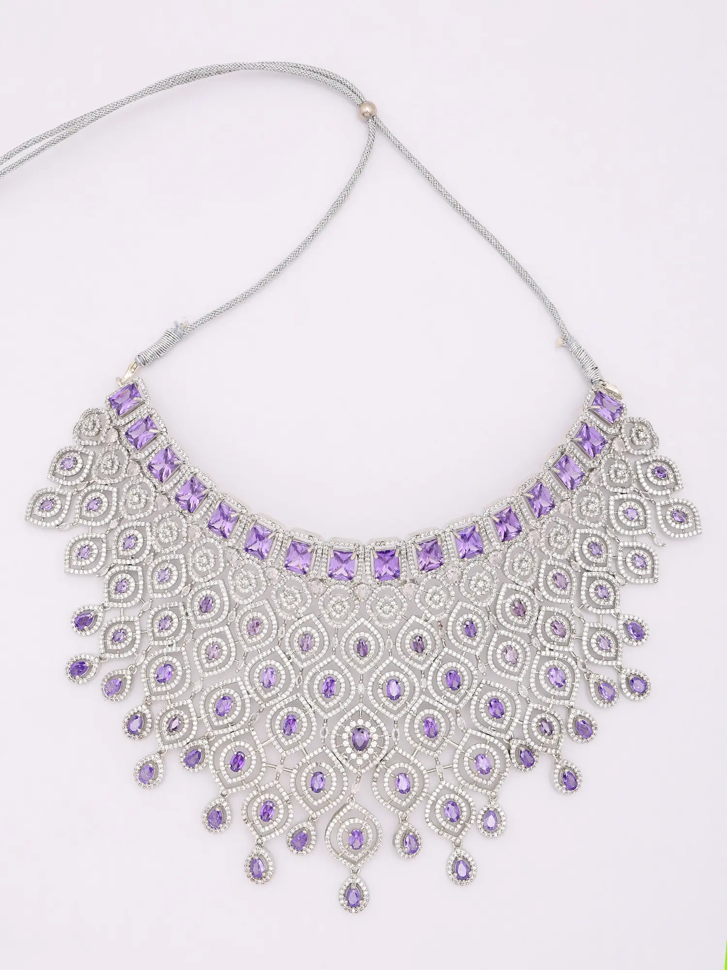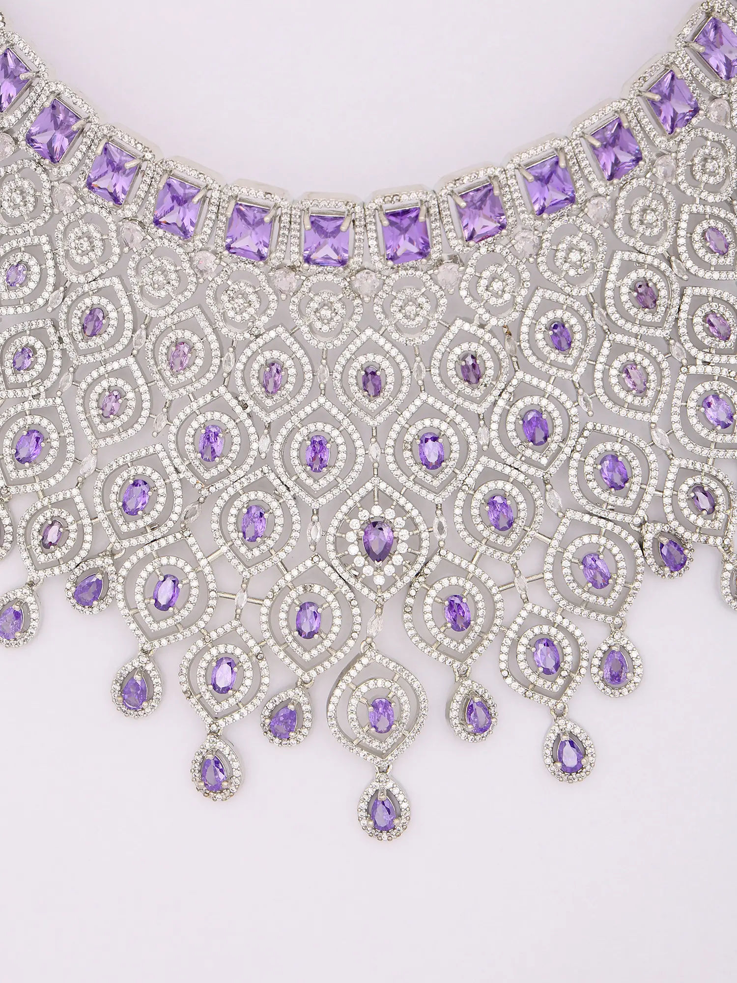 Features a dazzling statement necklace adorned with vibrant purple American diamonds.