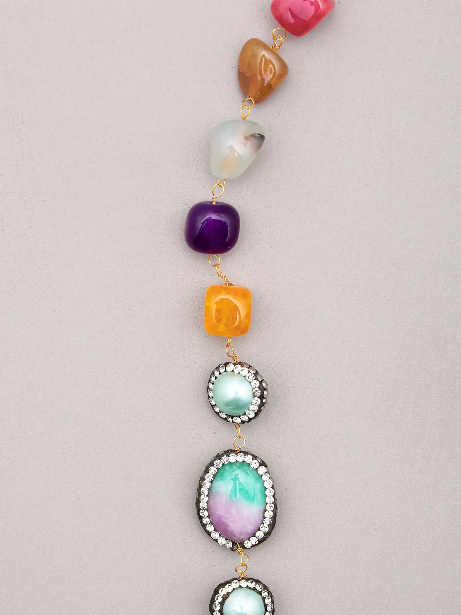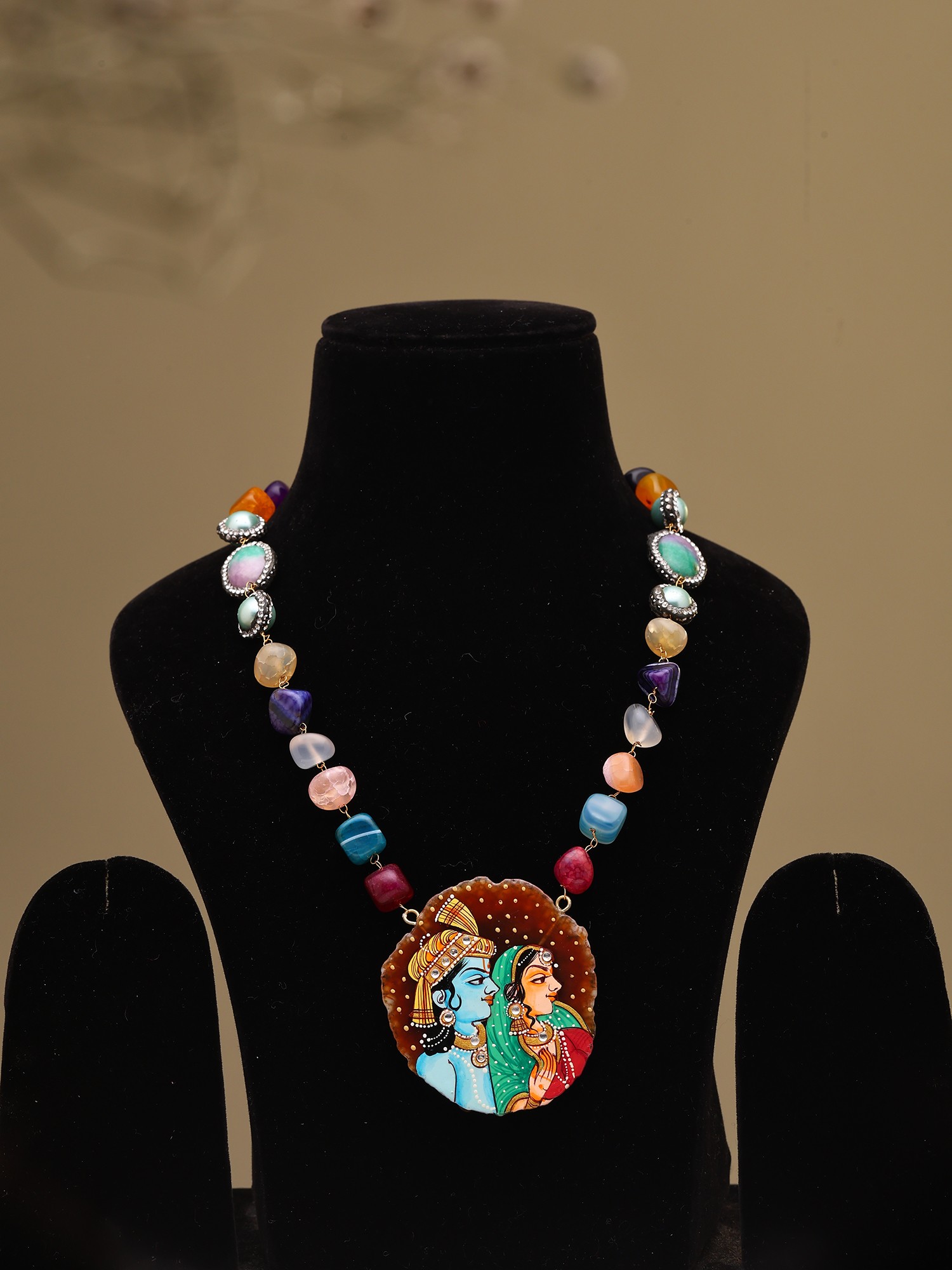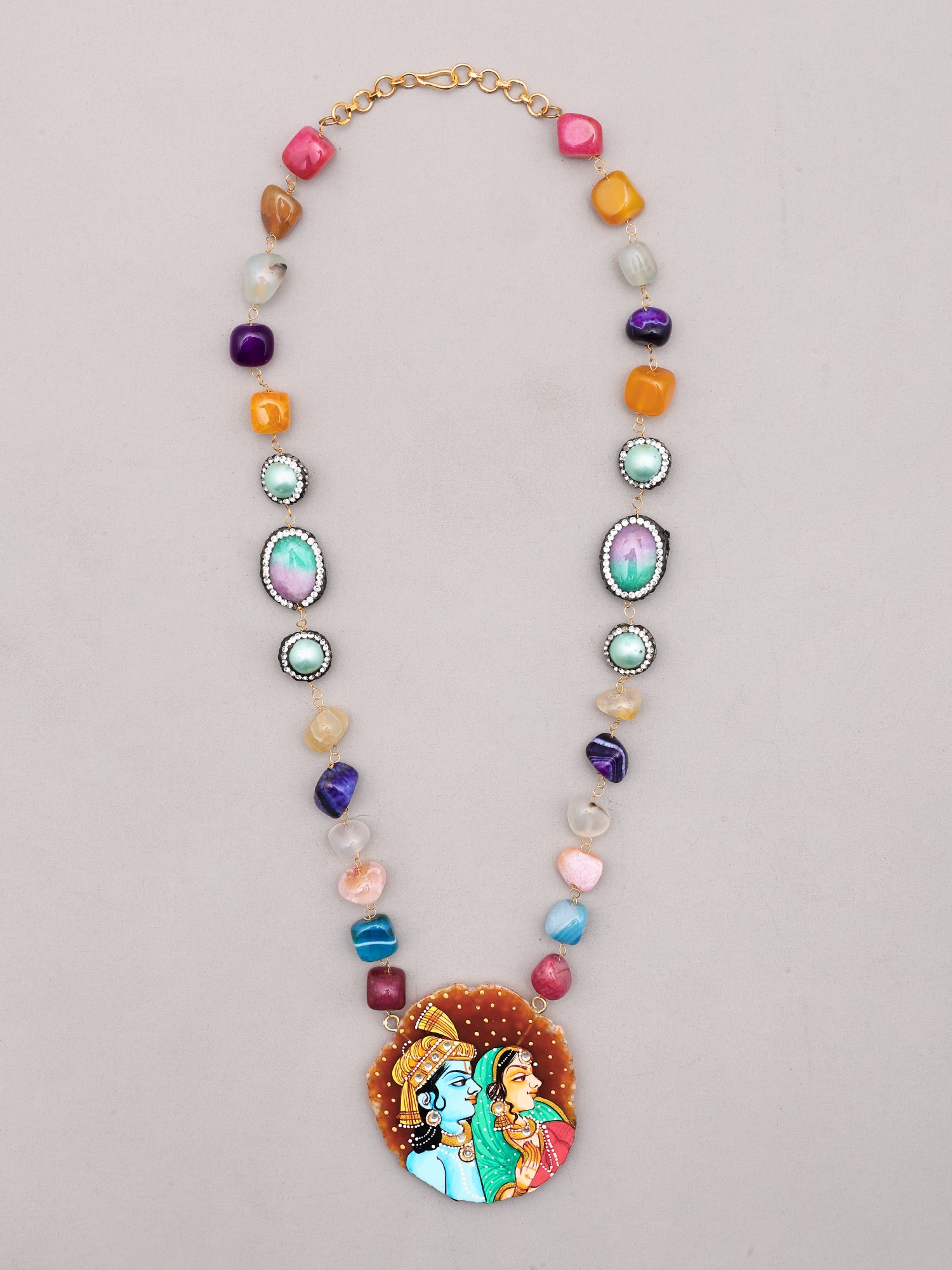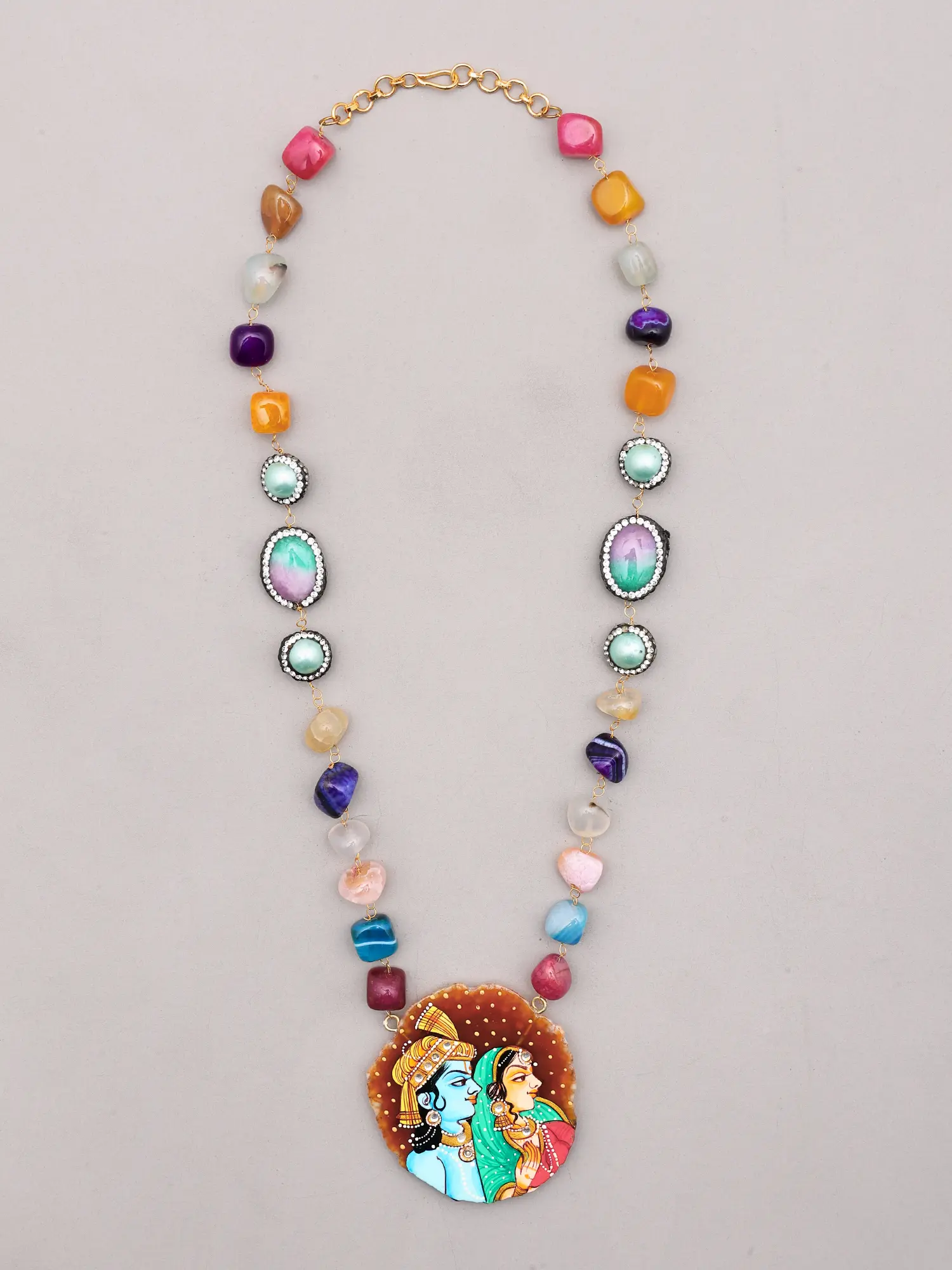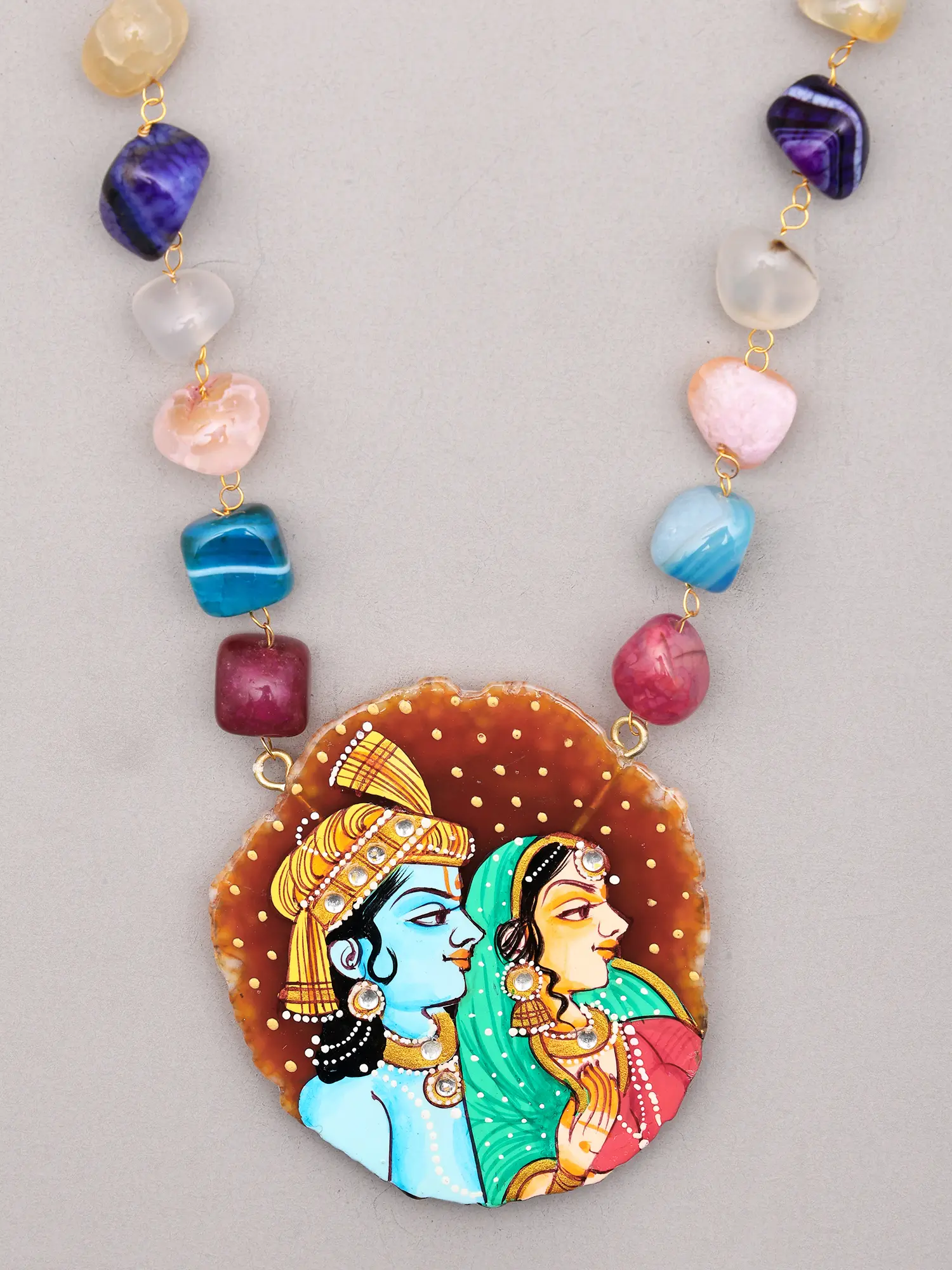 Radha Krishna Art Pendant with Multicolor Stone Beaded Necklace