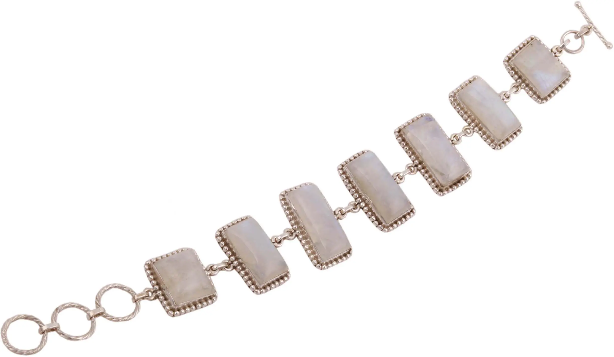This Rainbow Moonstone Baguette Bracelet is an aesthetic take on moon-inspired pieces for everyday wear. This carefully-crafted jewelry can be your next best piece to wear the best aspects of the moon: its brightness and ability to shine in the dark. Indian culture pays heavy attention to jewelry, not just as a fashion piece, but as a sign of wealth and of course, spirituality. It is crafted with a set of rainbow gemstones tastefully set on top sterling silver. The bases is designed with circular details that surrounds the moonstone’s rectangular frame, a classy finish to a beautiful piece of the moon which would soon find its way on the wrists of ladies everywhere.