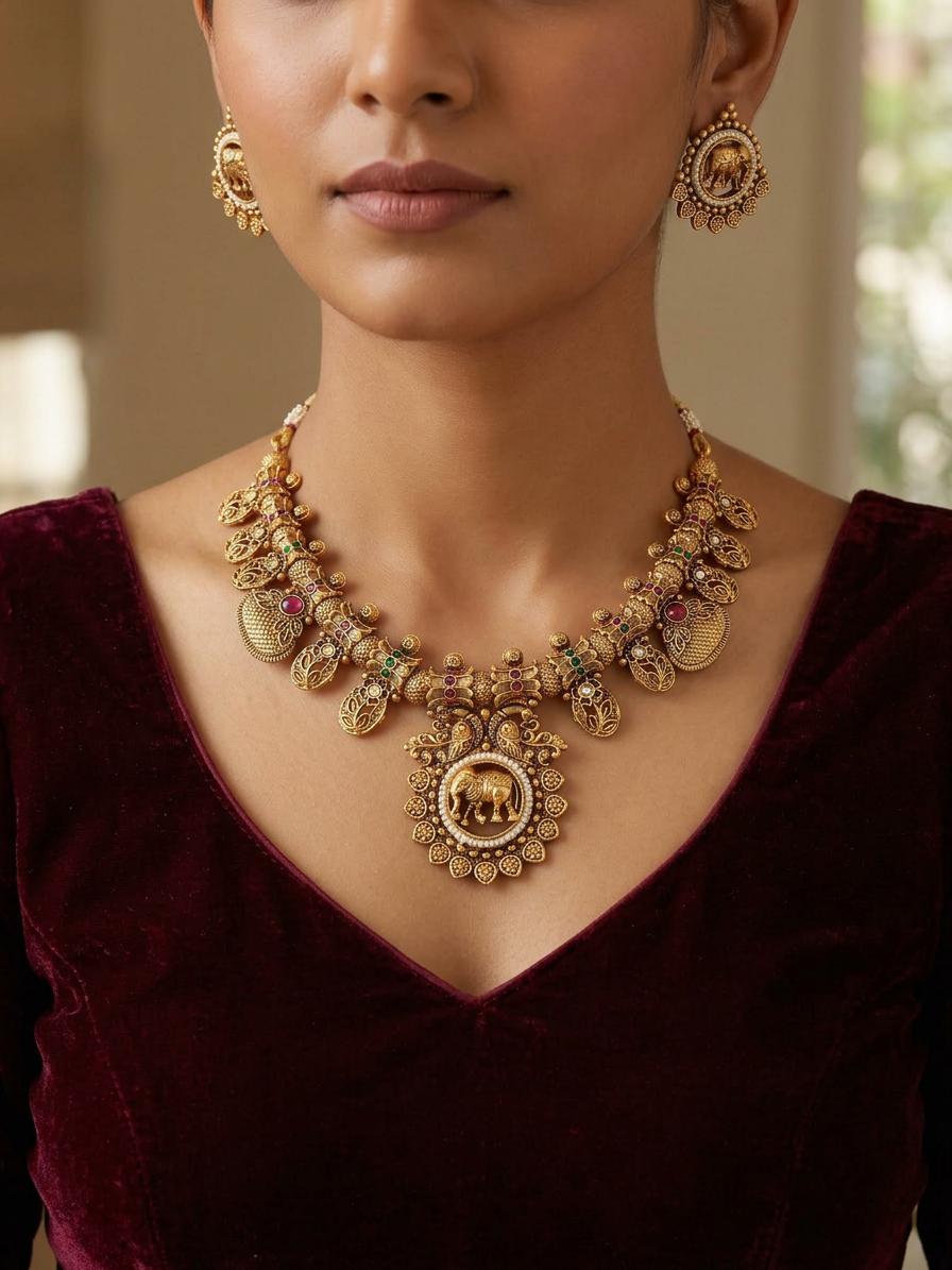 Premium Brass Necklace Set With Attractive Carving Earrings In Hasli Look