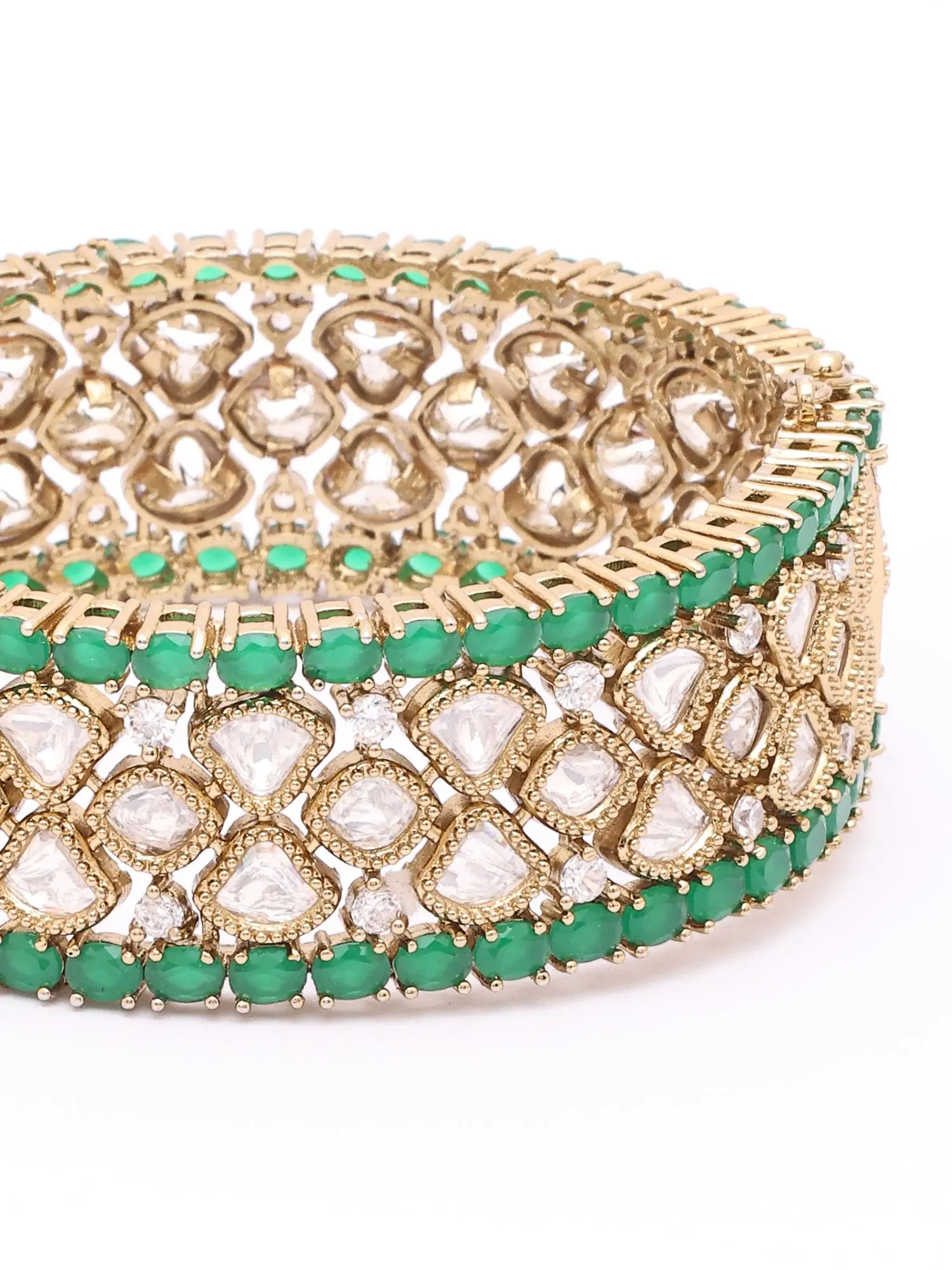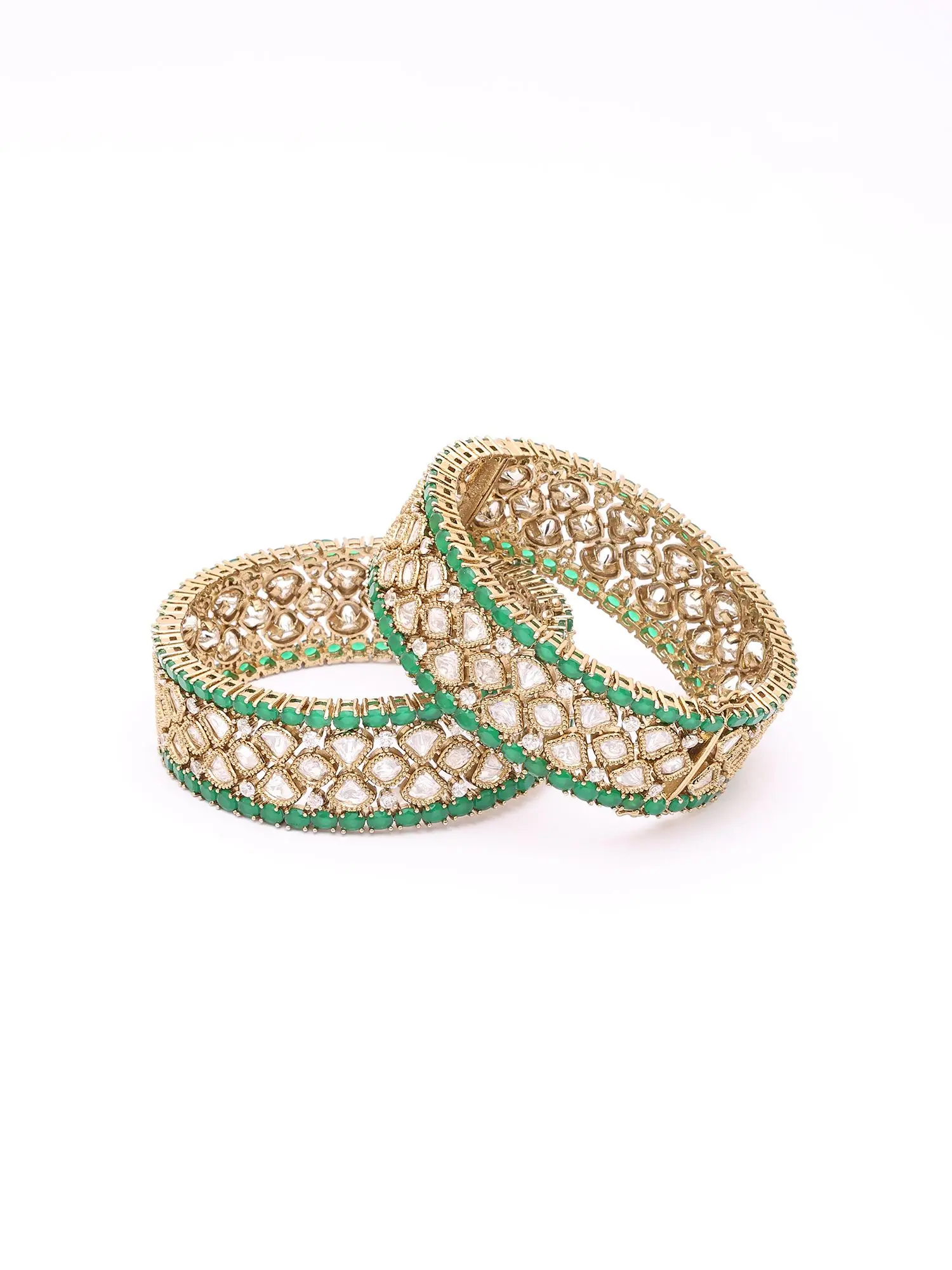 The surface of each bangle boasts a rich tapestry of clear, diamond-like Polki stones, arranged in a complex, geometric pattern that exudes vintage charm. These are beautifully framed by a delicate border of brilliant emerald stones, adding a captivating splash of color. The substantial width of 1.95 inches ensures these bangles command attention, while their height of 0.95 inches provides a comfortable yet impactful presence on your wrist.