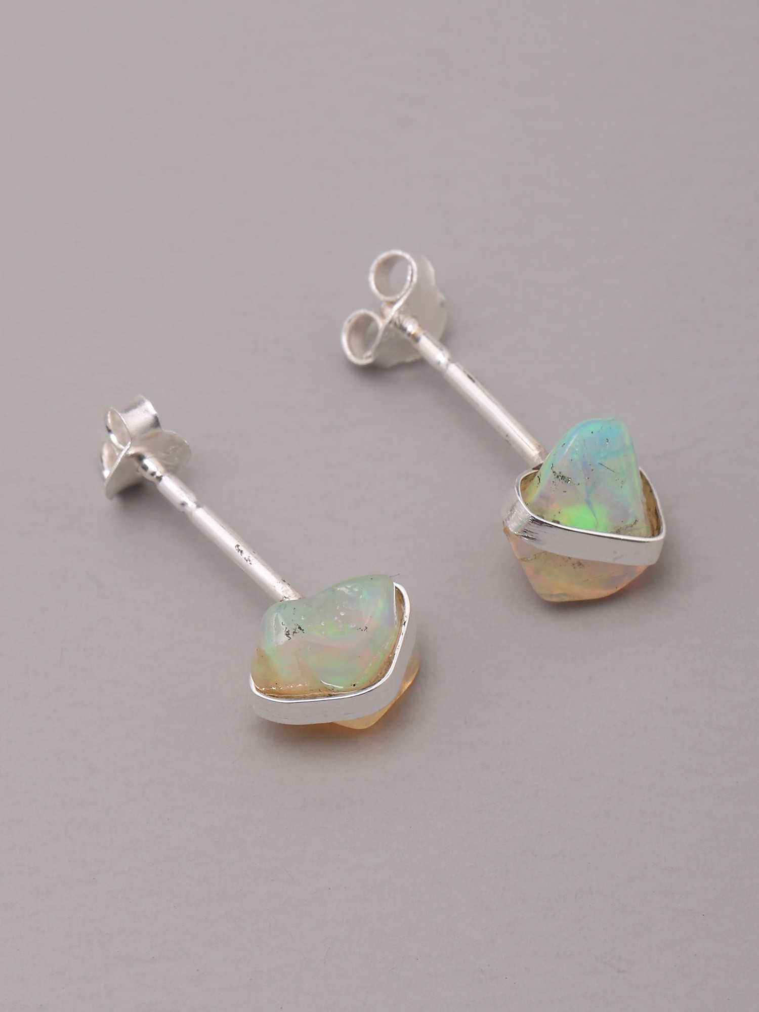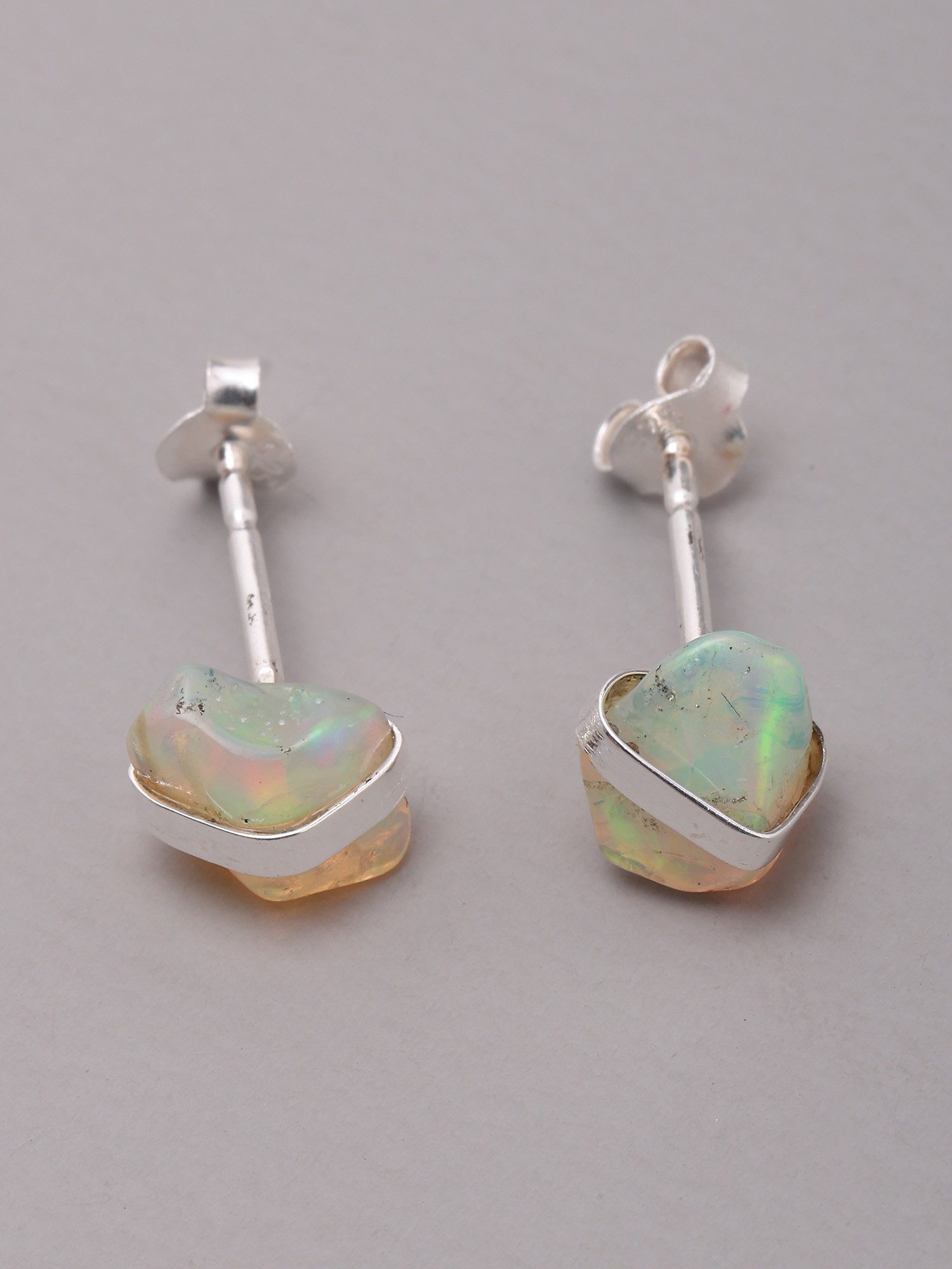 Ethiopian opal is known for its mesmerizing play of color, caused by the diffraction of light within the stone's internal structure. In these earrings, you'll find hints of iridescent greens, blues, and yellows dancing across the surface, creating a subtle yet captivating effect. The raw nature of the opal enhances this play of color, adding depth and dimension to each individual stone. This natural gemstone is a captivating display of organic artistry.