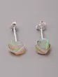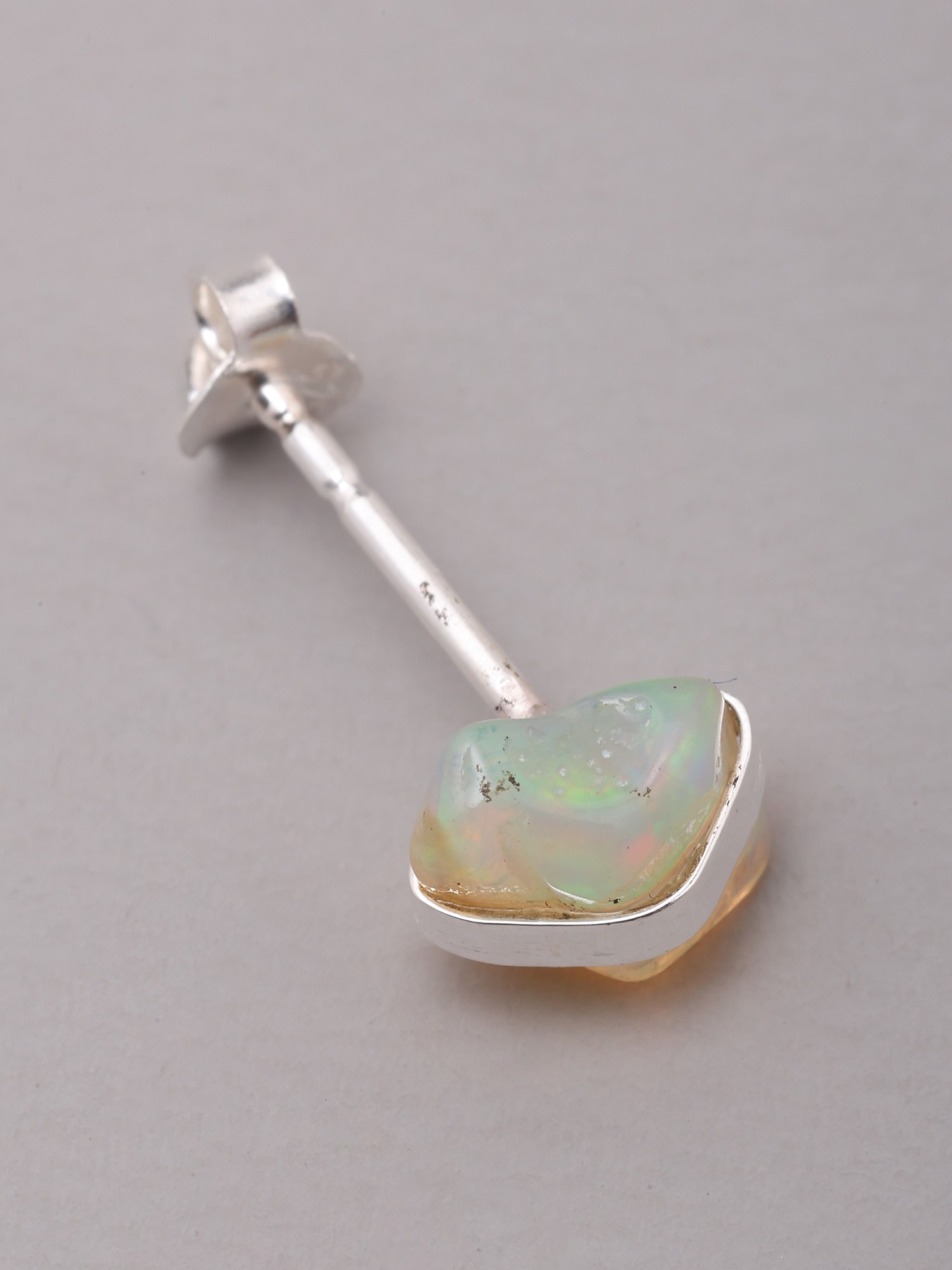 The opals are carefully set in sleek sterling silver, a metal known for its durability, timeless elegance, and hypoallergenic properties. The minimalist design of the setting complements the raw beauty of the opal, ensuring that the stone remains the focal point. The sterling silver adds a touch of refined sophistication while allowing the natural beauty of the opal to take center stage. These earrings are secured with traditional post backings for comfortable and confident wear.