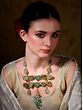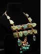 Adorned with dangling jade gemstones and lustrous pearls, adding depth and elegance.