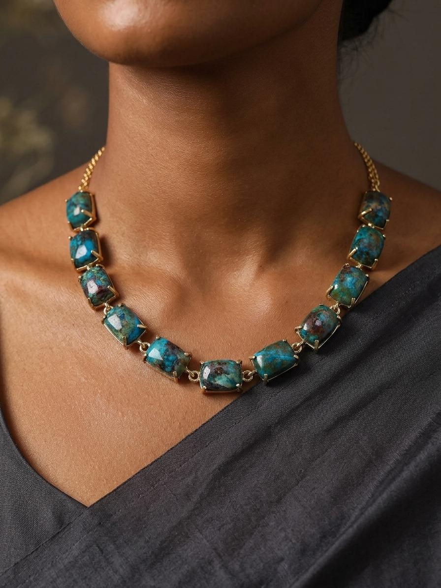 You'll appreciate the way the rectangular-cut stones, showcasing mesmerizing swirls of turquoise and earth tones, are embraced by a gleaming brass setting. The delicate chain, measuring a comfortable 9.8 inches, gracefully drapes to create a visually captivating statement that complements your neckline. The textural depth of the stones adds a unique, tactile dimension.