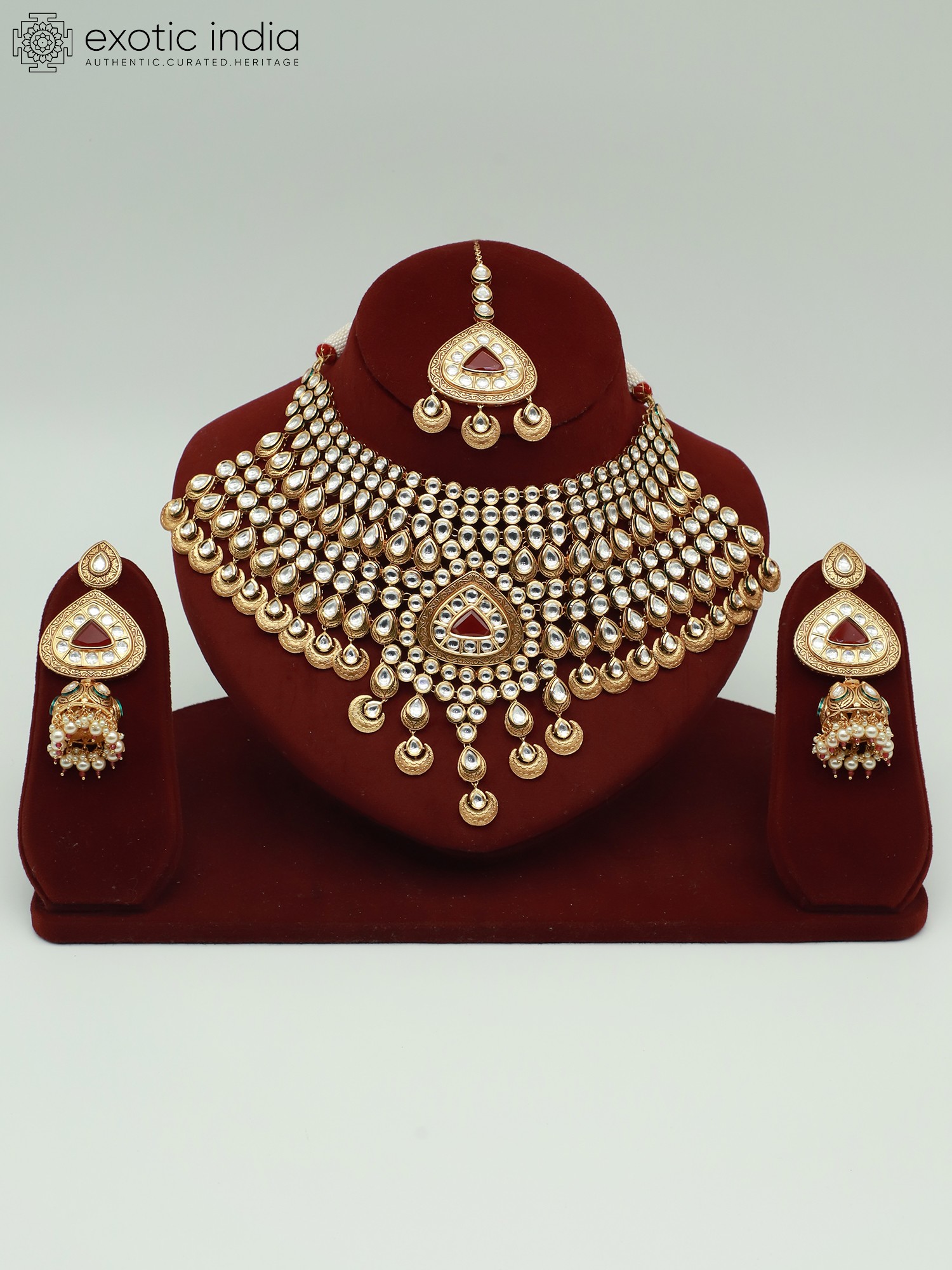 Heavy Moissanite Kundan Necklace Set With Earrings And Mangtika For Bride