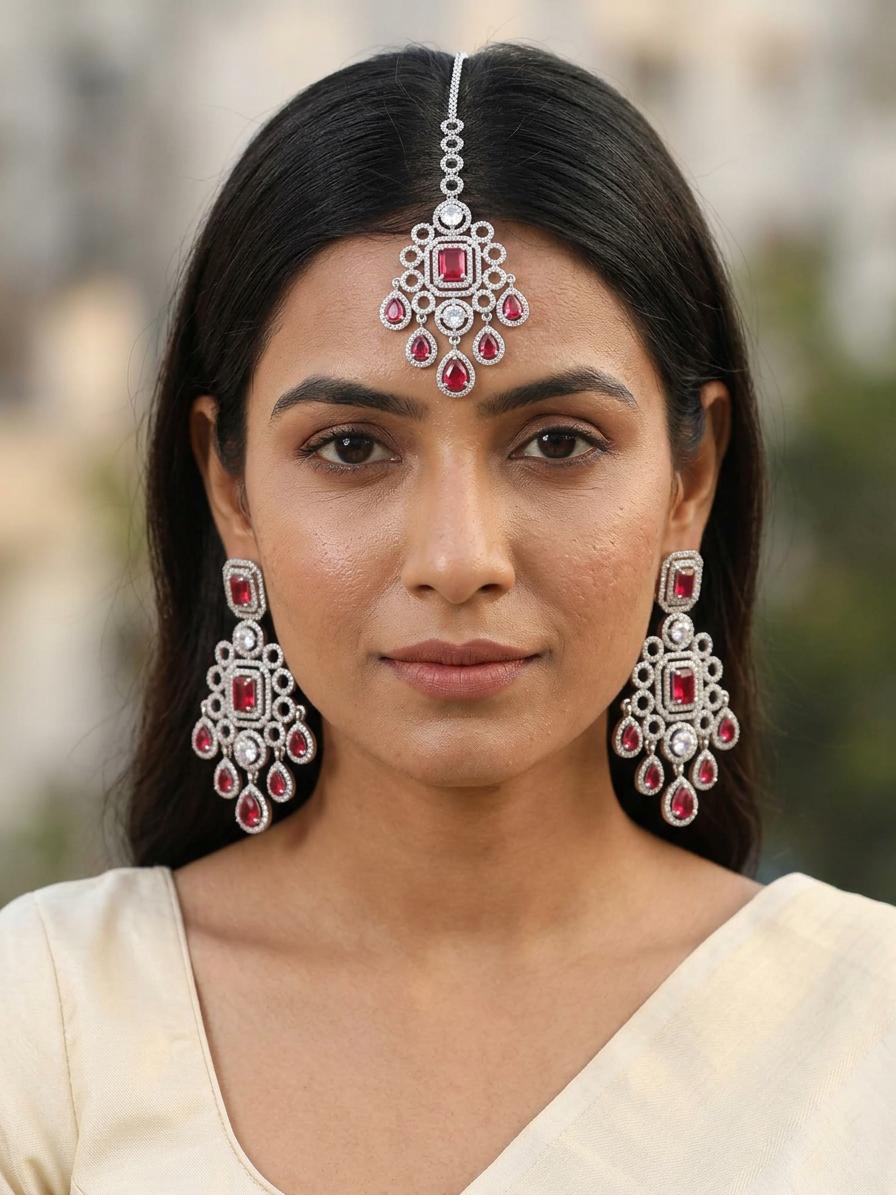 The earrings, measuring a graceful 2.75 inches in height and 1.25 inches in width, feature a stunning cascade of sparkling American diamonds surrounding captivating red stones. Complementing this, the matching maang tikka extends an impressive 5.15 inches in length with a 1.25-inch width, designed to beautifully frame your face. The intricate detailing of the settings and the fluidity of the design create a breathtaking visual harmony, ensuring you command attention.