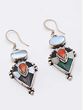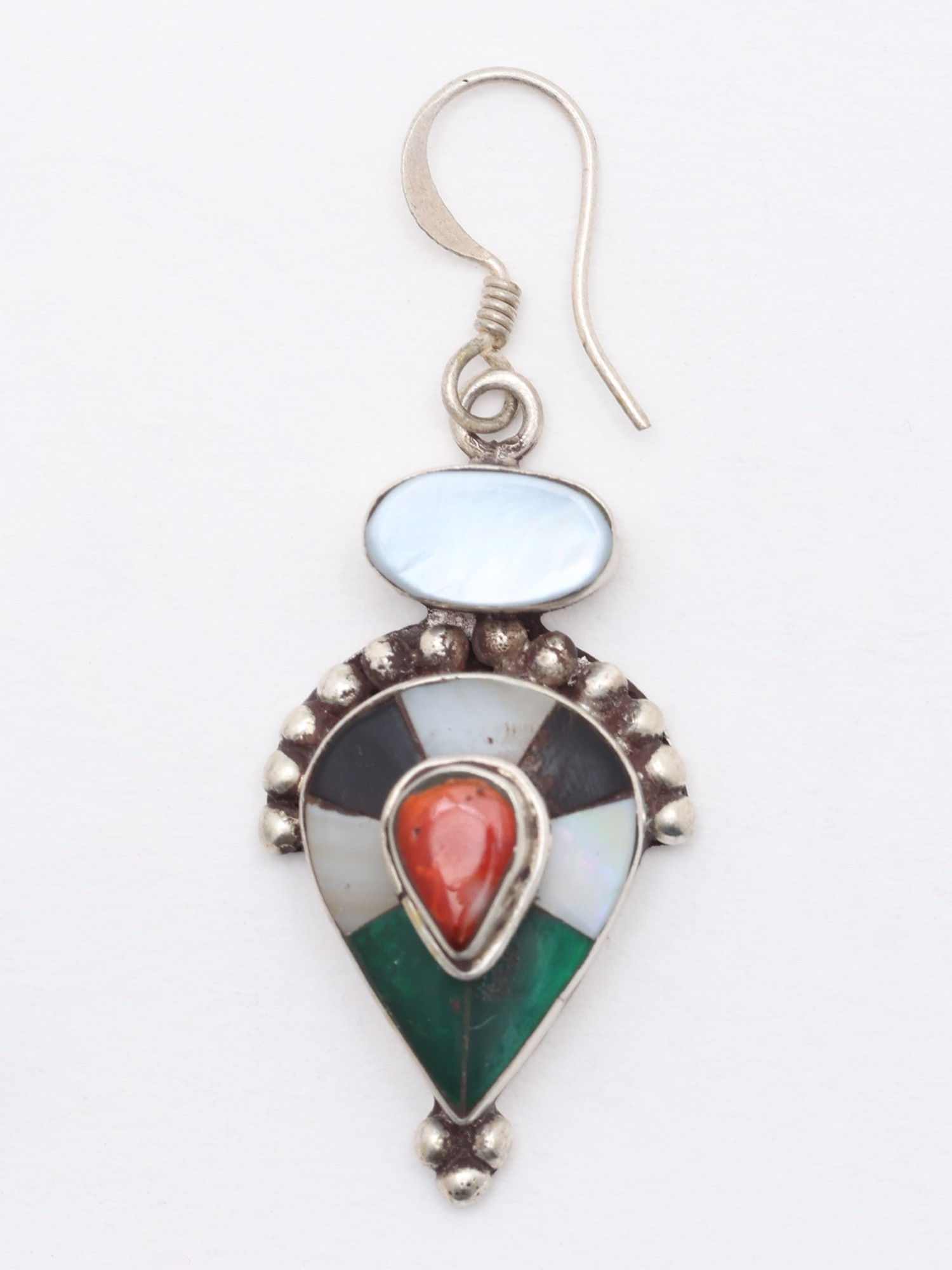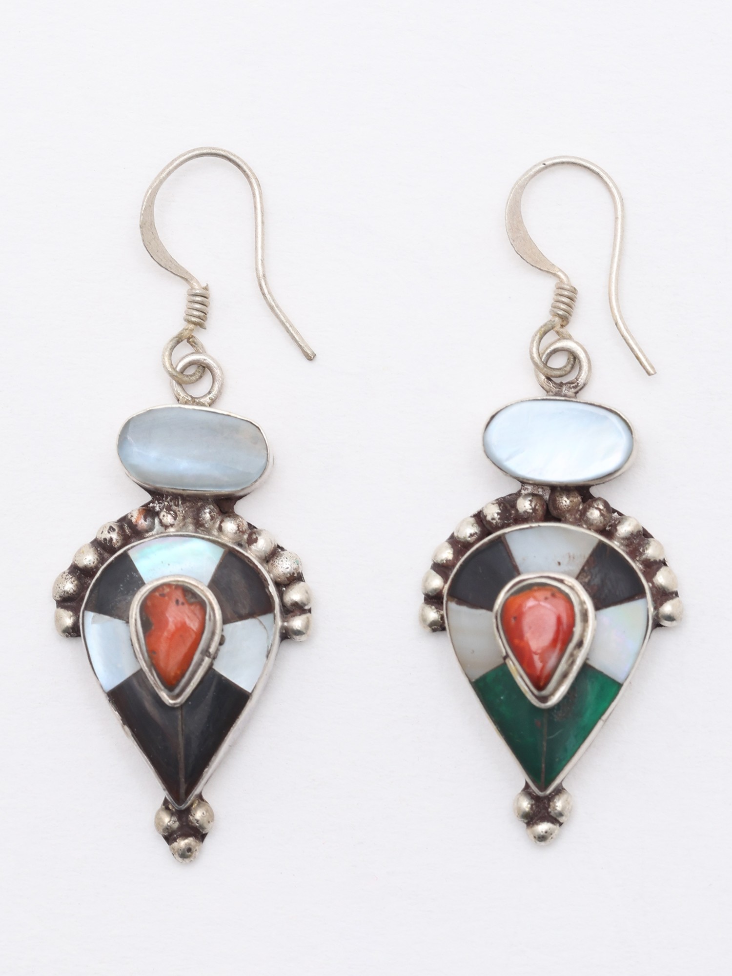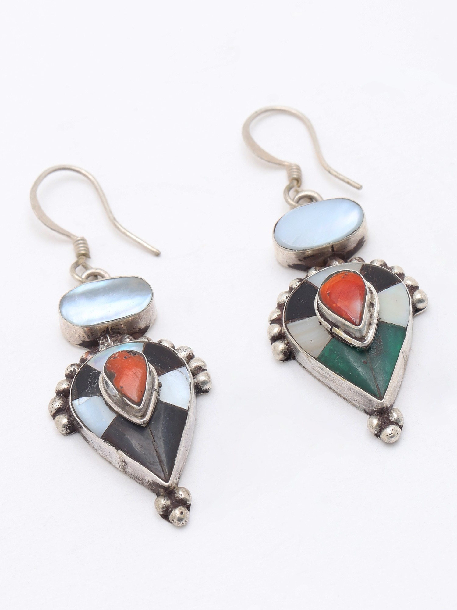The focal point of these earrings is the mesmerizing array of multi-colored gemstones carefully set within a silver frame. The heart of the design features a vibrant coral gemstone, adding a pop of warm color against the cooler tones of the other stones. Surrounding the coral are pieces of lustrous mother-of-pearl, creating a beautiful contrast of textures and adding a touch of ethereal beauty. Accents of jet-black onyx and a rich, deep green malachite complete this dazzling ensemble, resulting in a captivating play of color and light. Each gemstone is meticulously hand-selected for its superior quality and brilliance, ensuring that these earrings will remain a treasured piece in your jewelry collection for years to come.