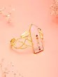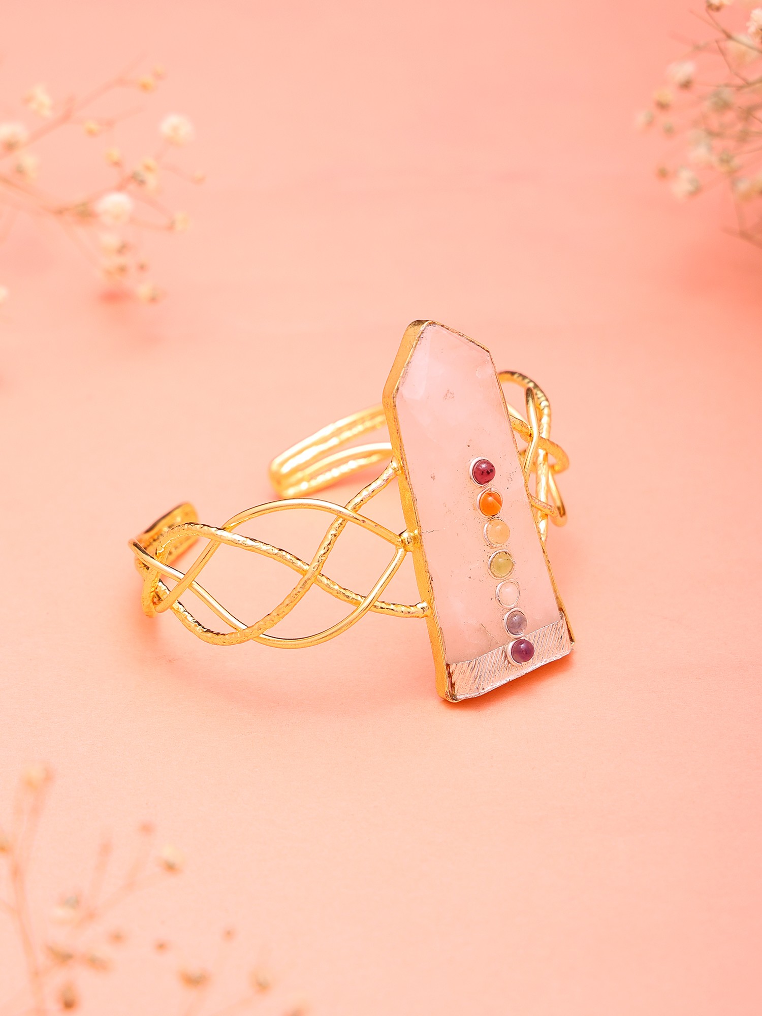At the heart of this captivating bracelet lies a magnificent rose quartz crystal, its soft, translucent pink hue exuding an aura of love, compassion, and peace. This natural wonder is meticulously set and framed, showcasing its inherent beauty. Along the length of the crystal, a vibrant procession of carefully selected gemstone cabochons unfolds, each representing a different chakra. From the deep ruby red at the top to the soothing amethyst at the bottom, these stones are thoughtfully arranged to create a visually stunning cascade of color, reminiscent of a rainbow reaching earth. The polished finish of these accent stones ensures they catch the light, adding a subtle sparkle to the overall design. The bracelet's band is equally impressive, featuring an intricate openwork pattern that weaves and interlaces with artistic flair. Rendered in a lustrous, warm-toned metal, this design evokes a sense of flowing movement and delicate strength. The open cuff style allows for a comfortable and adjustable fit, making it a versatile piece for a variety of occasions, from everyday wear to special events. The rich gold tone of the band beautifully complements the rosy tones of the quartz and the diverse colors of the chakra stones, creating a truly harmonious aesthetic.