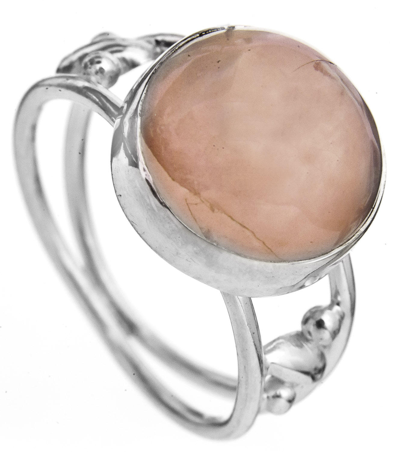 The captivating rose quartz, measuring a generous 11 mm in height, presents a delicate blush that evokes feelings of warmth and tenderness. Its smooth, polished surface reflects light beautifully, revealing subtle inclusions that lend each stone its unique character. This mesmerizing gem is set upon a gracefully designed sterling silver band, its contours flowing with an organic fluidity that complements the soft form of the stone. You’ll find the interplay of polished metal and translucent gem to be utterly enchanting.