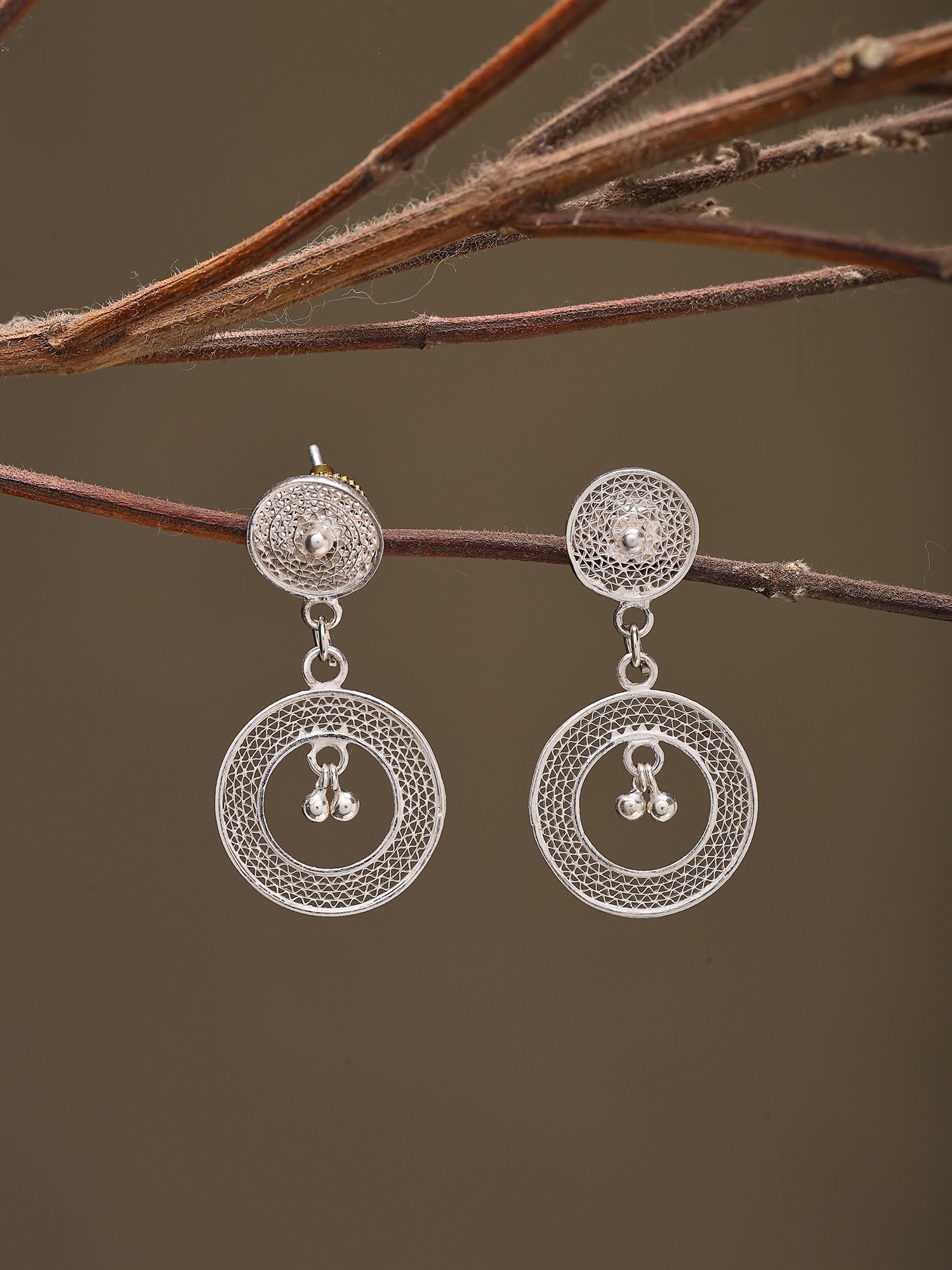 The circular motif, a symbol of unity and timeless elegance, forms the heart of each design. A smaller, intricately patterned disc sits atop, connected by a delicate chain to a larger, openwork circle. Within this outer frame, tiny, polished silver beads dangle, offering a subtle, delightful jingle with every turn of your head, reminiscent of traditional ghungroos. The overall silhouette, measuring approximately 1.5 inches in height and 0.7 inches in width, strikes a perfect balance, allowing them to be noticeable without overwhelming your features.
