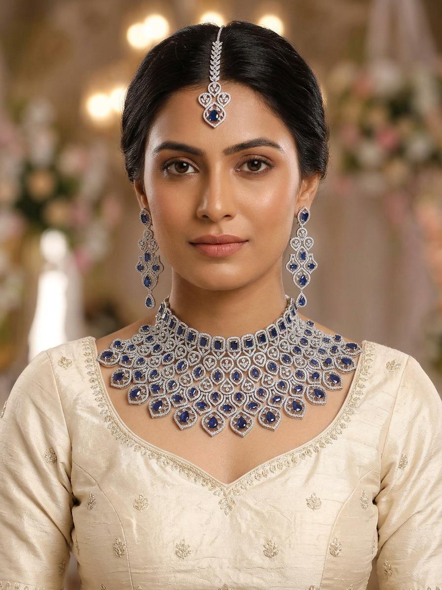 Drawing inspiration from traditional motifs that celebrate nature's exquisite symmetry, this ensemble evokes a sense of timeless grandeur. The vibrant, royal blue hues embedded within the dazzling clear stones mirror the depth and richness of precious gemstones, offering a luxurious aesthetic that transcends fleeting trends. It embodies a spirit of classic beauty that resonates with enduring traditions.