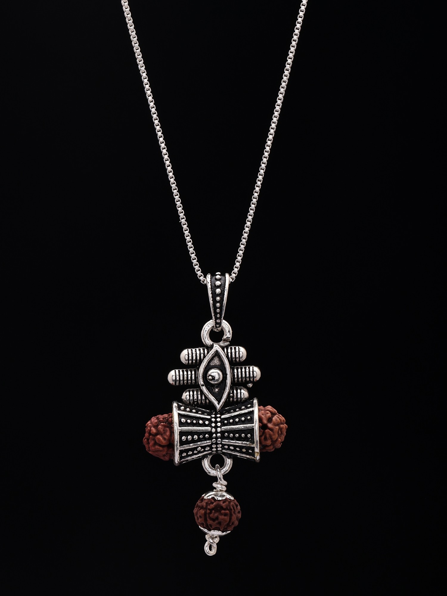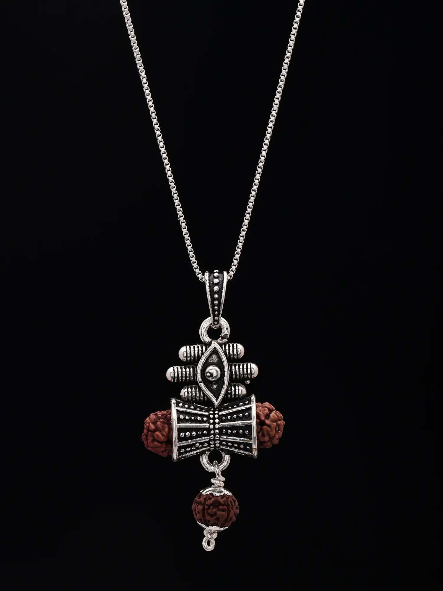 This exquisite pendant is a powerful fusion of spiritual symbolism and fine craftsmanship. At its heart lies the sacred Rudraksha, a seed revered for its divine properties and association with Lord Shiva. The intricate sterling silver setting encircles the Rudraksha, designed to represent the Damru, Lord Shiva's divine drum, whose cosmic sound is believed to create and destroy the universe. The detailed etchings and beaded accents on the silver Damru evoke its rhythmic vibrations and powerful energy.