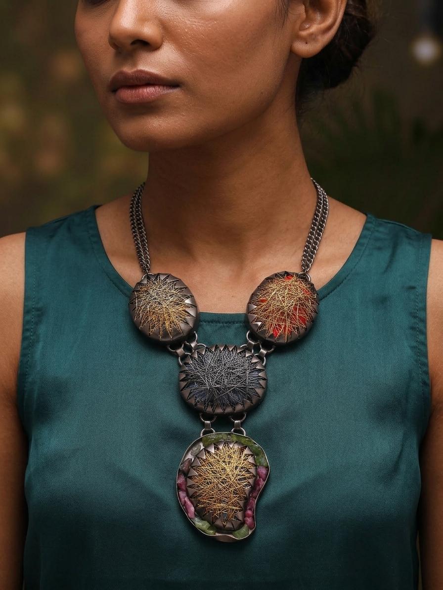Imagine gracing a sophisticated evening gala or a chic art exhibition, where this captivating necklace will undoubtedly draw admiring glances. It is equally suited to adding an unexpected touch of artisanal luxury to a more understated daytime look, transforming everyday moments into opportunities for self-expression. Wear it to showcase your discerning taste and appreciation for unique, handcrafted treasures.