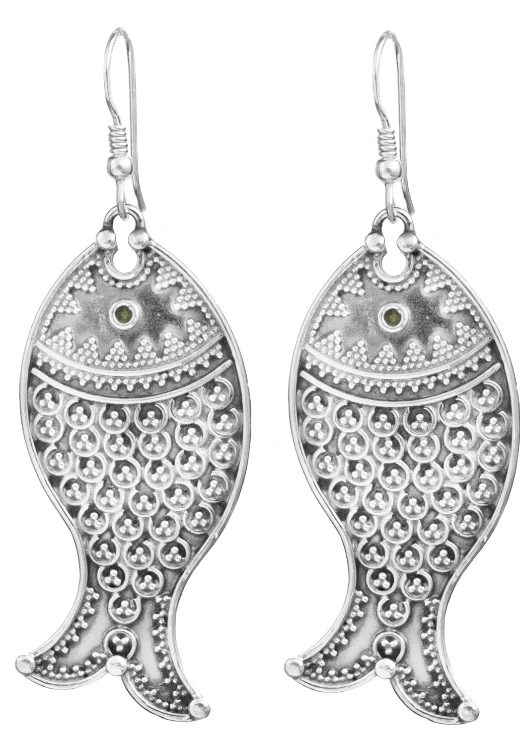 Measuring approximately 1.8 inches in height, these sterling silver creations offer a substantial yet elegant presence. Their form evokes the sleek, flowing lines of a fish, with a captivating textured body that mimics scales. A single, subtle green accent stone graces the head of each, adding a touch of refined color without overpowering the primary design.