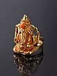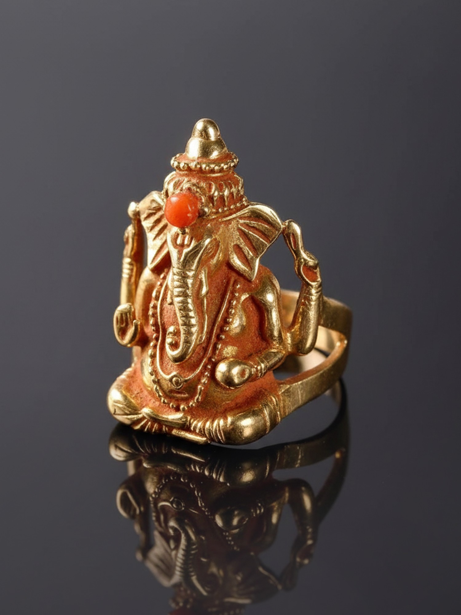 Despite the minuteness of the work and the delicateness of the medium of gold, the all-important iconography has not been compromised on. The multi-tiered crown on His head is elaborate, fit for His status as a divine prince. His clothing and shringar are replete - His legs in ardha-padmasana clad in a silk dhoti, long necklaces, and bracelets on all four arms. He is the son of Shiva, so a trishool (trident) tilak has been engraved at the base of the trunk. Right above it is a piece of finely polished coral, marking the crest of the Lord. Donning this simple item of jewellery would ensure that His blessings shower upon everything you undertake with the hand that wears it.