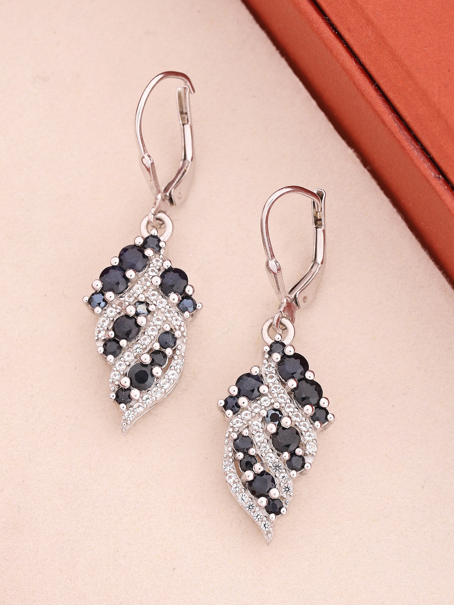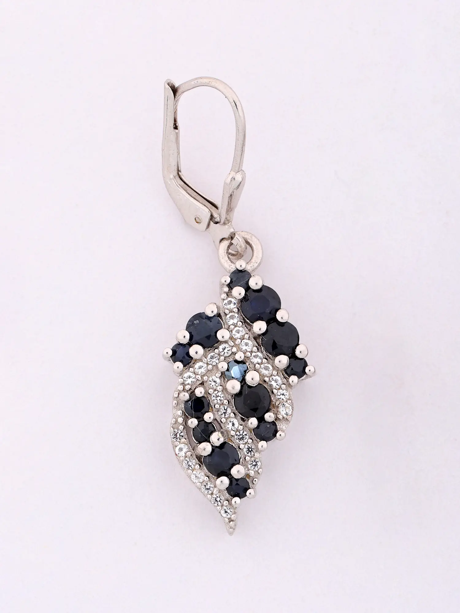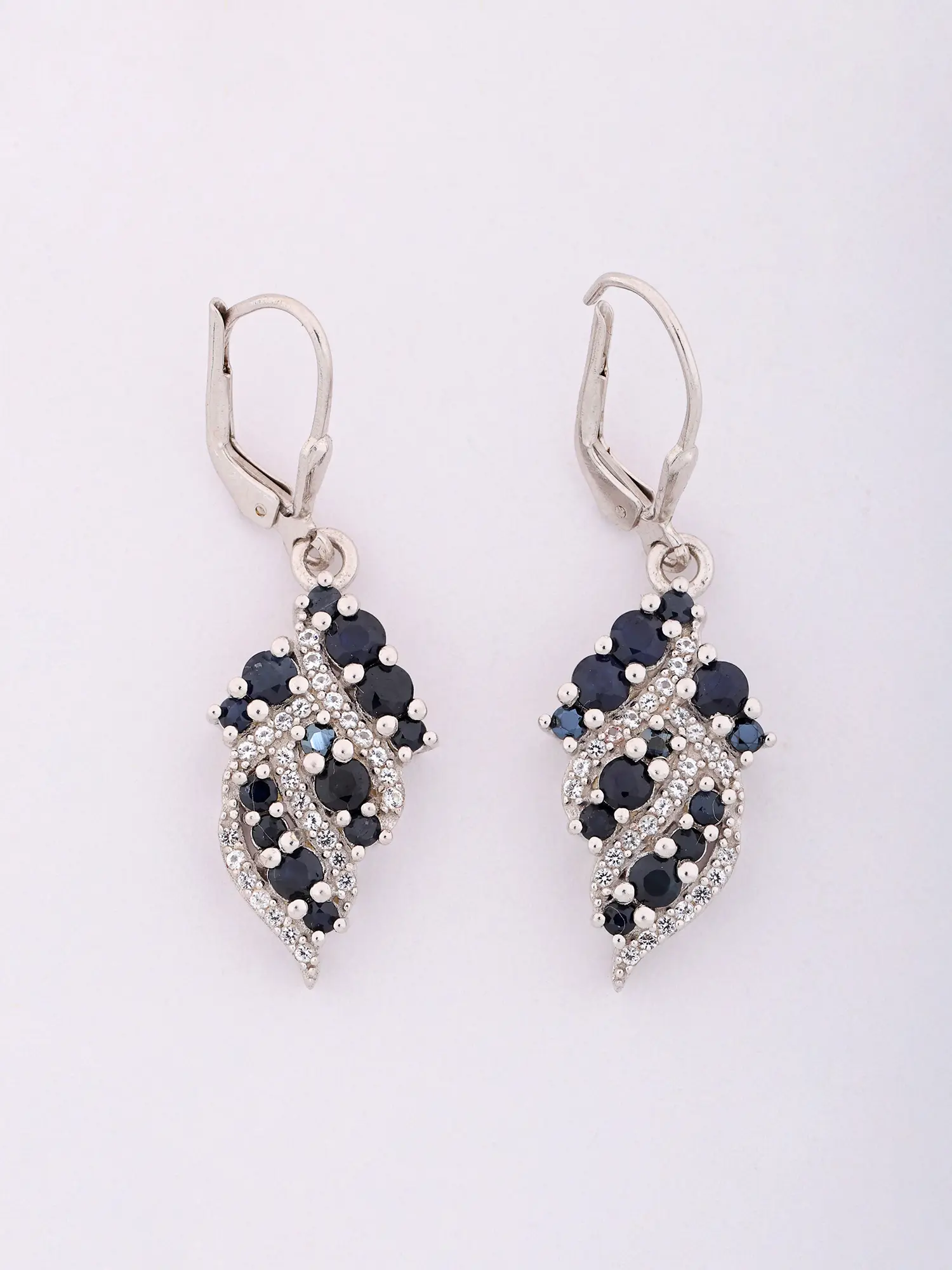 These striking pieces feature a sophisticated leaf motif, rendered in shimmering sterling silver and adorned with deep, captivating sapphires and an abundance of brilliant cubic zirconia. The contrast between the rich blue stones and the clear, sparkling accents creates a dynamic visual appeal. Measuring approximately 1.5 inches in height and just 0.2 inches in width, their size is perfectly balanced for statement-making elegance without being overwhelming.