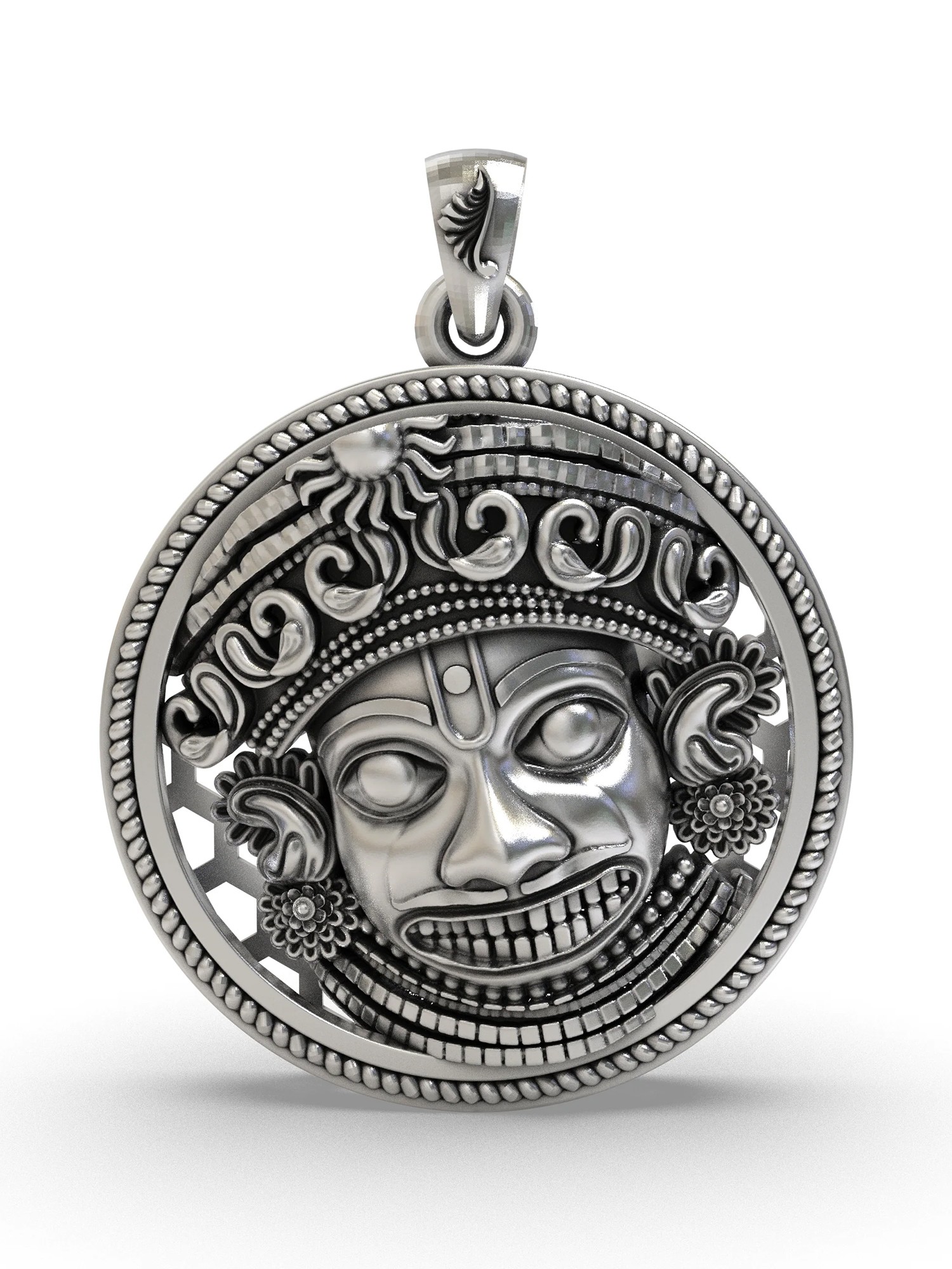 This pendant has been expertly fashioned from sterling silver, lending it a timeless quality. The design showcases a striking antique finish, enhancing the depth and texture of the piece. The artistry captures every nuance of the deity's expression, from his focused gaze to his benevolent smile. A delicate rope-like border surrounds the central image, adding a touch of refined elegance. The pendant's loop is seamlessly integrated, allowing it to hang gracefully from your favorite chain. Its compact dimensions make it suitable for everyday wear while remaining visually impactful.