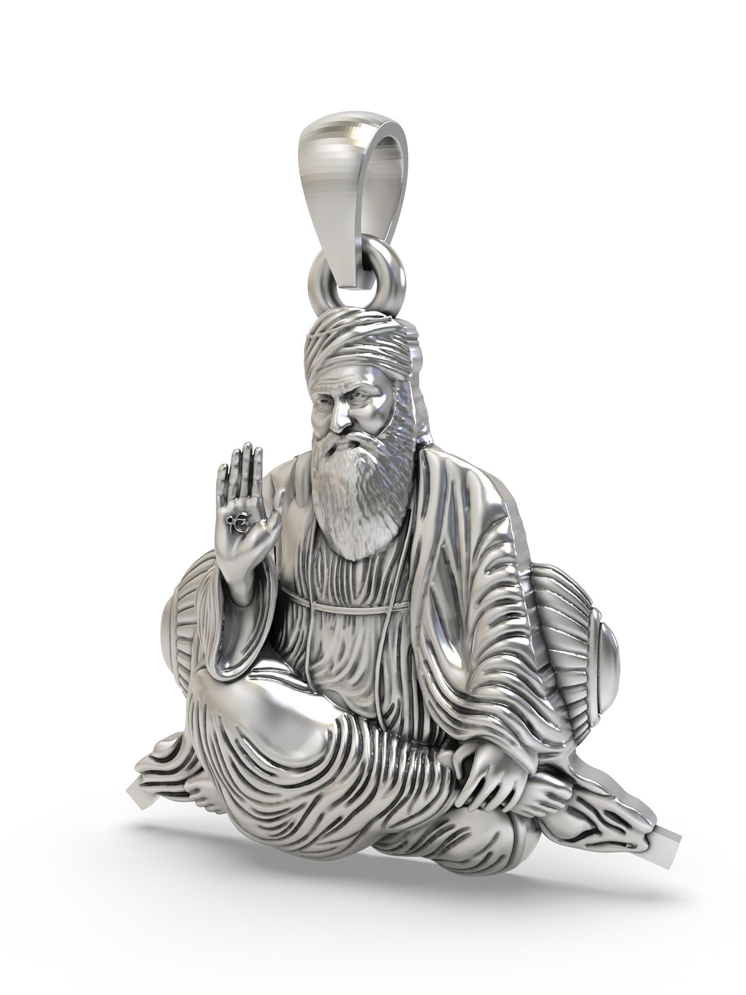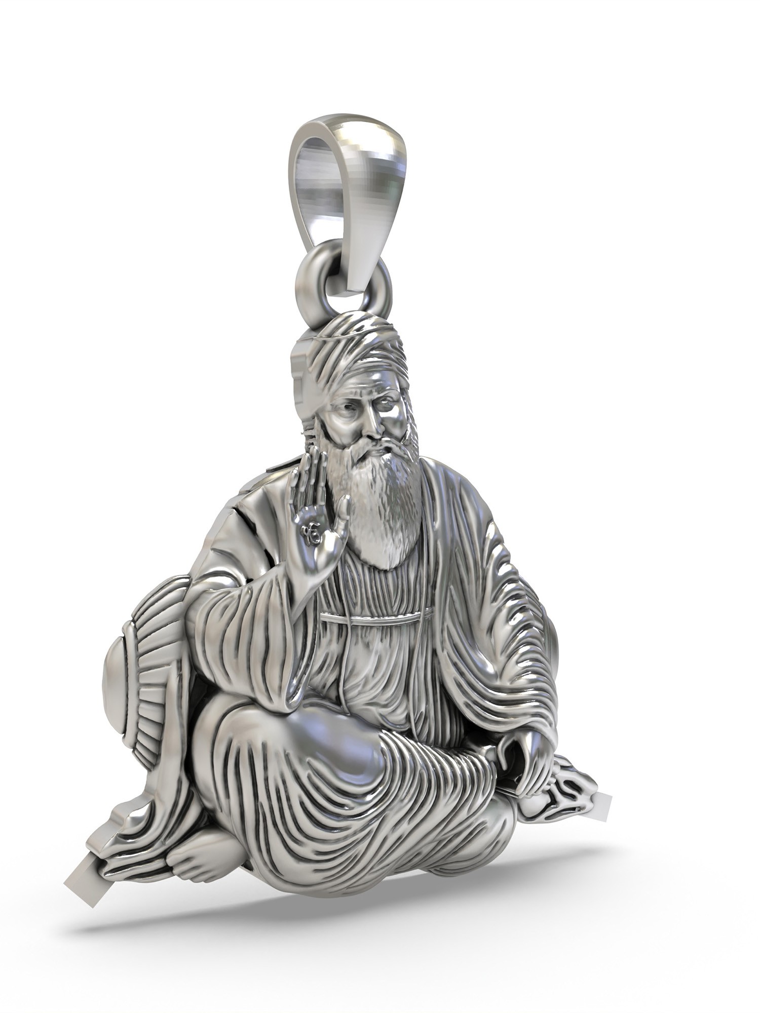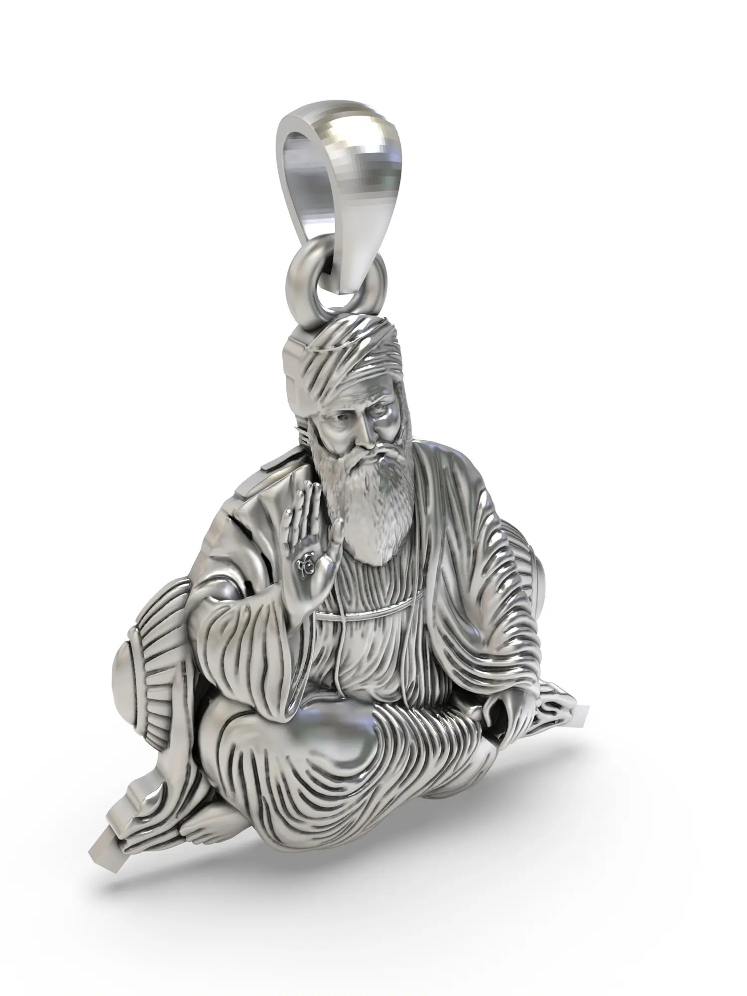 This exquisitely crafted pendant captures the serene presence and wisdom associated with a revered figure. Meticulously detailed, it presents a lifelike representation, reflecting a profound respect for the subject matter. The intricate folds of the clothing, the detail in the face and beard, and the symbolic gesture of the hand all contribute to a compelling piece of wearable art. Notice the careful rendering of textures, from the smooth surfaces to the finely etched details that enhance the overall aesthetic.