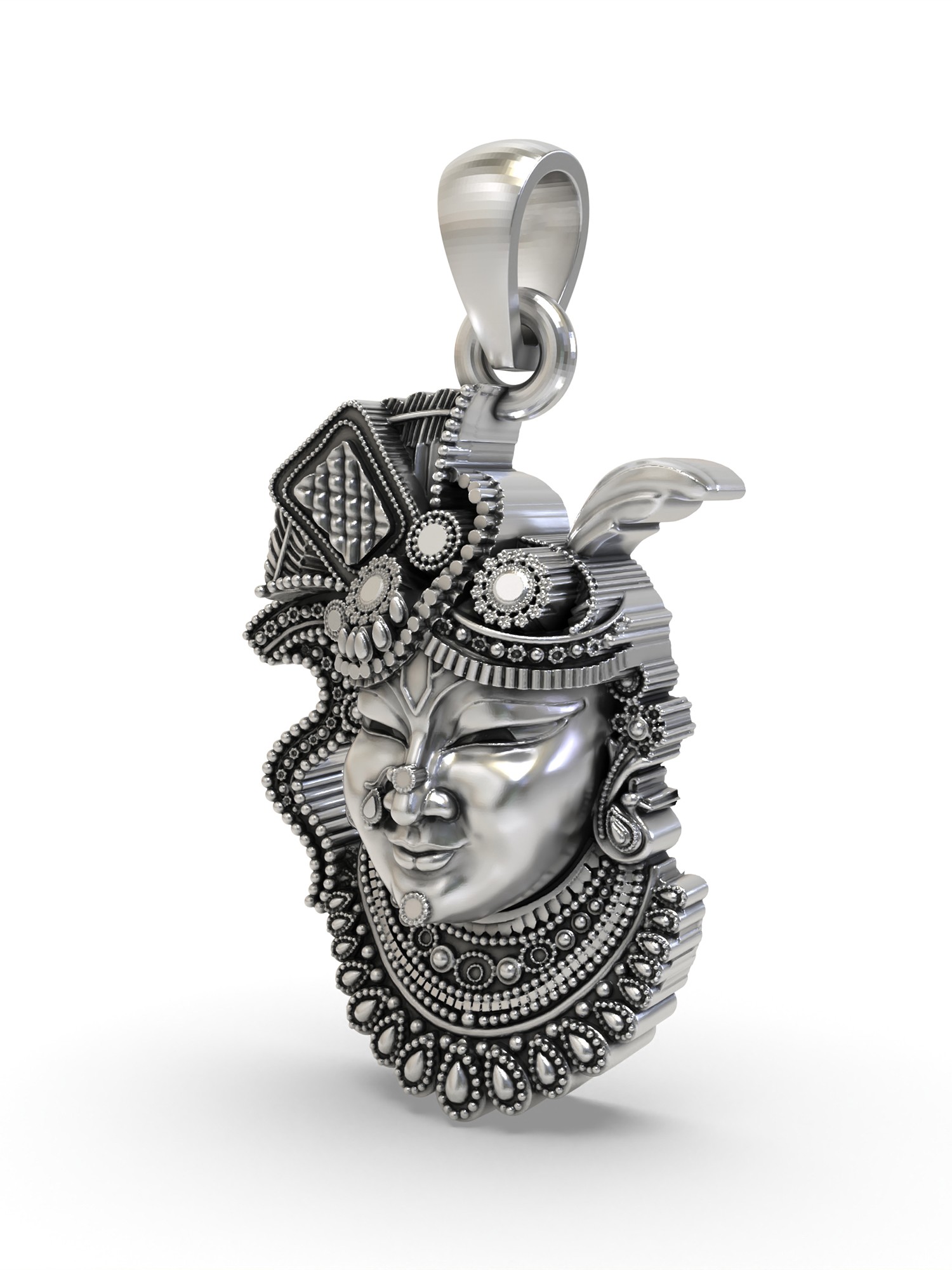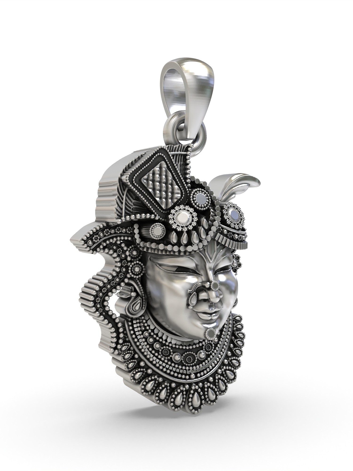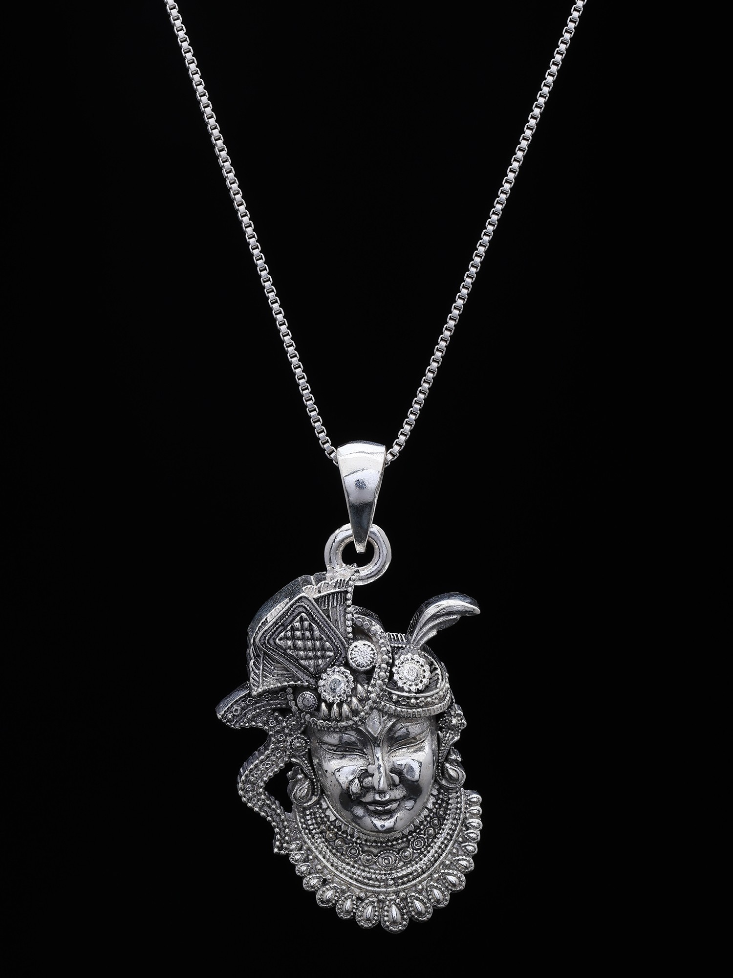 Crafted with meticulous attention to detail, this sterling silver pendant captures the serene and benevolent countenance of Shrinathji. This piece is not merely an adornment, but a wearable emblem of faith, a constant reminder of devotion and grace. It's an exquisite fusion of artistry and spirituality, designed for those who seek a tangible connection to their beliefs. The pendant's design intricately depicts Shrinathji's face, capturing the deity's gentle expression and ornate attire. Every curve and contour is rendered with precision, creating a lifelike representation that exudes peace and tranquility. The subtle gleam of the sterling silver enhances the divine aura of the pendant, making it a captivating piece to wear and cherish.