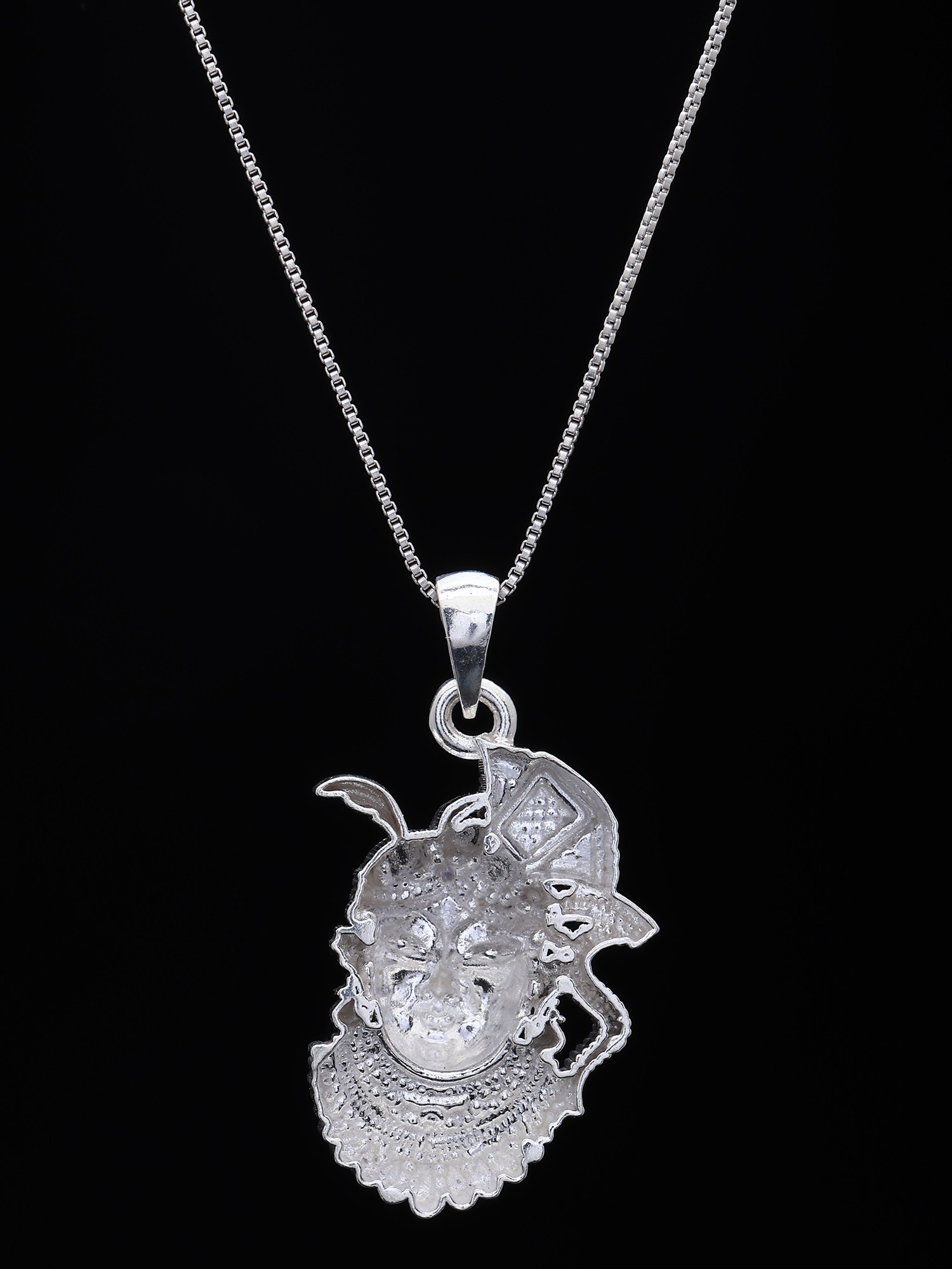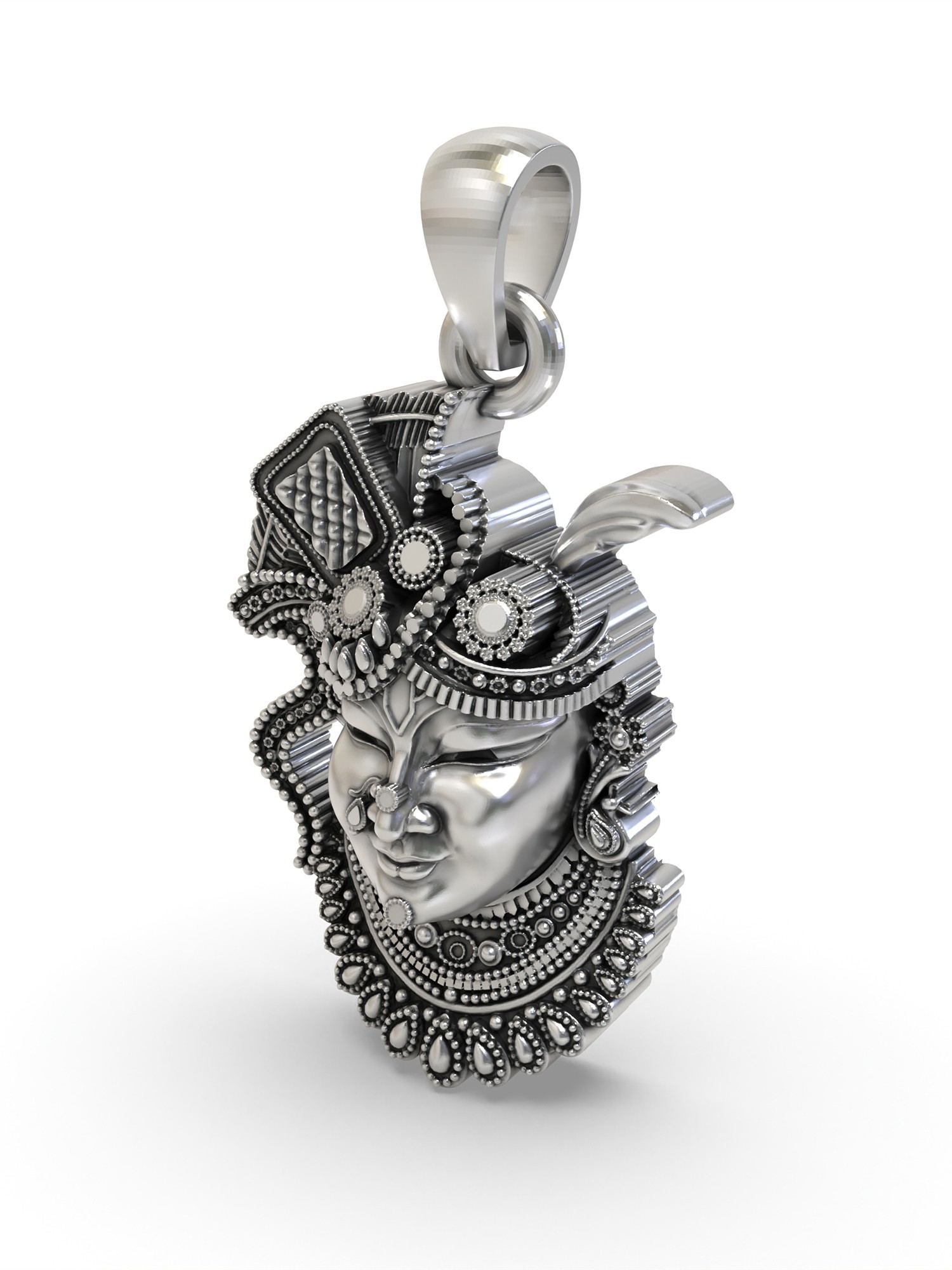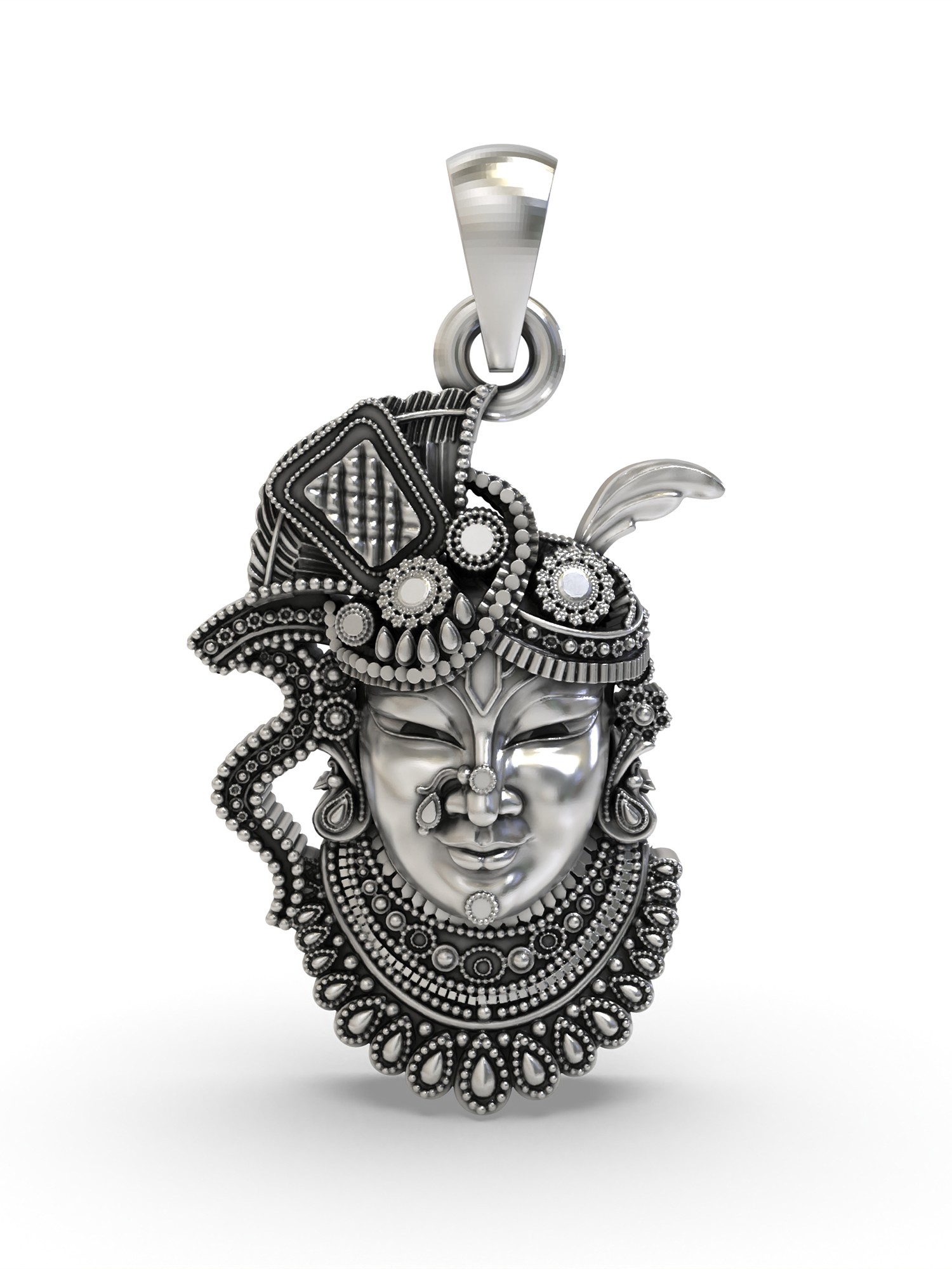 Crafted with meticulous attention to detail, this sterling silver pendant captures the serene and benevolent countenance of Shrinathji. This piece is not merely an adornment, but a wearable emblem of faith, a constant reminder of devotion and grace. It's an exquisite fusion of artistry and spirituality, designed for those who seek a tangible connection to their beliefs. The pendant's design intricately depicts Shrinathji's face, capturing the deity's gentle expression and ornate attire. Every curve and contour is rendered with precision, creating a lifelike representation that exudes peace and tranquility. The subtle gleam of the sterling silver enhances the divine aura of the pendant, making it a captivating piece to wear and cherish.