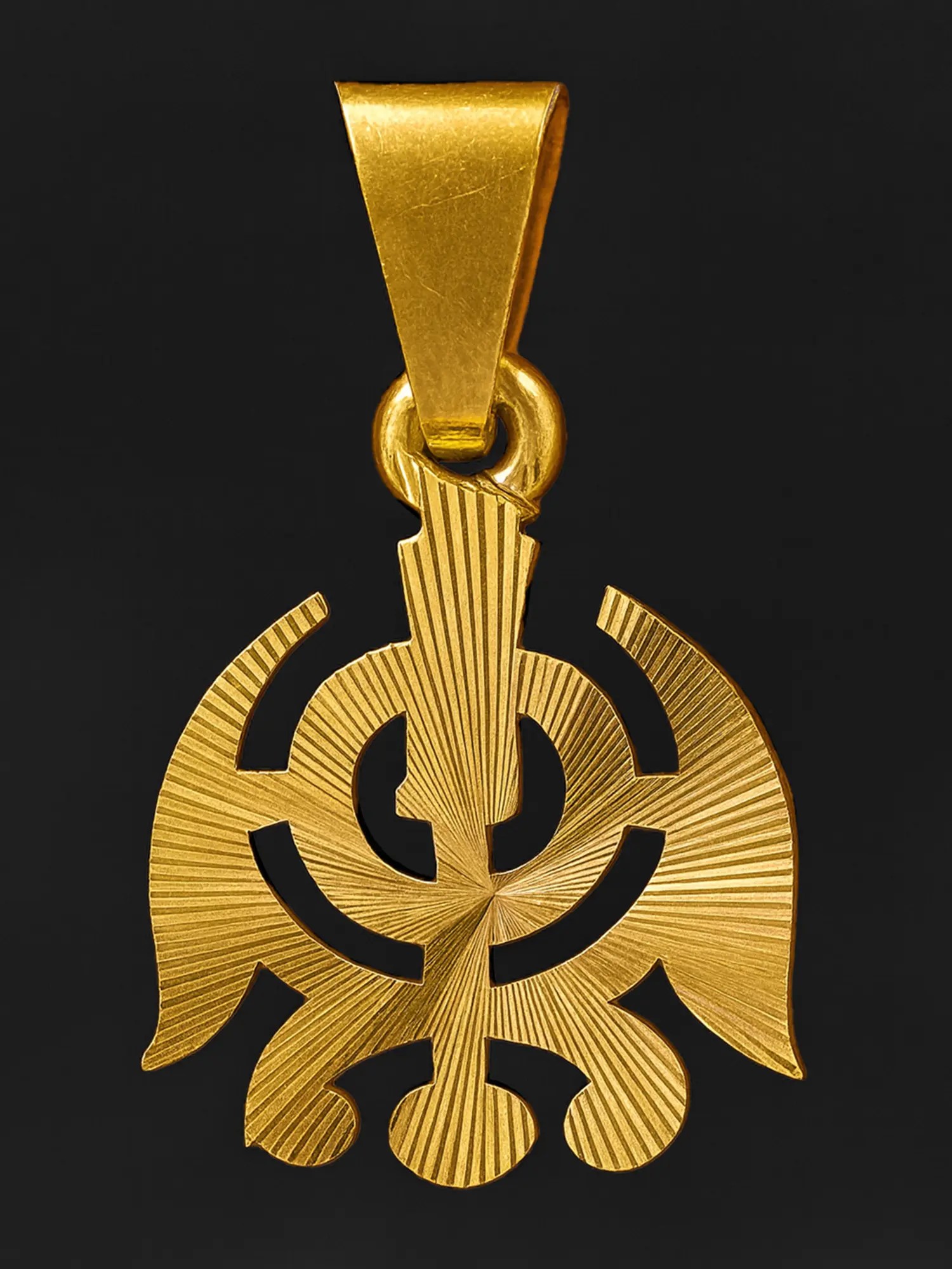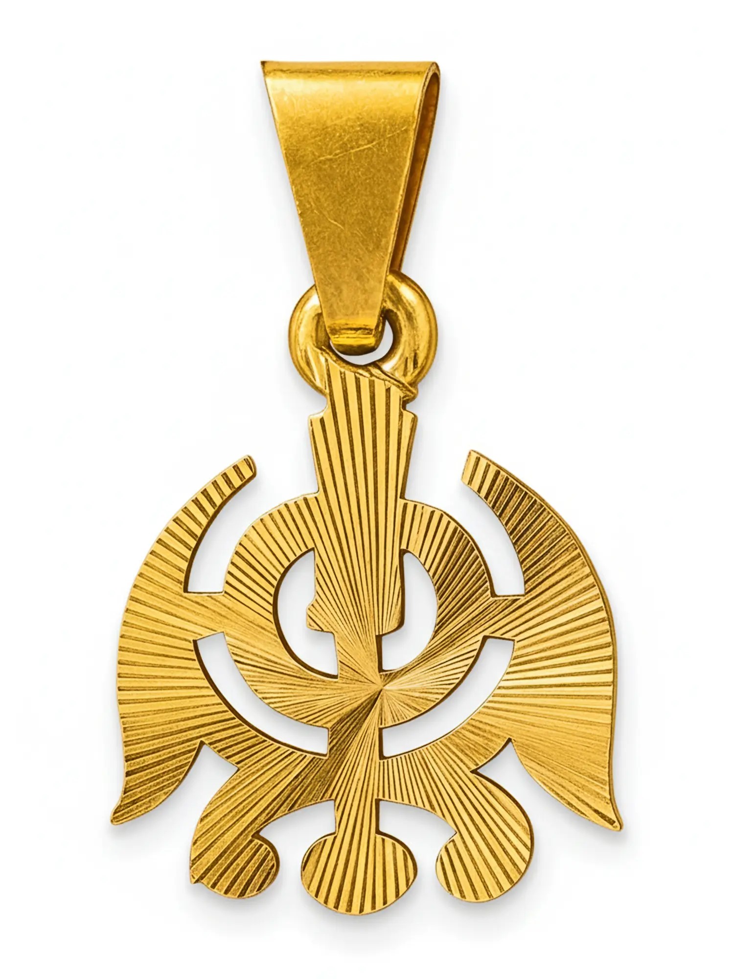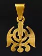 The Khanda, the emblem of the Khalsa faith, is composed of the Khanda (sword), Chakram, and two Kirpans (single-edged daggers). The two Kirpans, known as Miri-Piri, each stand for the fusion of temporal and spiritual dominion. It serves as a reminder of the force and bravery that Sikhism's adherents possess. In Sikhism, khalsa refers to complete loyalty to the Almighty, and the significance of khanda is the duty of khalsa to provide protection and care to those who are in need. The Sikh Khanda Pendant is crafted from flawless 18K gold and comes with the dignity of being an unflinching guardian.