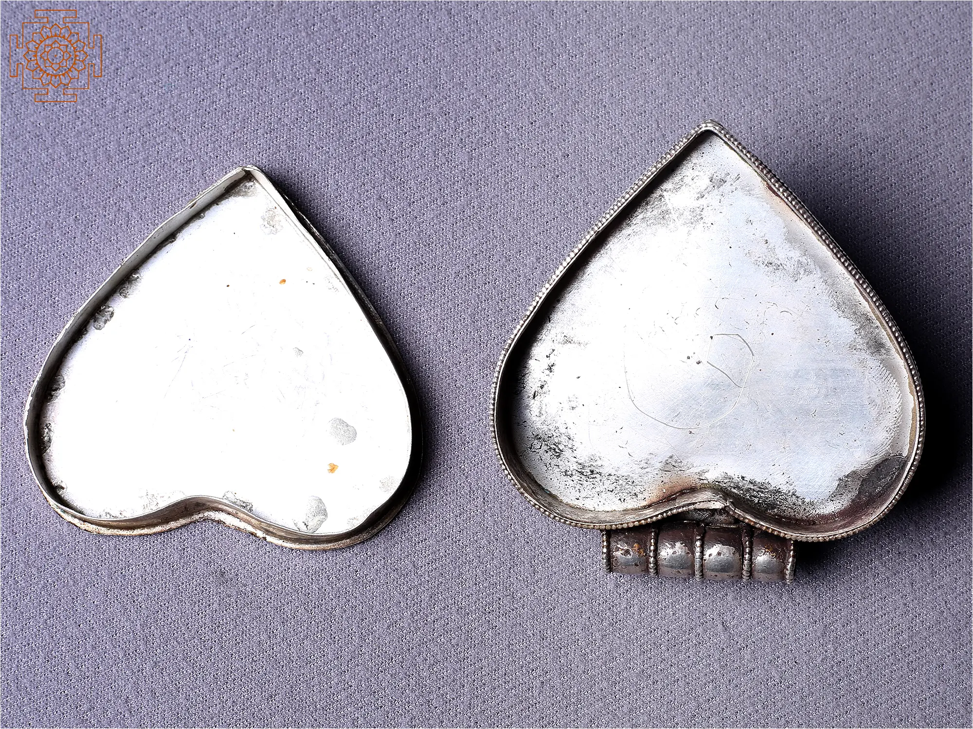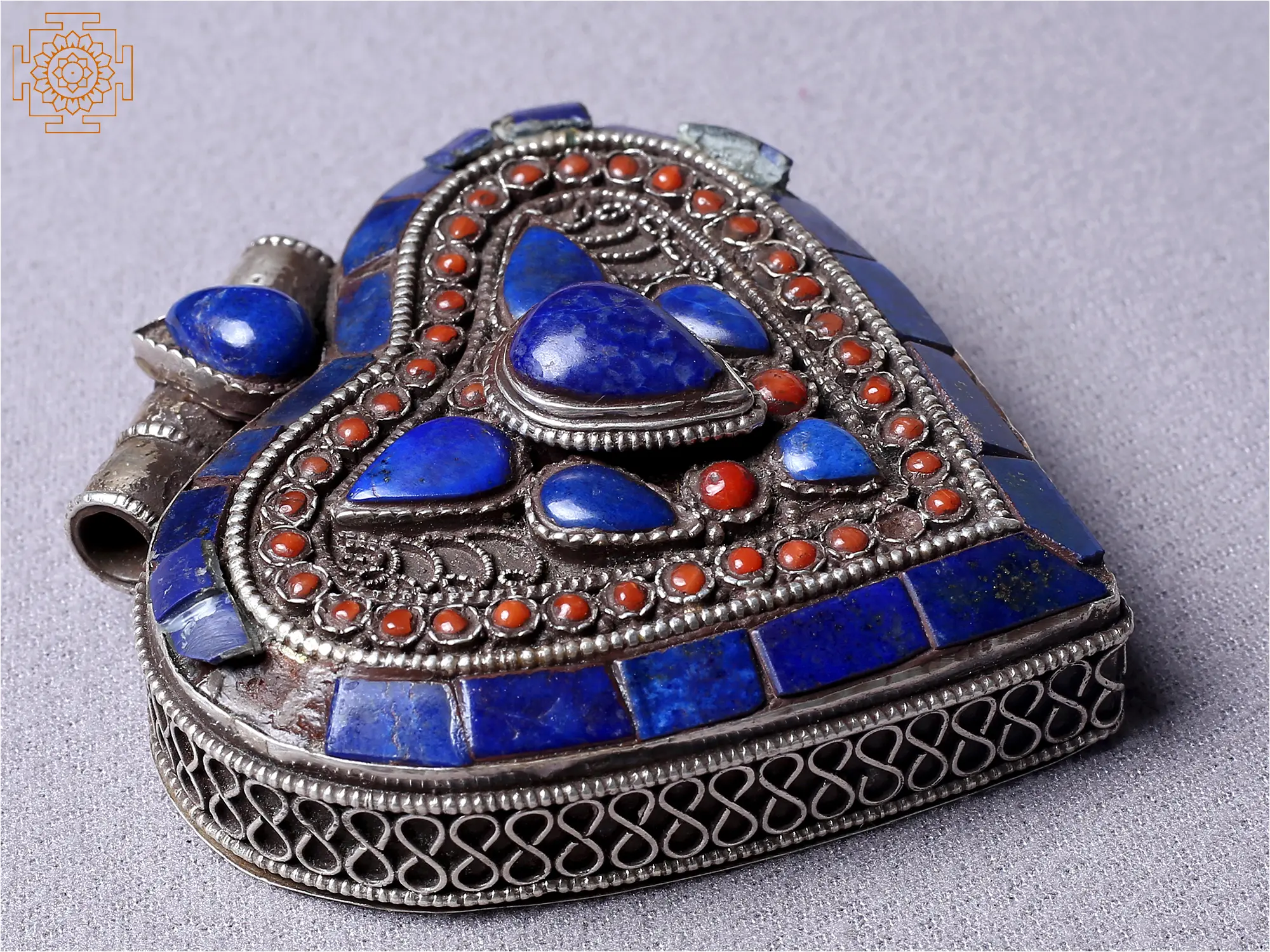 This Silver Heart Ghau Pendant is a unique piece of jewelry that embraces love and spirituality. The beautiful piece is a traditional sacred prayer box, known as Ghau. The heart shape is also the shape of the Pan Patta which is considered auspicious in many traditions. The face of the pendant is ornamented with blue Lapis Lazuli and red stones. It is a Sterling Silver pendant that holds a double Dorje symbol on the backside. Symbolizing protection and affection, the pendant is a visual symphony that resonates with the soul. The Ghau opens to hold sacred relics, affirming its spiritual significance.