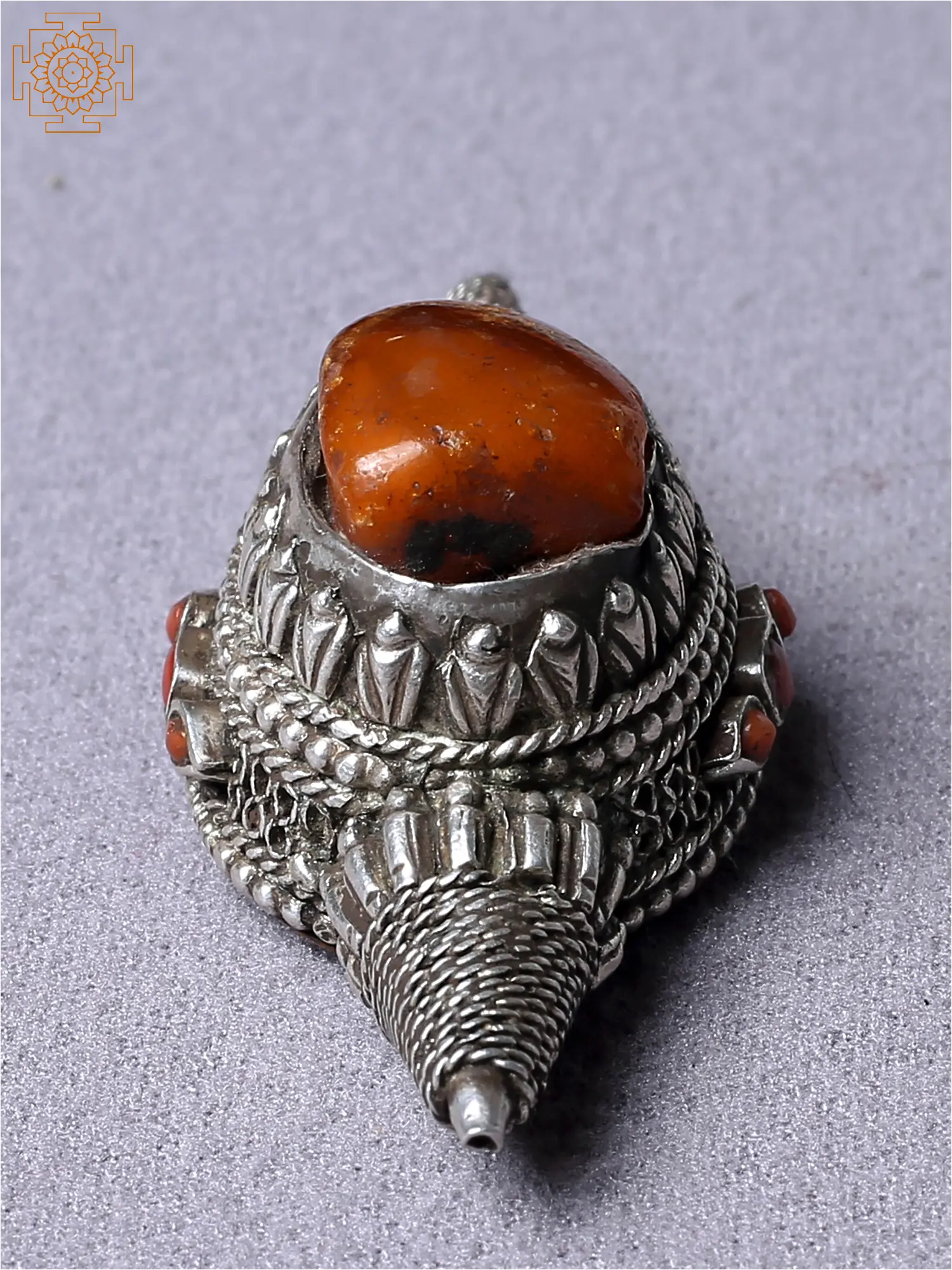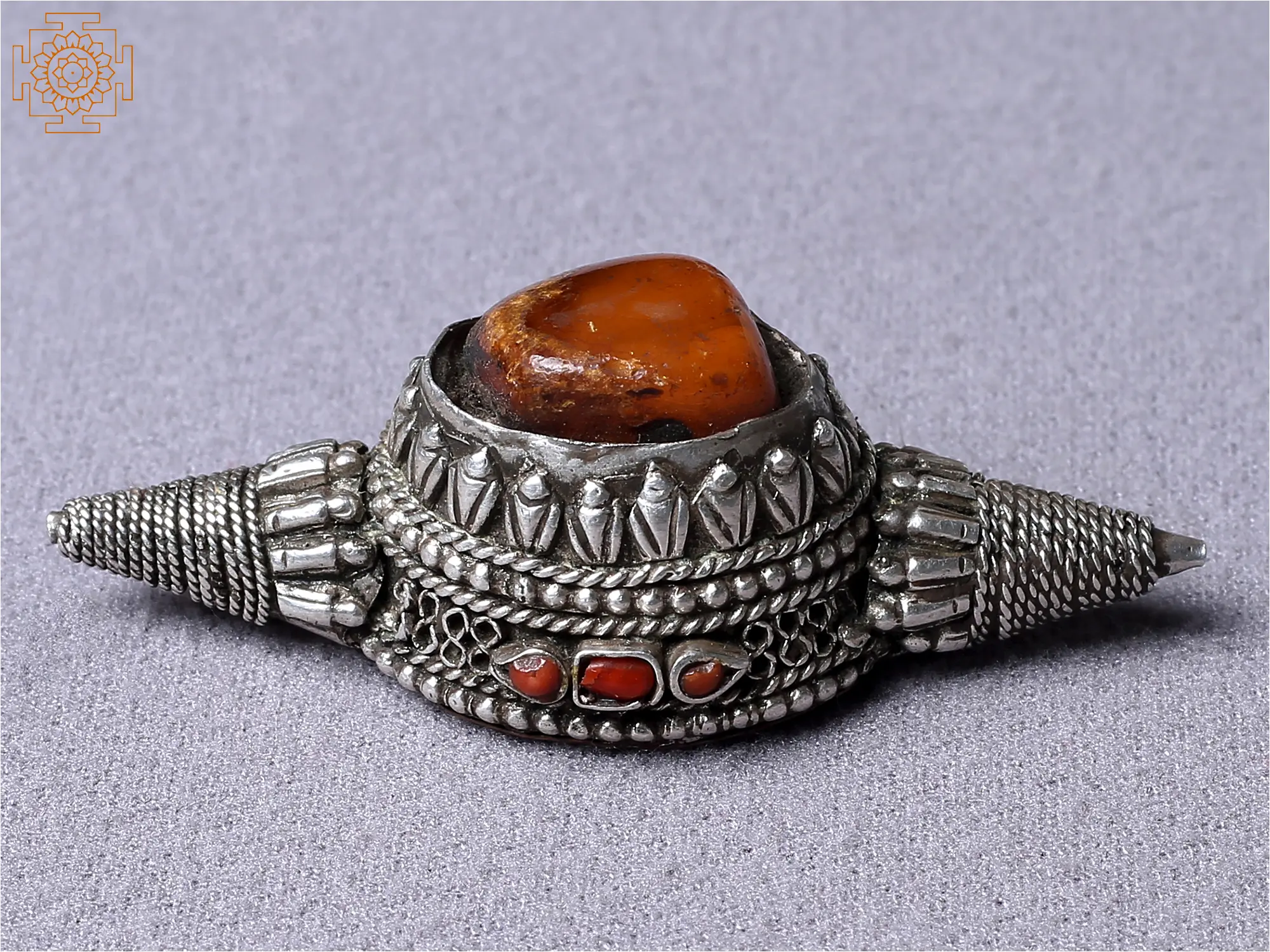 The Tibetan culture has developed accessories that can be used in multiple ways. This Silver Tibetan Red Stone Pendant can also be used as a hair accessory. It is made of Sterling Silver and contains an amber-like stone as the central accessory. It has openings on both conical sides and the thread is passed through the holes to hold the pendant and wear it across the neck. It can be worn on hair bypassing the hair through the holes. These accessories are unique and are considered heirlooms that remain the traditional markers for people of the concerned community.