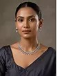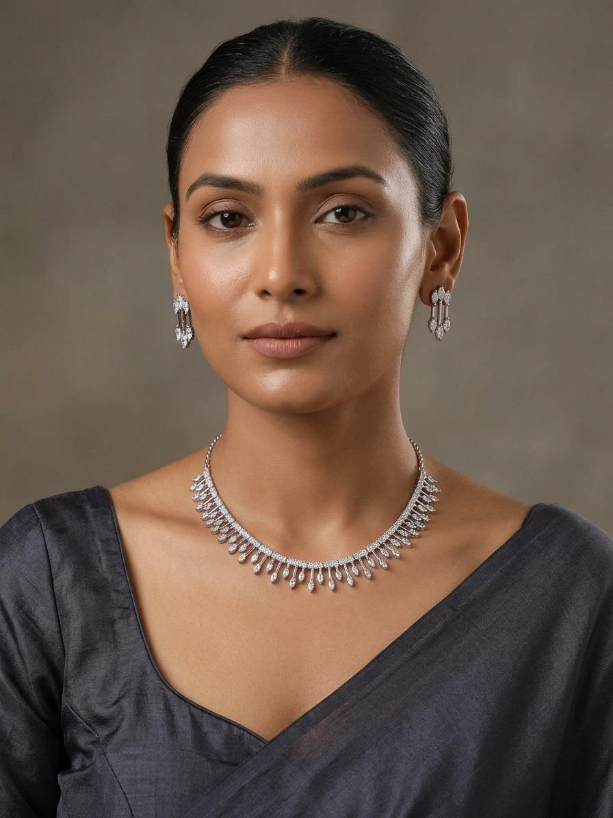 Elevate your style with this beautiful necklace and earring set, designed to add a touch of brilliance to any ensemble. This set is a perfect choice for those seeking a classic yet contemporary look. The cool, silver-tone setting provides a stunning backdrop for the dazzling American Diamonds, creating a radiant effect that will catch the light and turn heads.