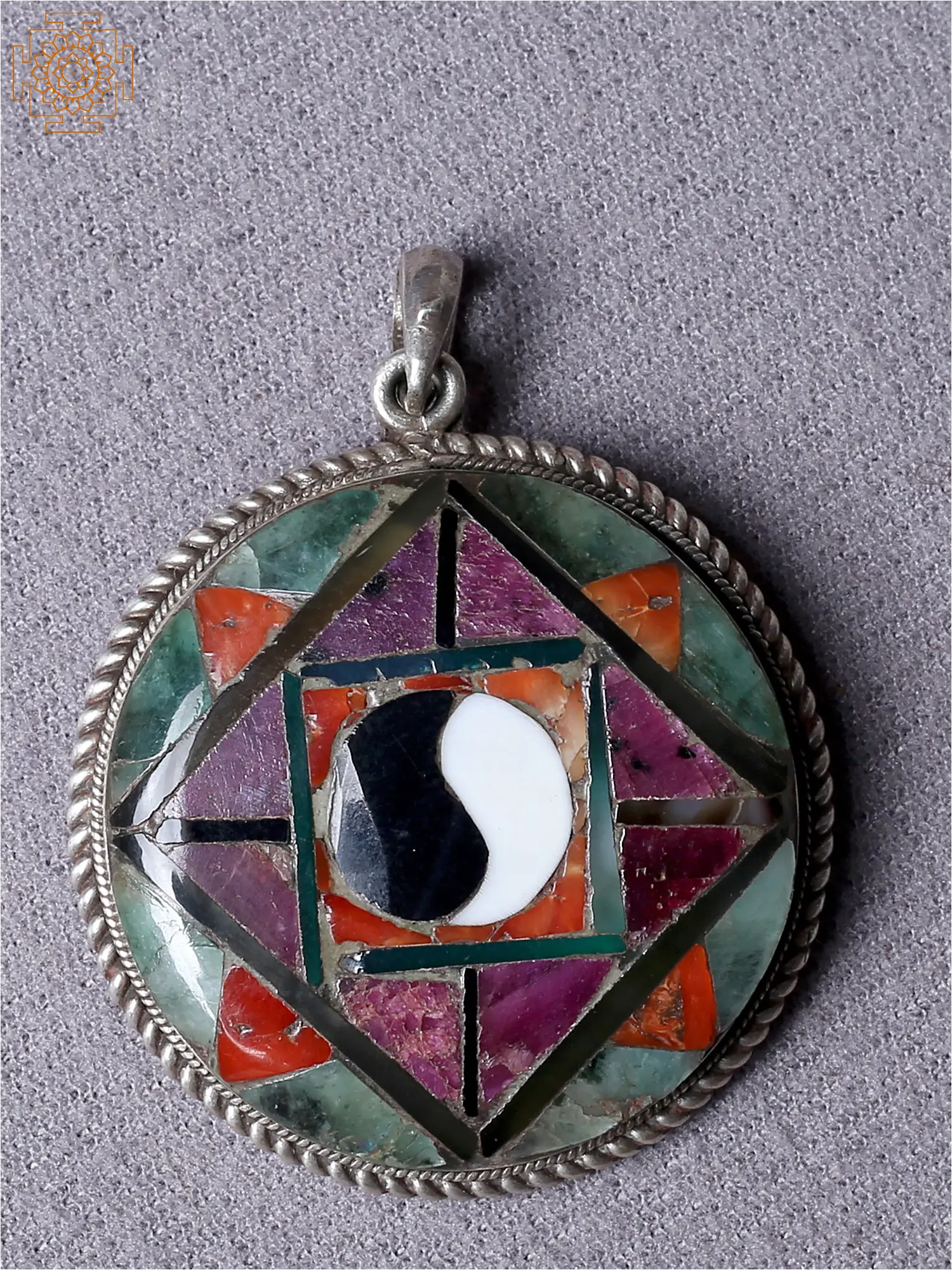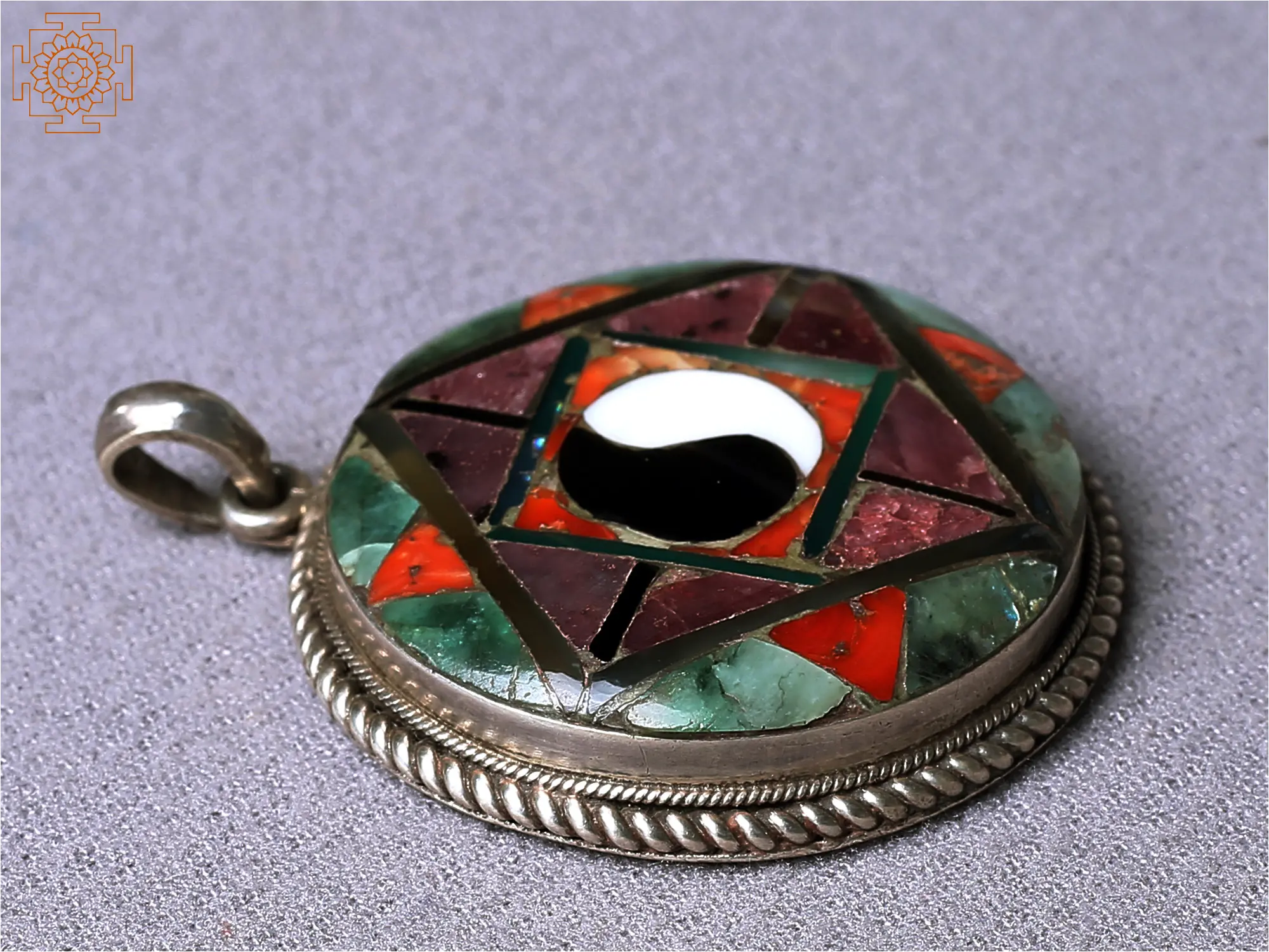 This Silver Yin-Yang Mandala Pendant is a multi-stone mosaic pendant. It is unique in its way. Crafted by placing a multicolored stone in a mandala pattern and blessed with a Yin-Yang motif at the center. The black and white Yin-Yang symbol is surrounded by amethyst and further secured inside a square of turquoise stones. The use of silver and multiple stones infuses multiple energies into the pendant. This pendant with this unique appearance moves away from the contemporary idea of jewelry and becomes a sacred object throughout the journey.