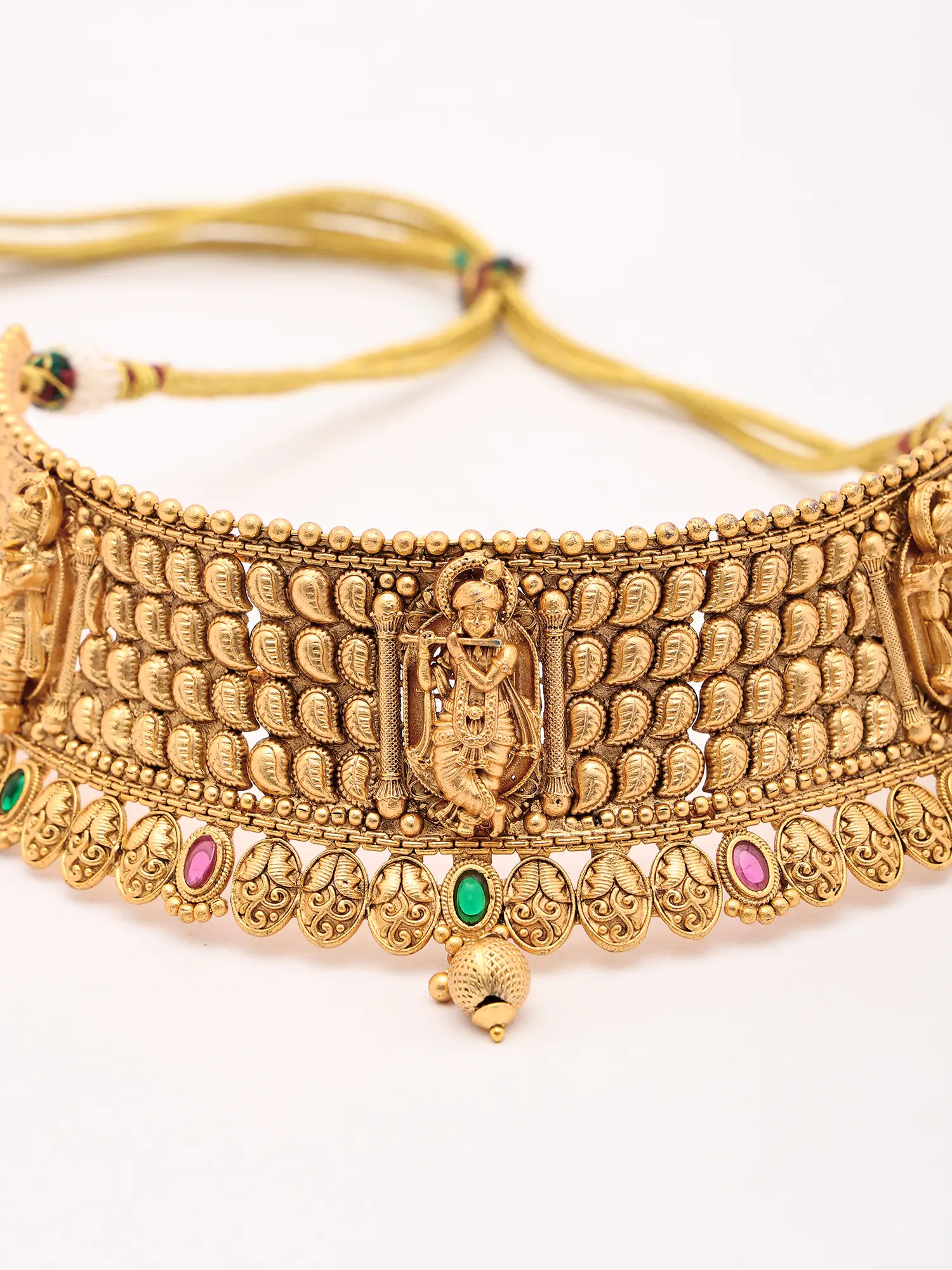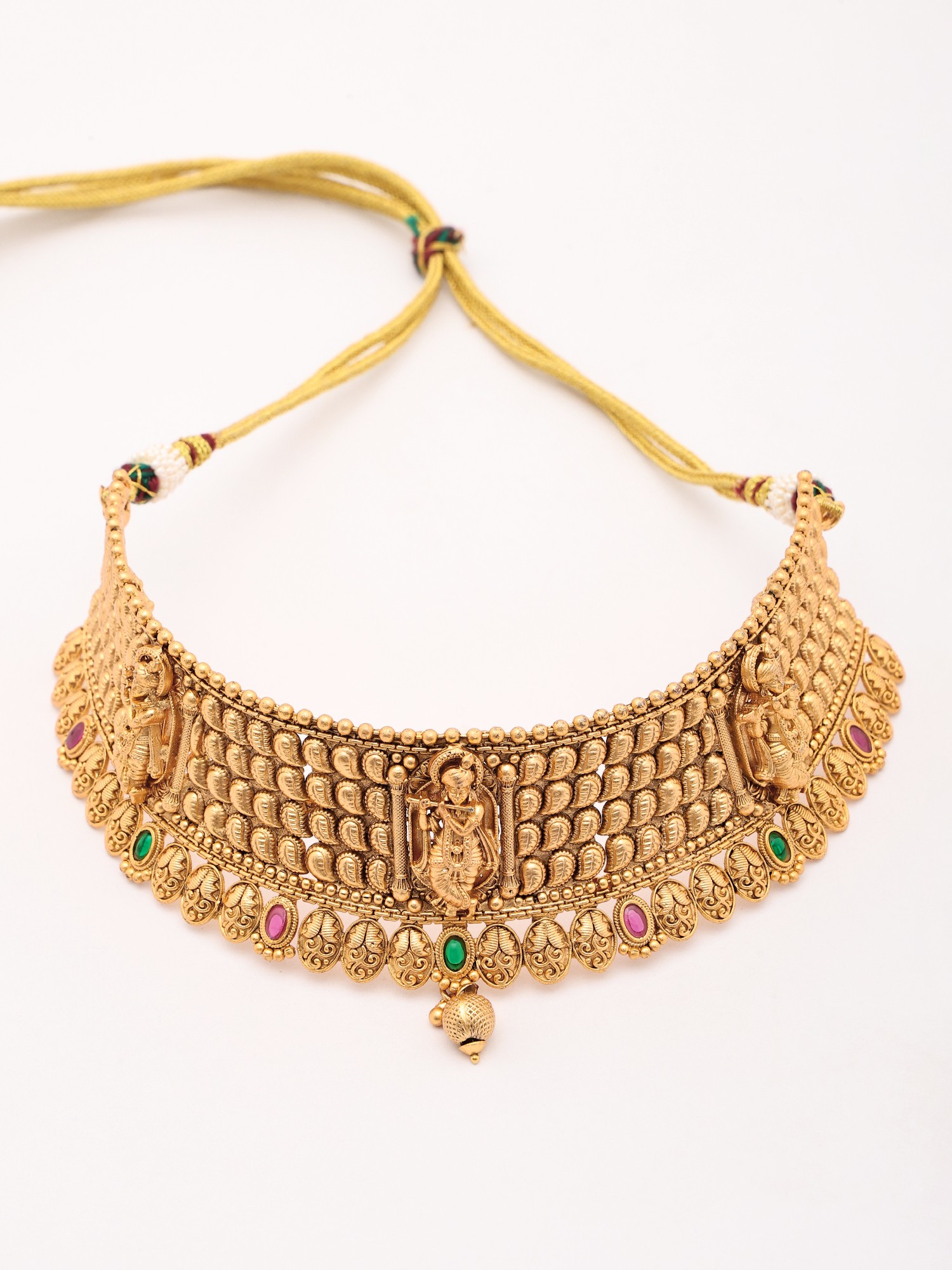 Stone Studded and Beaded Fluting Krishna with Cow Necklace Set with Earrings