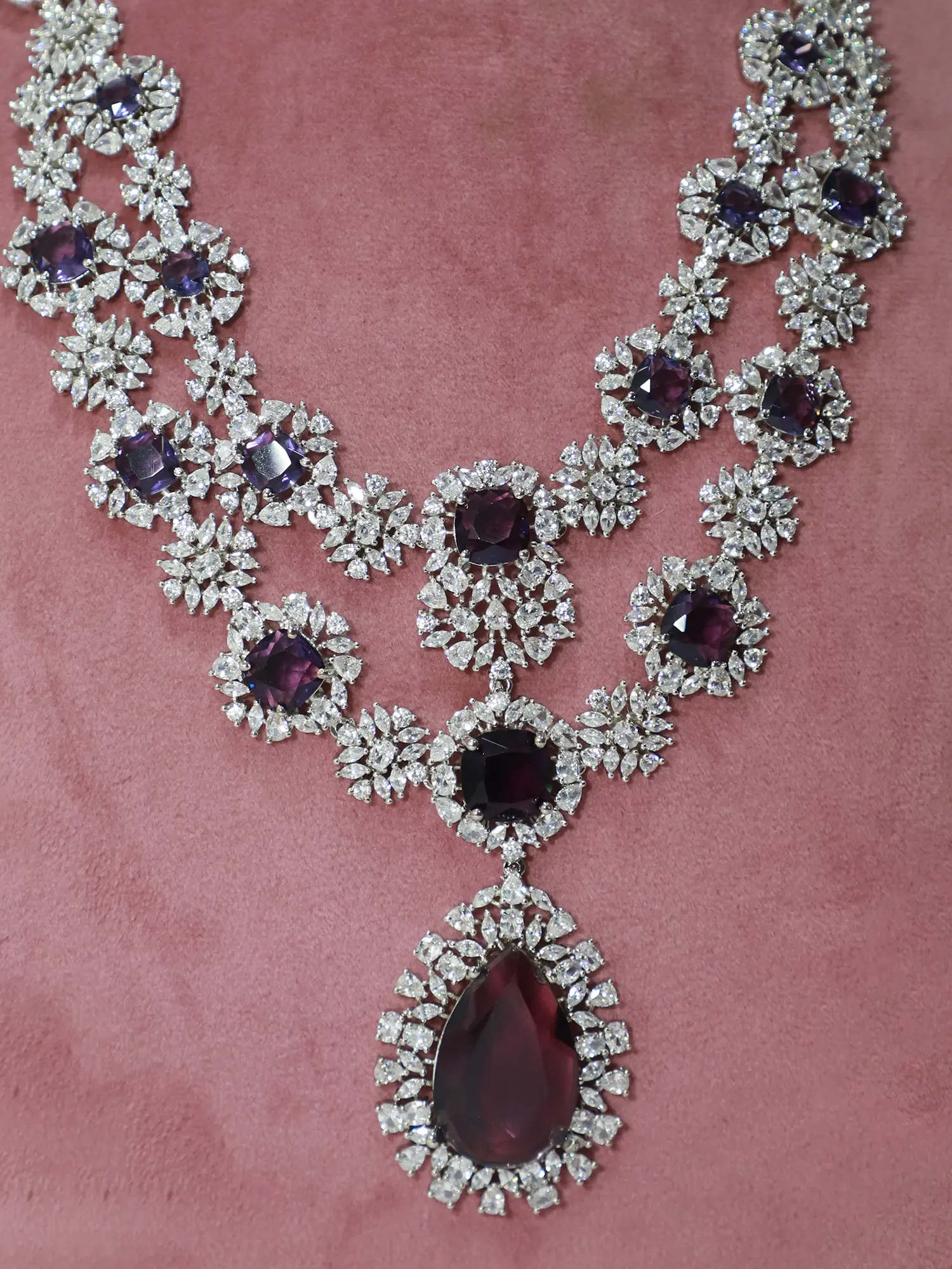 Adorned with a captivating pink gemstone drop on both necklace and earrings.