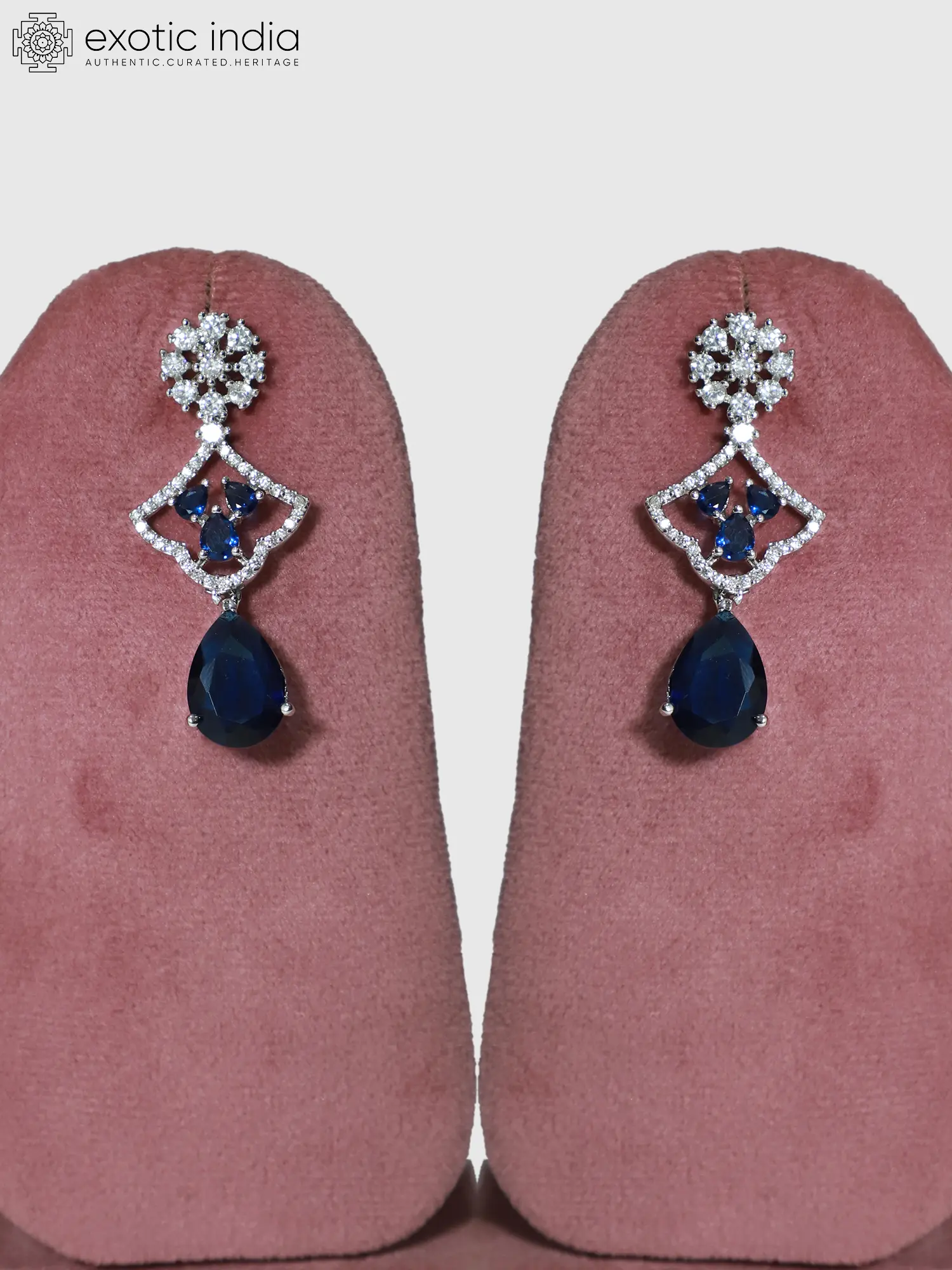 Features captivating teardrop-shaped blue gemstone pendants for a striking contrast.