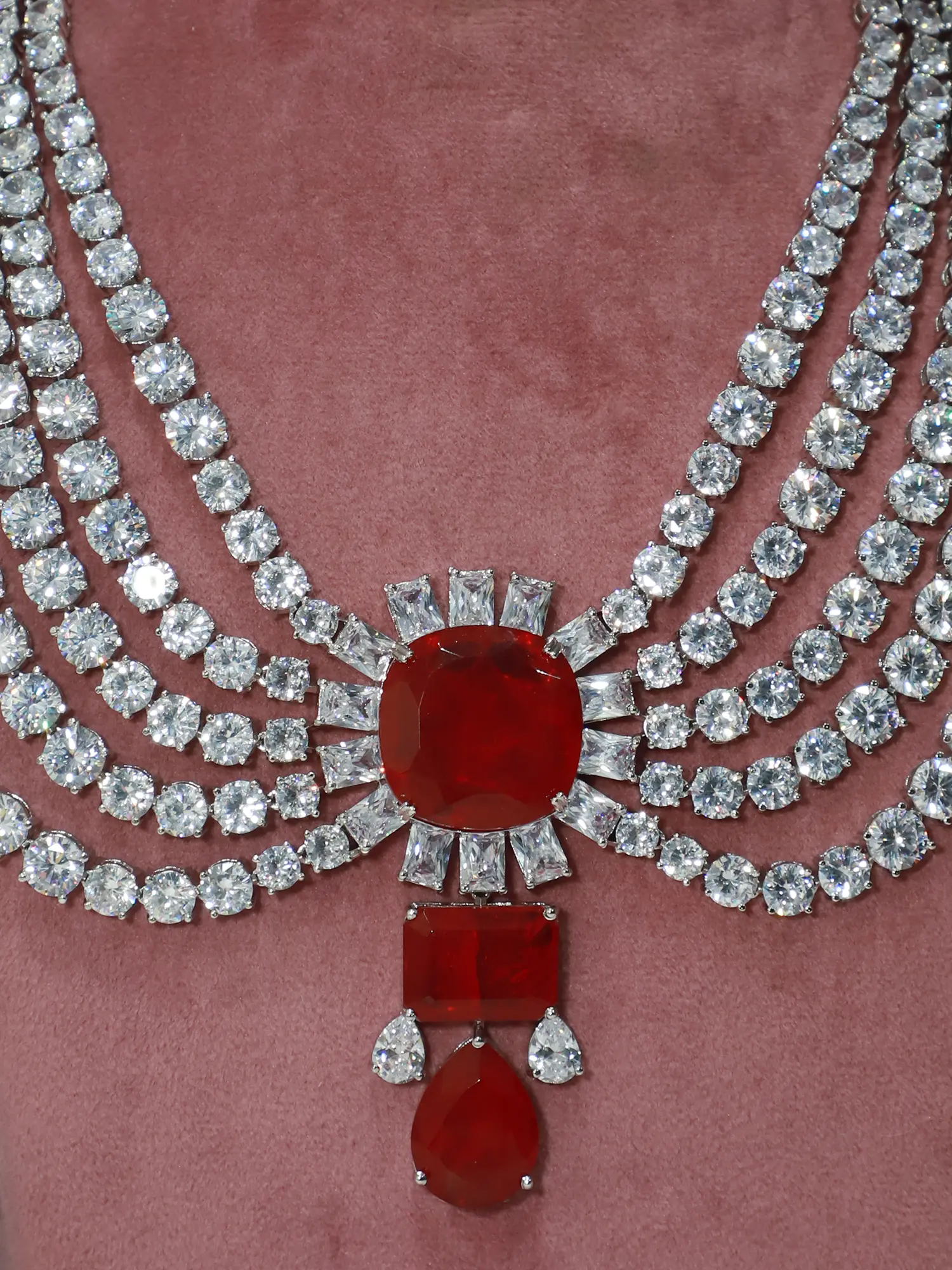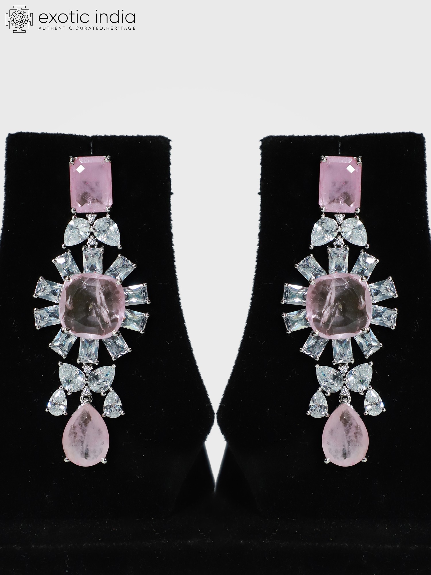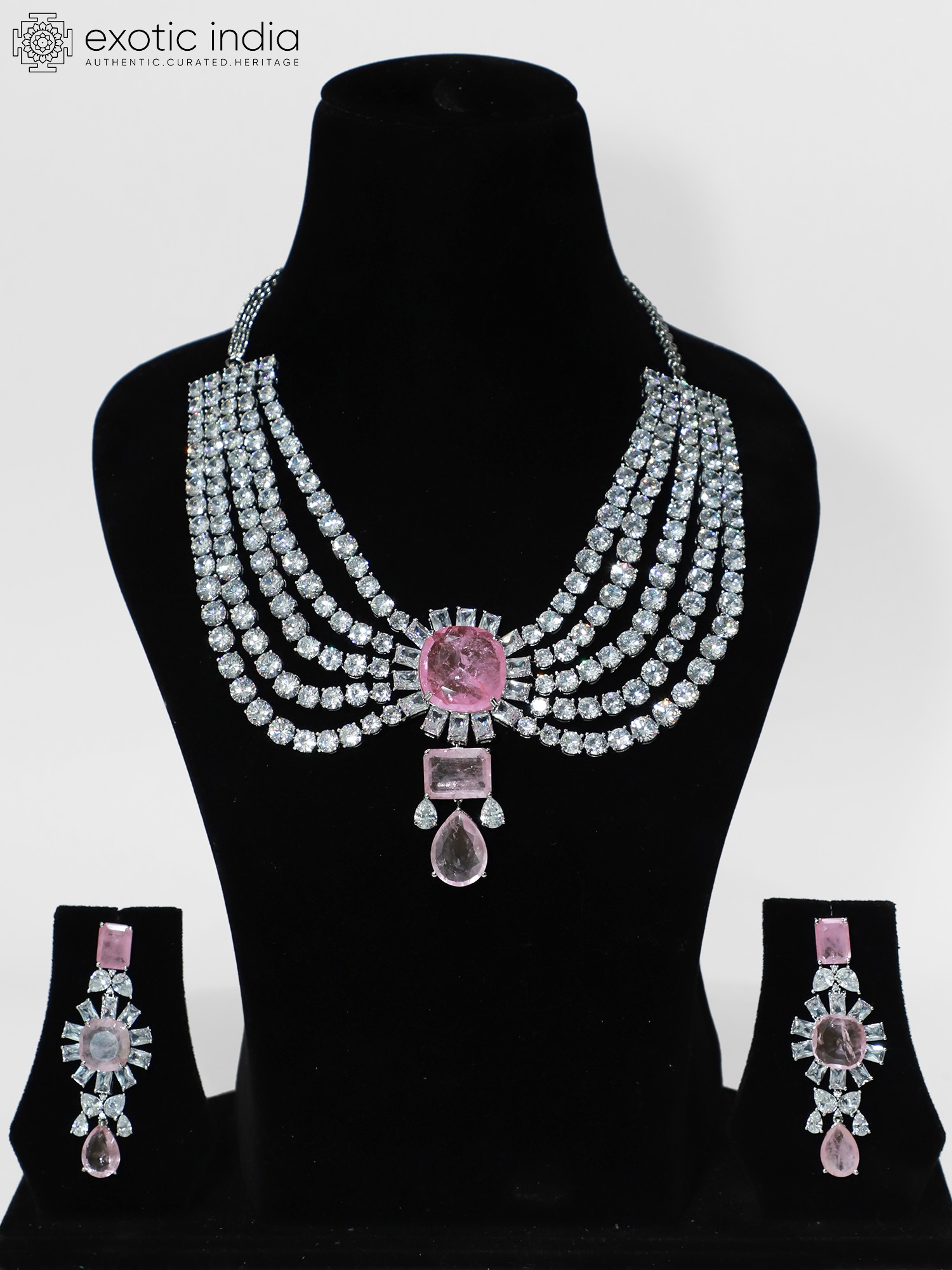 Stone Studded Long Embellished American Diamond Necklace Set With Matching Earrings