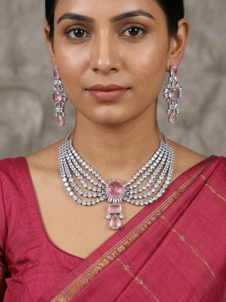 Silver-Tone Stone Studded Elegant American Diamond Necklace Set With Earrings
