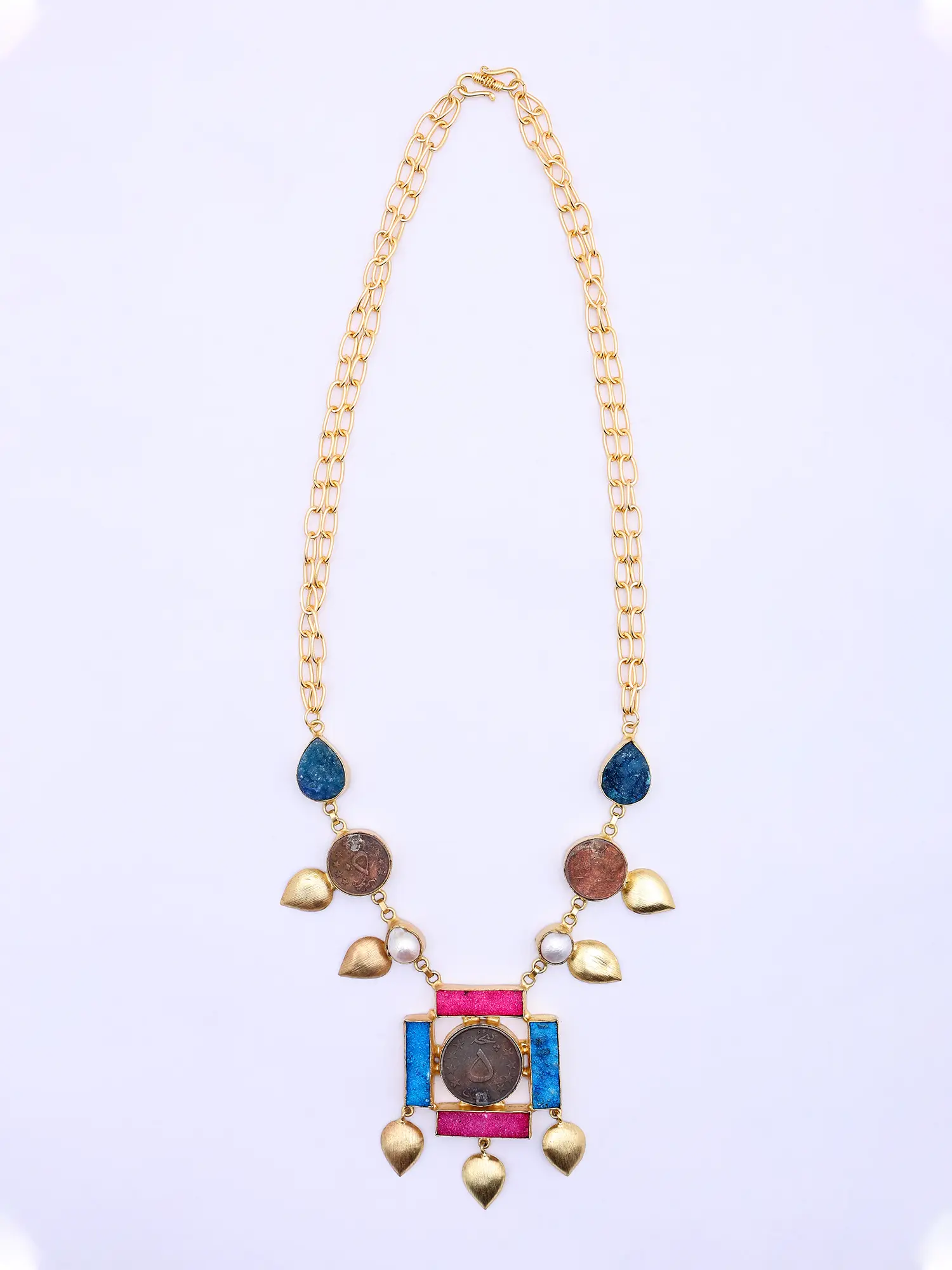 Each component of this remarkable necklace is a testament to meticulous skill. Crafted from lustrous brass, the foundation provides a warm, enduring glow. The central coin, a genuine 50 Baisa from Oman, is carefully integrated, showcasing its intricate engravings. Leaf-shaped gold-tone drops, meticulously formed, add a delicate, organic dimension. Hand-set azure blue and vibrant fuchsia stones frame the centerpiece, accentuating its historical significance and adding a pop of color.