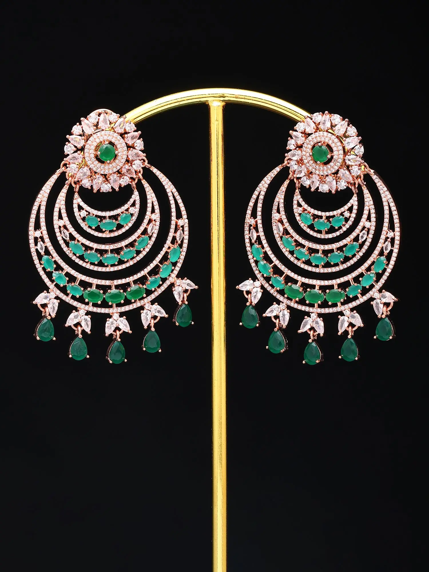 Adorn yourself with three gracefully cascading layers, each encrusted with shimmering cubic zirconia stones that mirror the depth and brilliance of precious gems. Suspended at intervals are radiant, tear-drop shaped peach-colored stones, adding a touch of delicate warmth and captivating color. The overall design boasts a generous presence, measuring approximately 3 inches in height and 1.8 inches in width, ensuring they frame your face beautifully without feeling heavy.