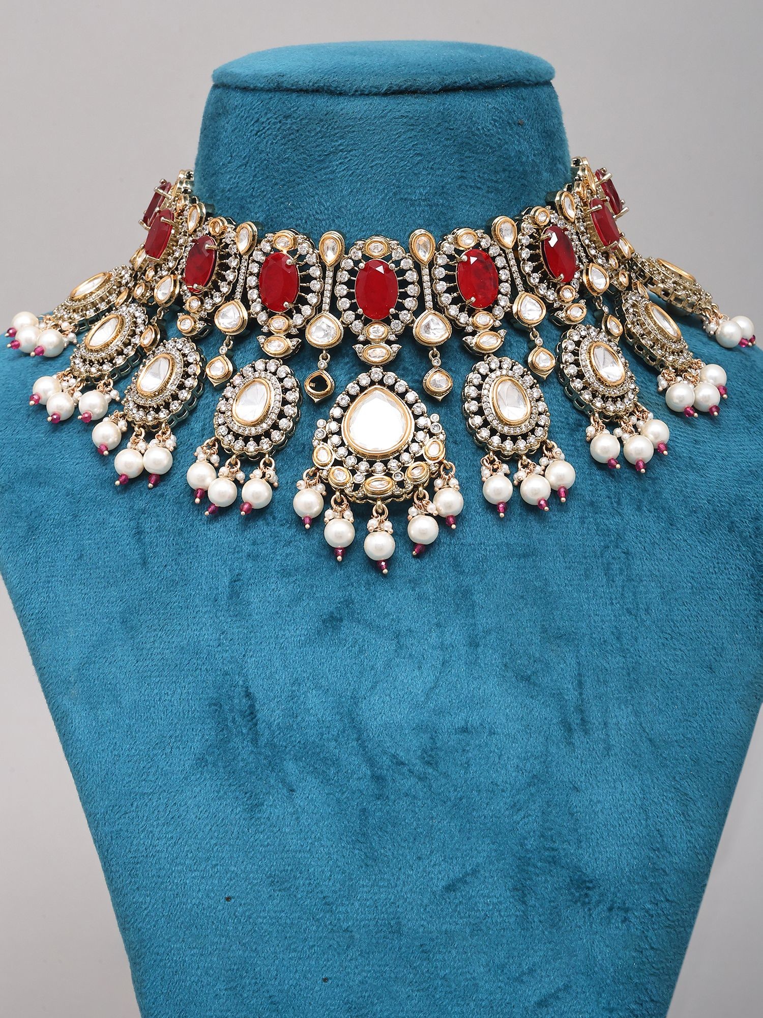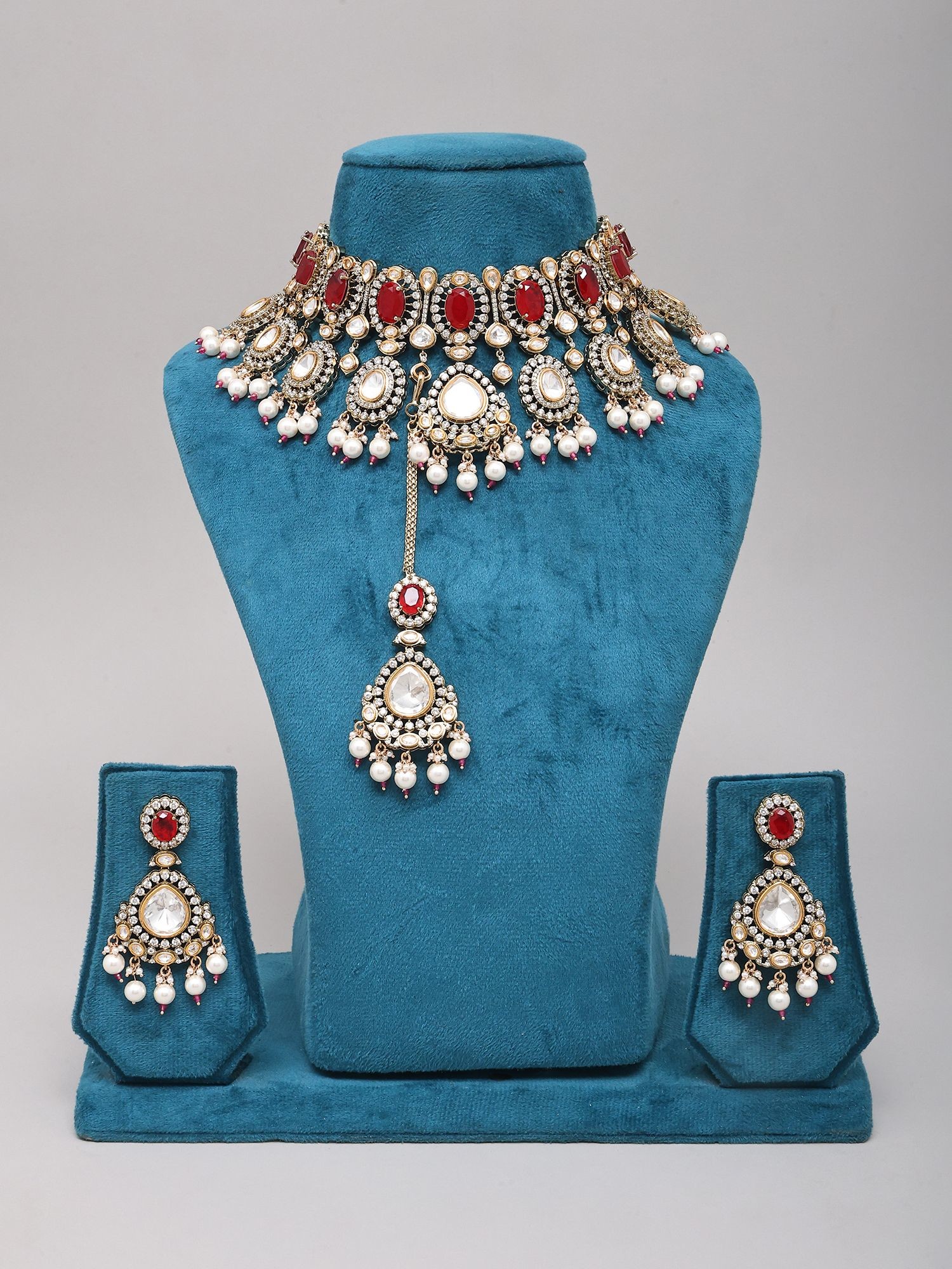 Statement Red Polki Choker Set with Pearl Dangles and Maang Tikka