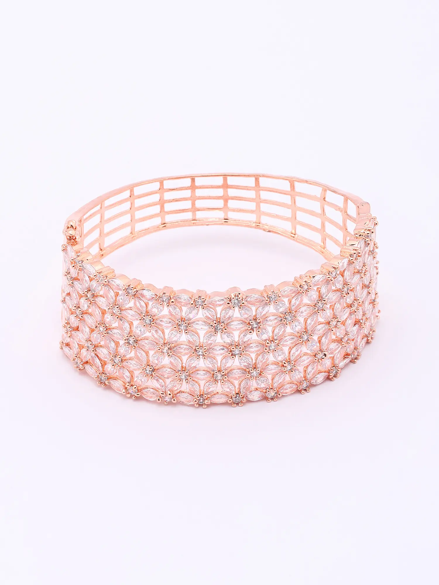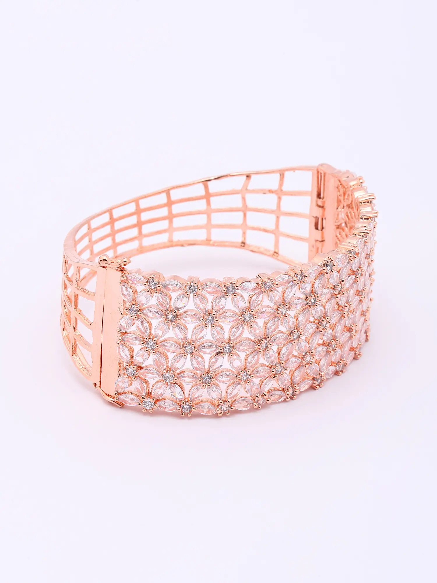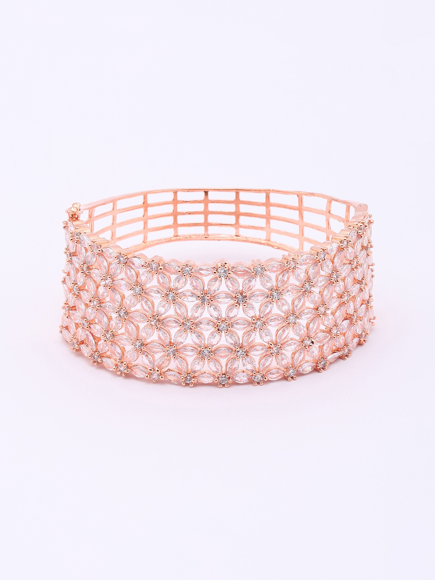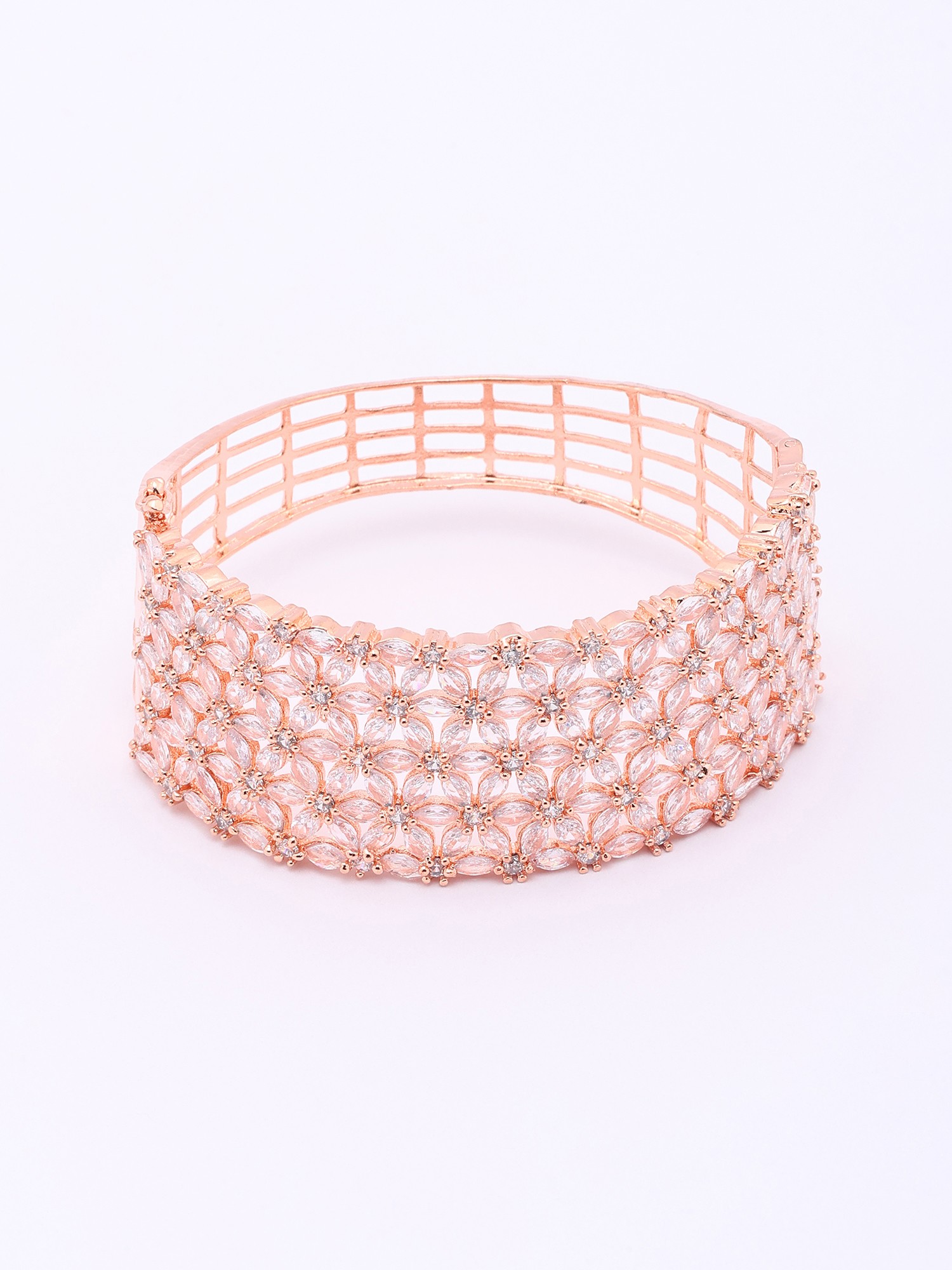 Each detail of this exquisite cuff speaks of an unwavering commitment to artistry. Its foundation is laid with a lustrous rose gold finish, meticulously applied to bestow a warm, sophisticated glow. Encircling this are countless delicately placed American diamonds, chosen for their exceptional brilliance and clarity. The floral motifs are seamlessly integrated, showcasing a remarkable level of precision in their setting.