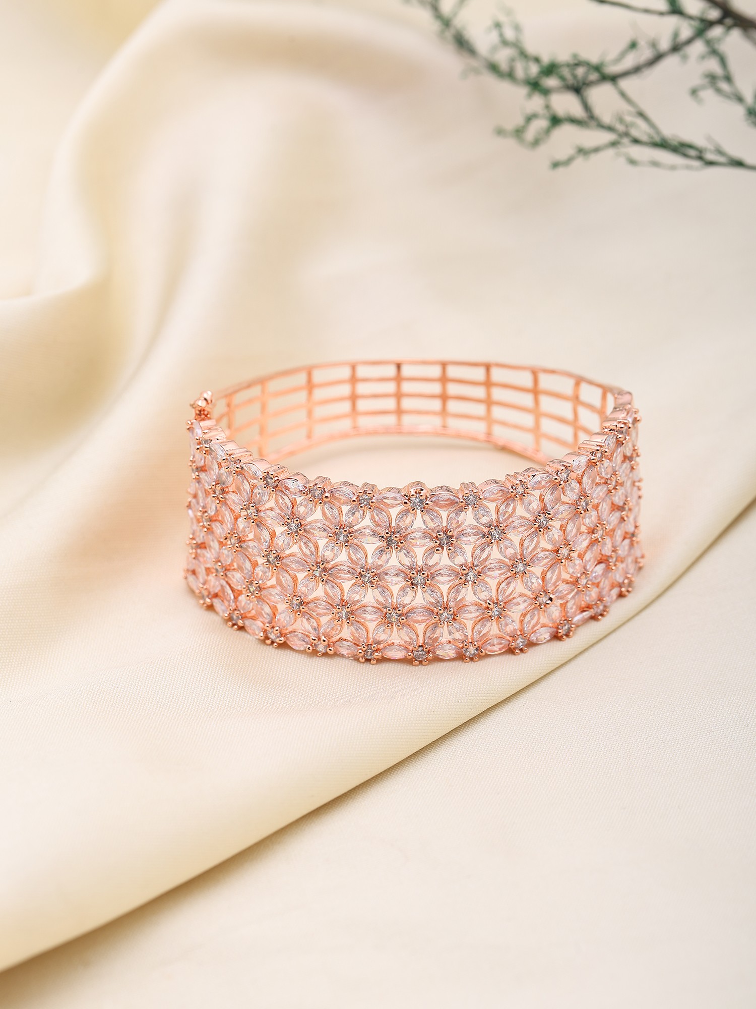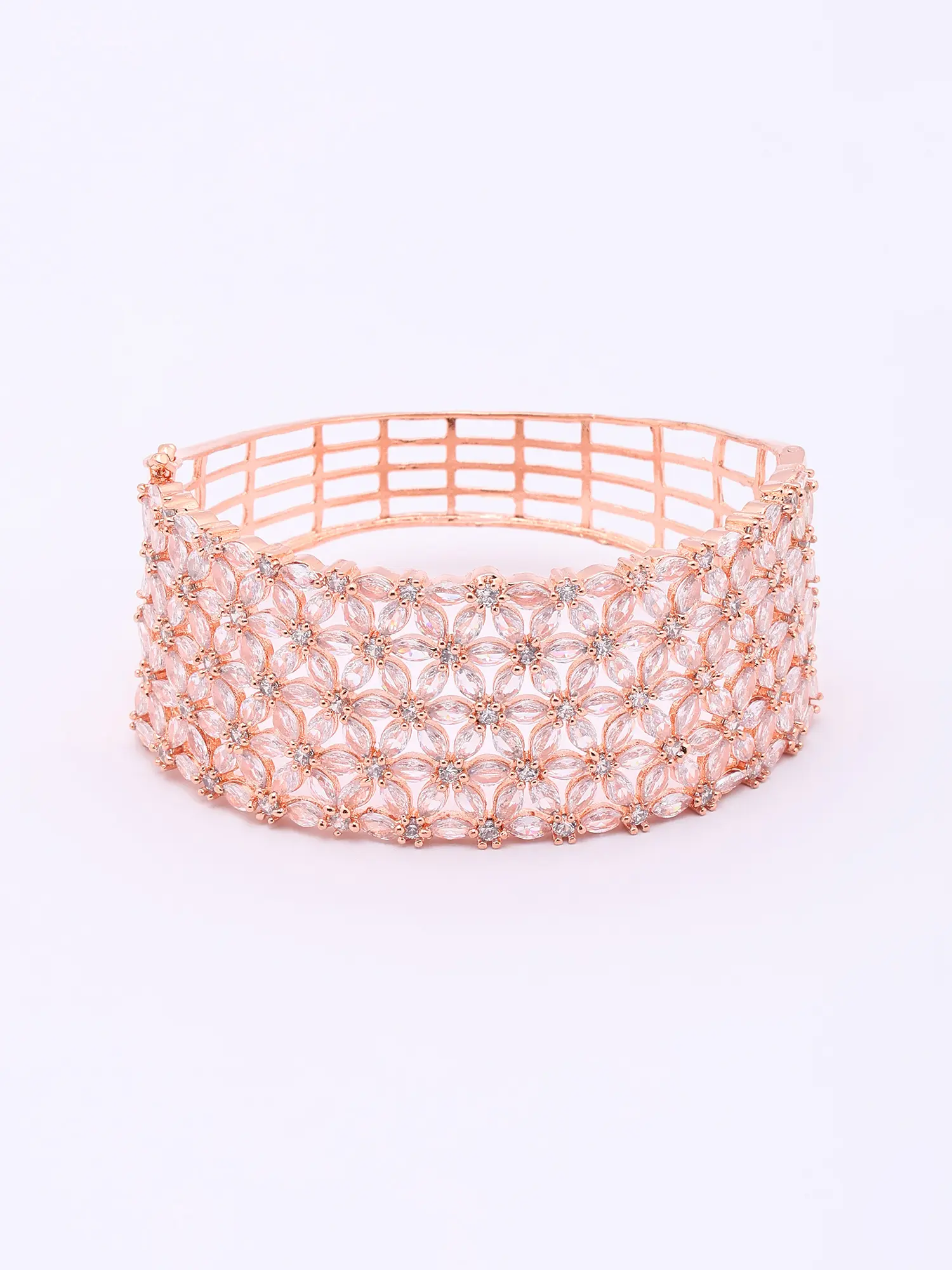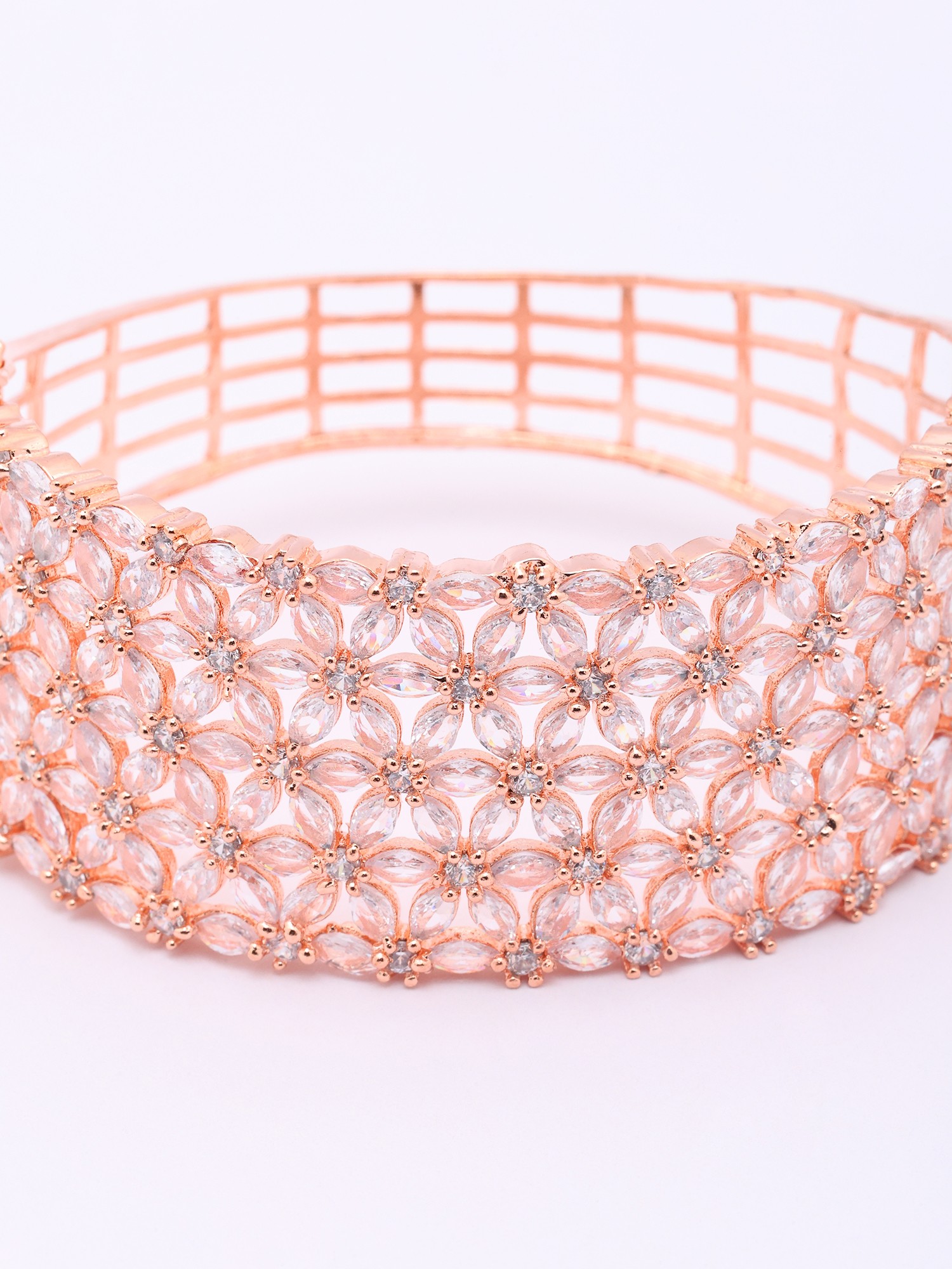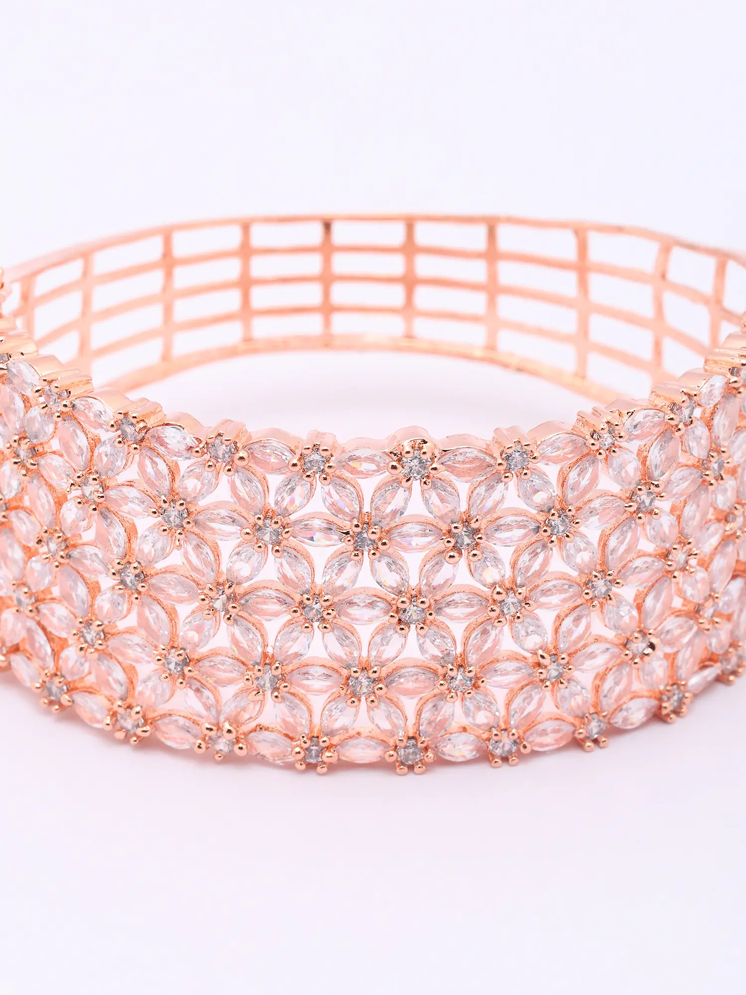 Each detail of this exquisite cuff speaks of an unwavering commitment to artistry. Its foundation is laid with a lustrous rose gold finish, meticulously applied to bestow a warm, sophisticated glow. Encircling this are countless delicately placed American diamonds, chosen for their exceptional brilliance and clarity. The floral motifs are seamlessly integrated, showcasing a remarkable level of precision in their setting.