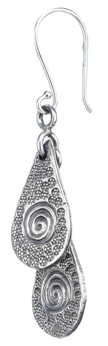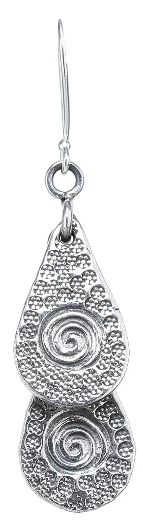 Each earring features two gracefully suspended teardrop shapes, intricately detailed to capture the light and intrigue the eye. The surface of each teardrop is adorned with a mesmerizing spiral motif, reminiscent of a coiled serpent or the natural progression of growth. This central spiral is encircled by a delicate pattern of tiny, raised dots, creating a captivating textural contrast that adds a tactile dimension to the piece. The meticulous craftsmanship ensures that every curve and detail is sharply defined, showcasing the inherent beauty of the sterling silver.