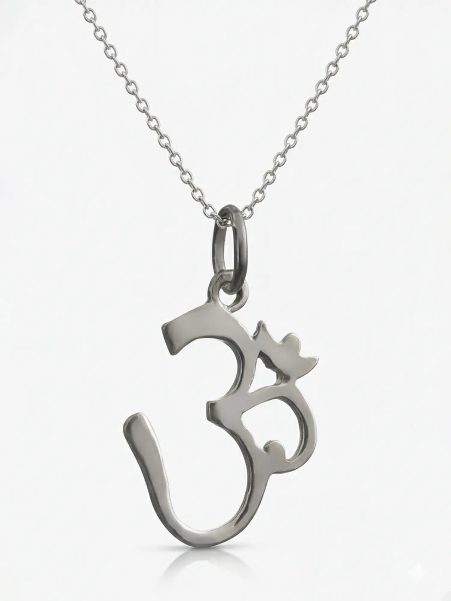 This pendant is a finely wrought piece of sterling silver, fashioned into the shape of the sacred syllable "Om," also represented as "AUM," which holds deep significance within Hinduism and other Dharmic religions. The symbol "Om" is first referenced in the ancient Upanishads, texts of high spiritual importance in Hindu philosophy, where it is associated with a myriad of profound concepts.